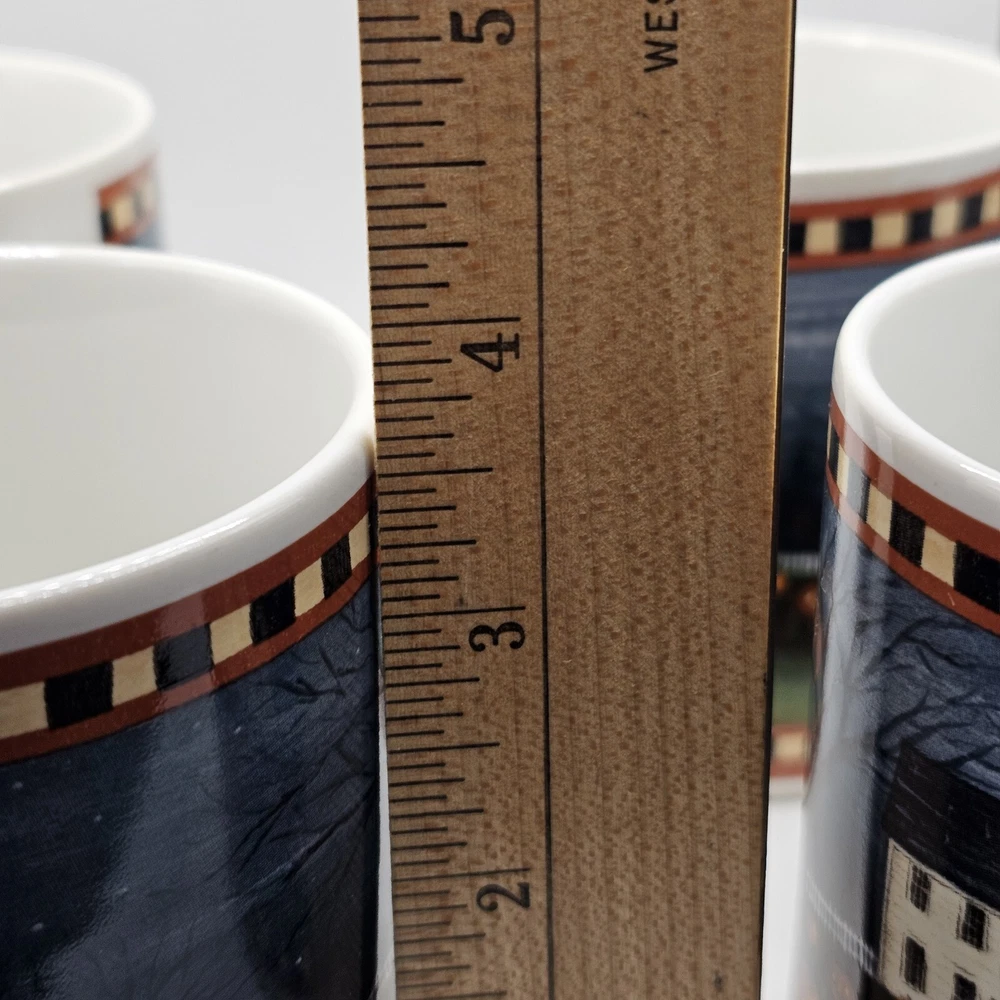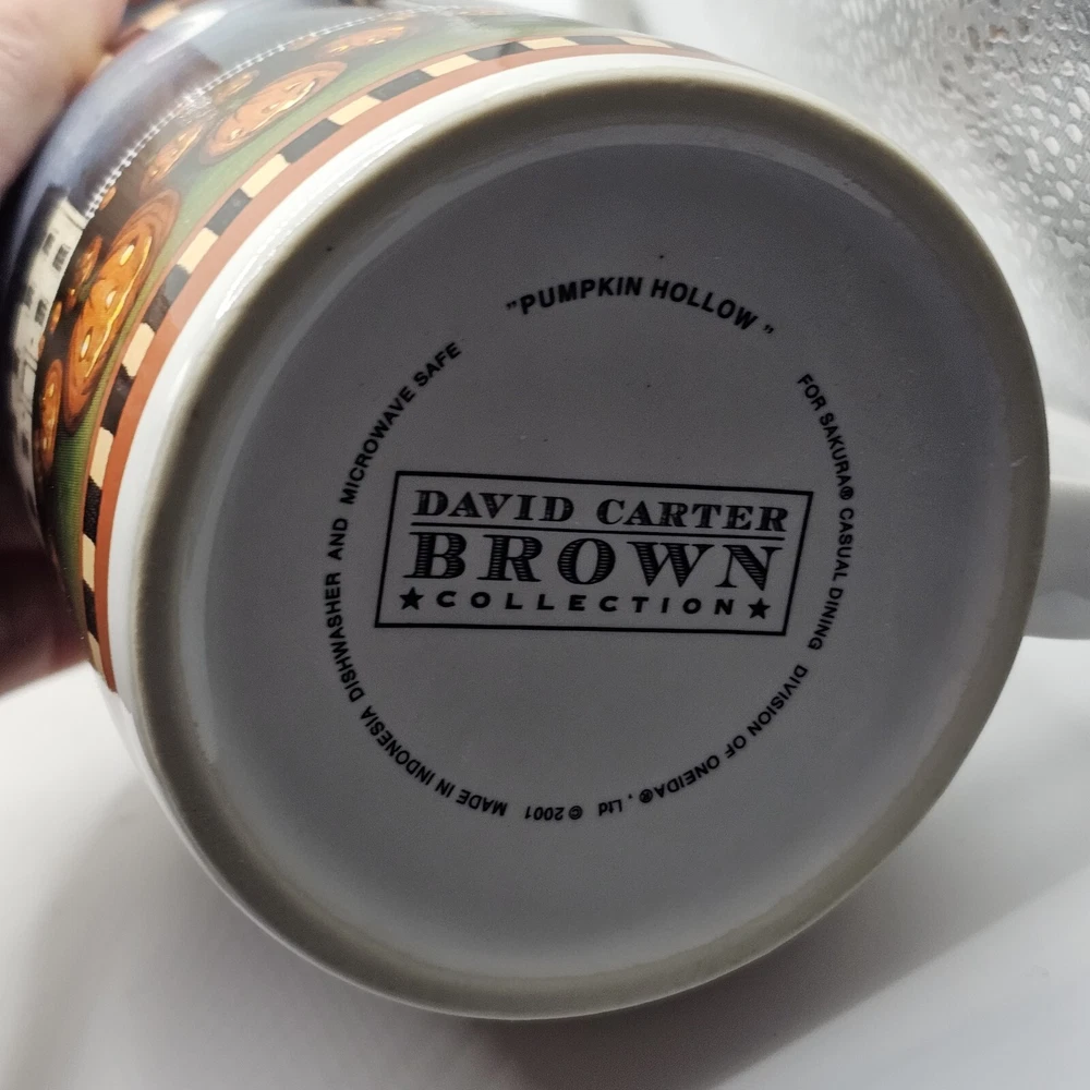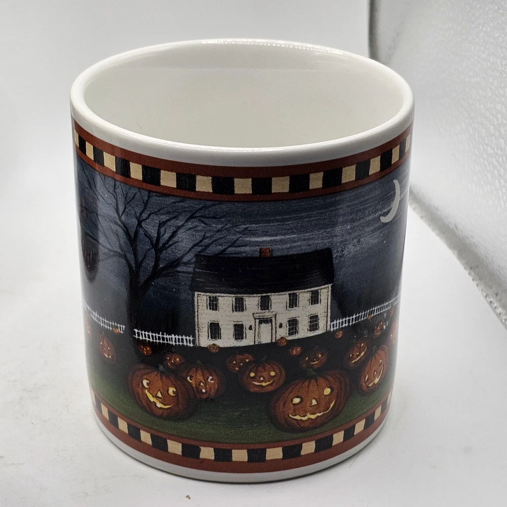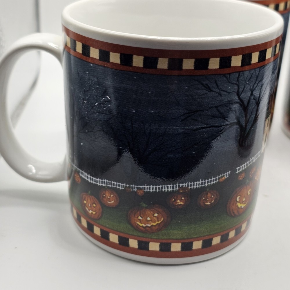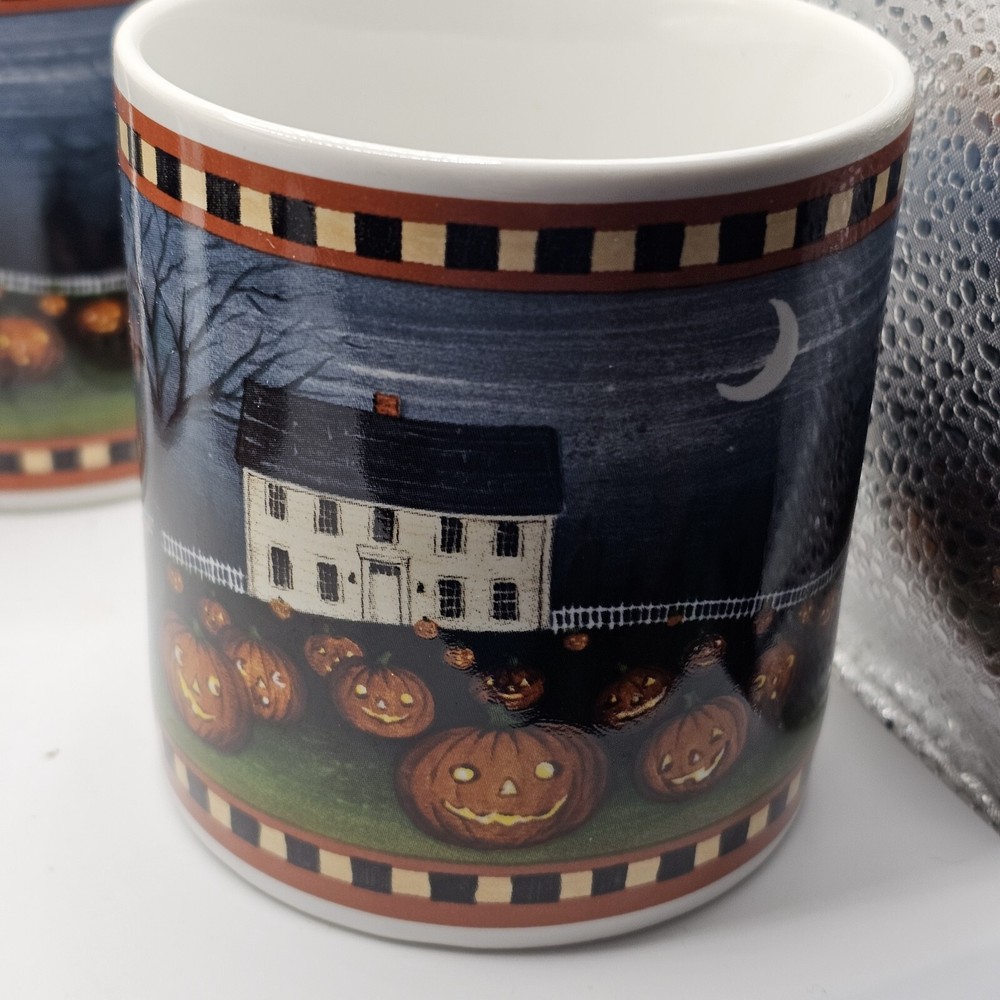 This set of four ceramic and porcelain coffee mugs features a spooky pumpkin pattern in multicolor. The round mugs are part of the David Carter Brown Collection and were manufactured in 2001 by Sakura. They are perfect for Halloween and can hold hot or cold beverages. The mugs are microwave and dishwasher safe, making them convenient for everyday use. The vintage style adds a touch of country to your kitchen or dinnerware collection. The set includes a cup and is suitable for unisex adults. The mugs are not personalized and are an original reproduction of the Pumpkin Hollow design.