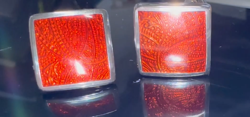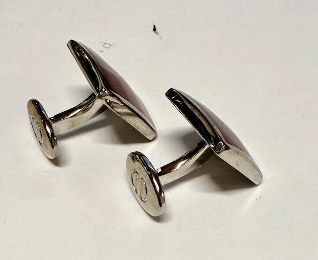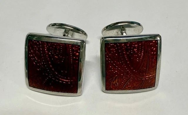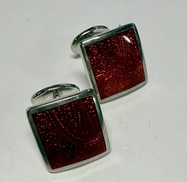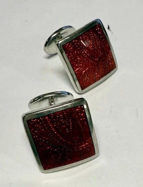 These David Donahue Cufflinks are elegant pieces made of 925 sterling silver featuring a square design shape. The Center of the Cufflinks are Enamel - we believe Guilloche Enamel, with a unique paisley pattern in a beautiful Orange-Rust Color. The cufflinks are suitable for various occasions including engagements, weddings, anniversaries, birthdays, and more. With Christmas and The Holidays just weeks away- they make a great gift or present for yourself. These marked DD Cufflinks are a stylish accessory for men and are signed by the brand, David Donahue, making them a thoughtful and sophisticated gift option. They are in very good condition even though pre-owned. Normal Wear. No Abuse. These cufflinks are a timeless and classy addition to any man's jewelry collection. The color of the enamel changes with more or less light. Please see all photos. 18.7 g, approx 5/8" square. The cufflinks come in a free gift box (not the original box). Local Collection is available in Boca Raton, Florida. Free USA Shipping.