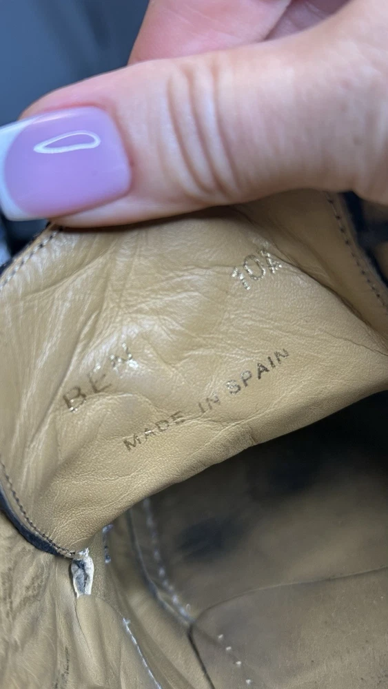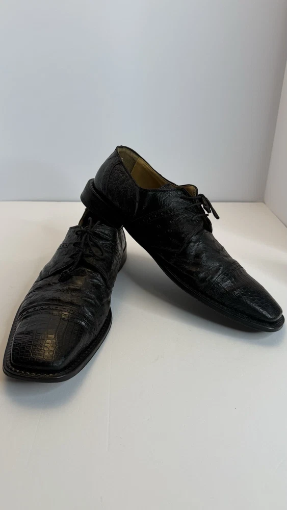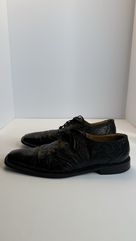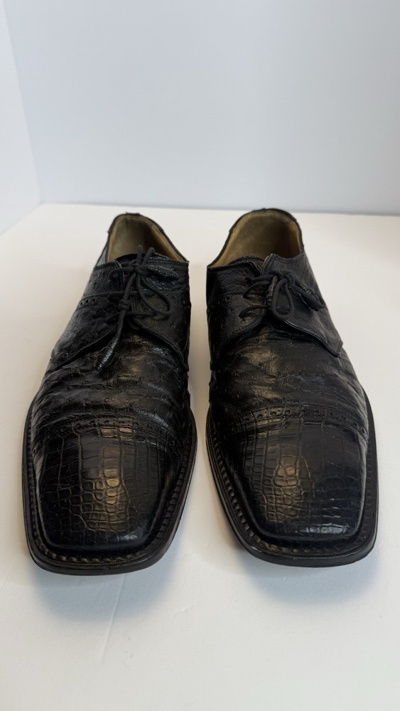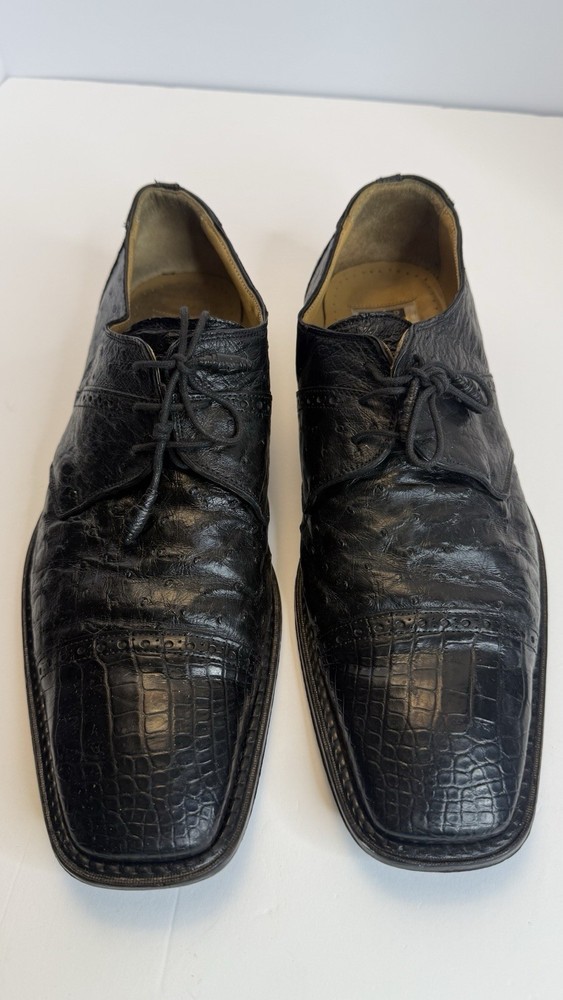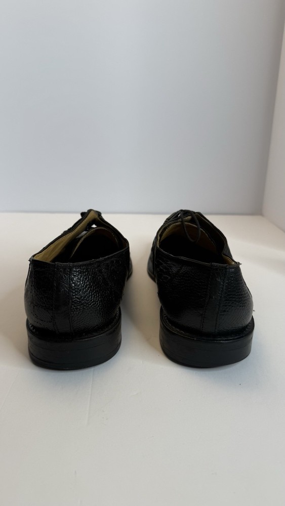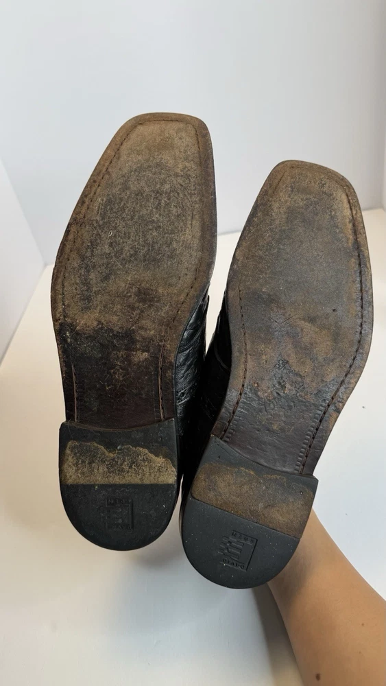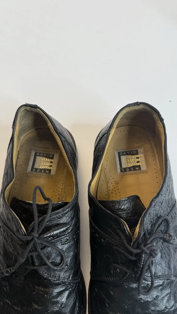 Vintage David Eden men’s dress shoes, made in Spain, size 10.5 US. • Exotic leather upper (ostrich/croc embossed style) • Black color, lace-up design • Leather sole, classic square toe • Pre-owned, with visible wear on soles and minor creasing (see photos), but overall in solid condition. • High-quality craftsmanship, stylish and rare find. Perfect for collectors of luxury or exotic leather shoes. Measurements: • Size: 10.5 US Condition: Used, with wear on soles, but upper leather remains strong. Please review photos for exact details.