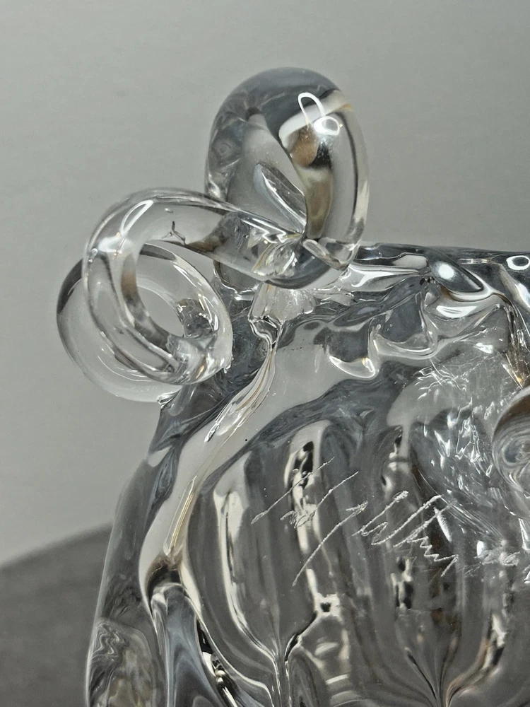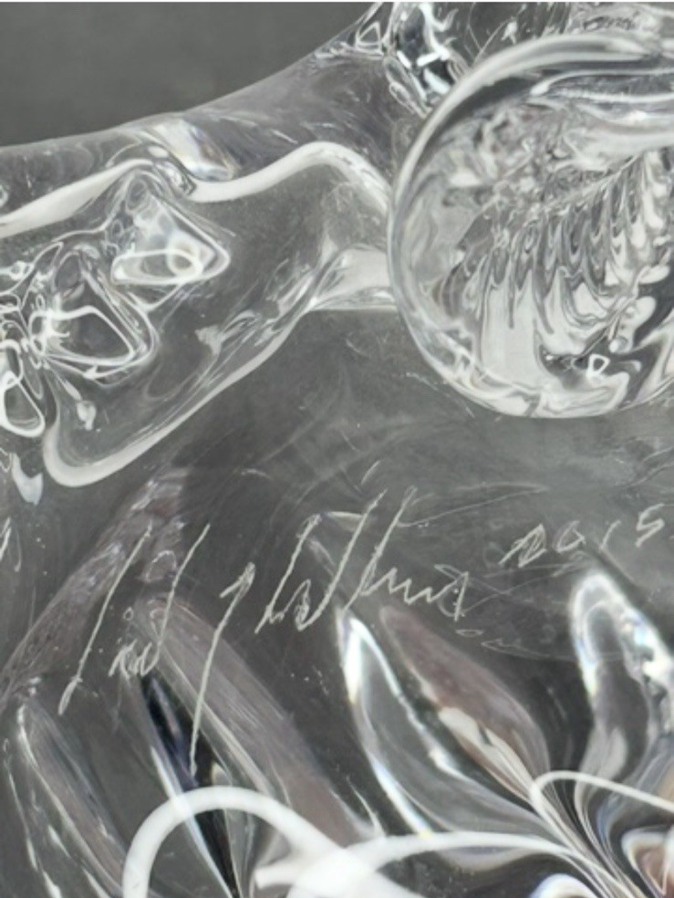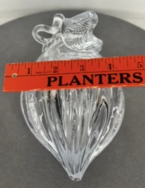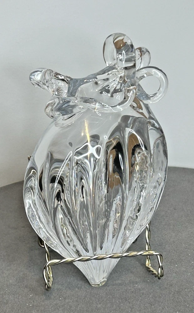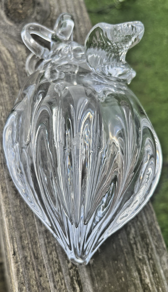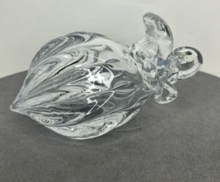 The David Goldhagen Studio Art Glass Signed Acorn Sculpture is a hand-blown glass figurine featuring a large clear glass acorn shape. Signed by the artist, David Goldhagen, this original piece showcases intricate craftsmanship and a unique design, making it a standout decorative item for any space. Handmade with precision and detail, this sculpture adds a touch of elegance and artistry to any collection. This beautiful sculpture measures approximately 6.5" inches in length, about 5" inches in height, 4" inches wide and weighs over 2 pounds. David Goldhagen Studio Art Glass Signed Acorn Sculpture is in excellent pre-owned condition, with NO chips, cracks, scratches or repairs. Please review all pictures for proper assessment of its excellent pre-owned condition.