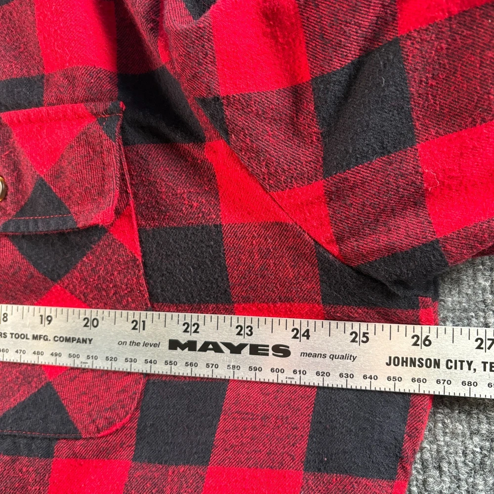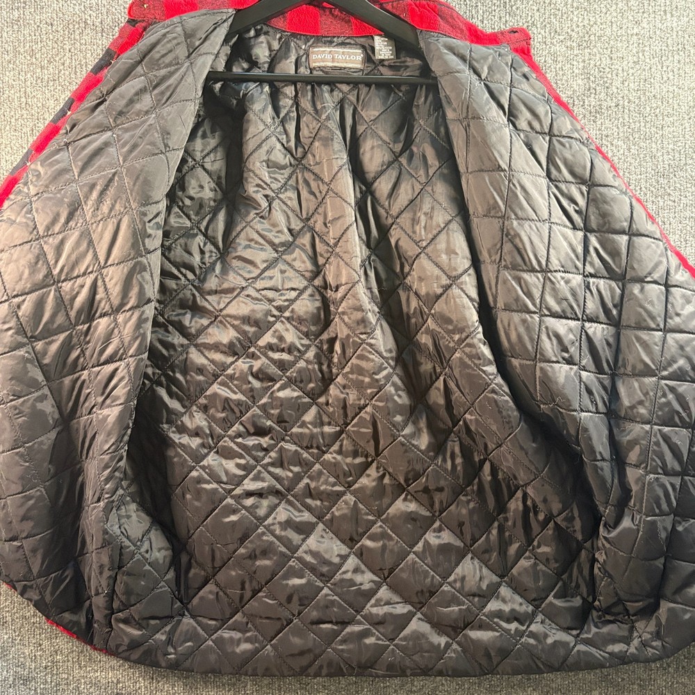 The David Taylor Flannel Shirt Jacket in size Large is a versatile and stylish addition to any man's wardrobe. This red plaid jacket features a quilt-lined nylon lining for added warmth, making it perfect for outdoor activities in the winter, fall, or spring. The relaxed fit and button closure give it a comfortable and casual look, while the polyester insulation ensures you stay cozy. Whether you're walking, hunting, or hiking, this overcoat is sure to keep you stylish and protected from the elements. Measurements: Pit to Pit - 26.25" Shoulder to Hem - 30.5" Please compare the measurements to your favorite garments to ensure a good fit. All items have been cleaned. Smoke free & pet free home. Same business day handling on orders before 12:00pm (noon) EST. New items listed daily.