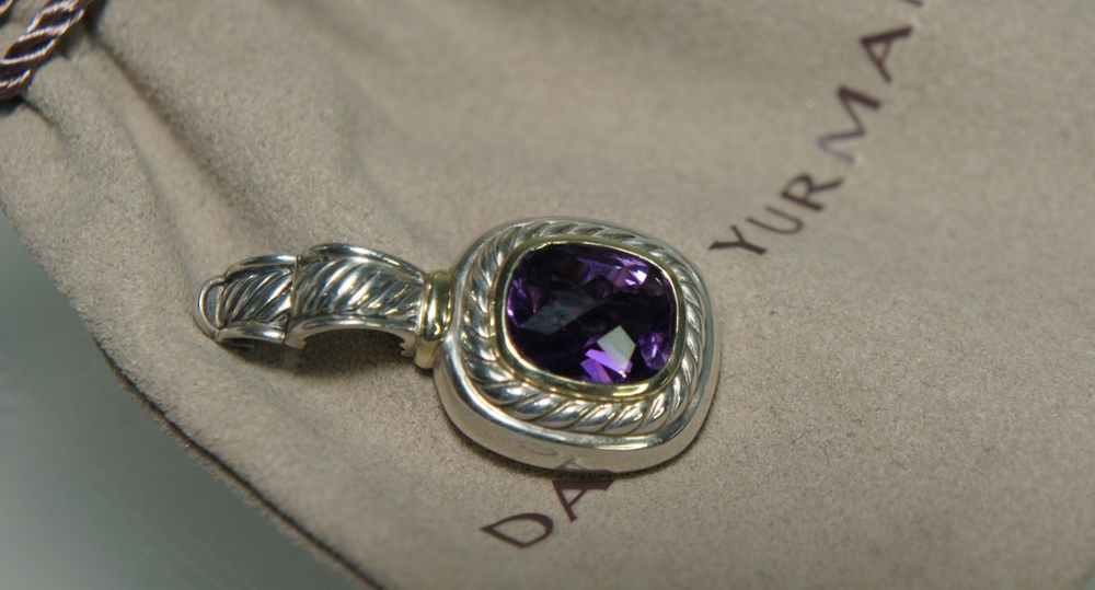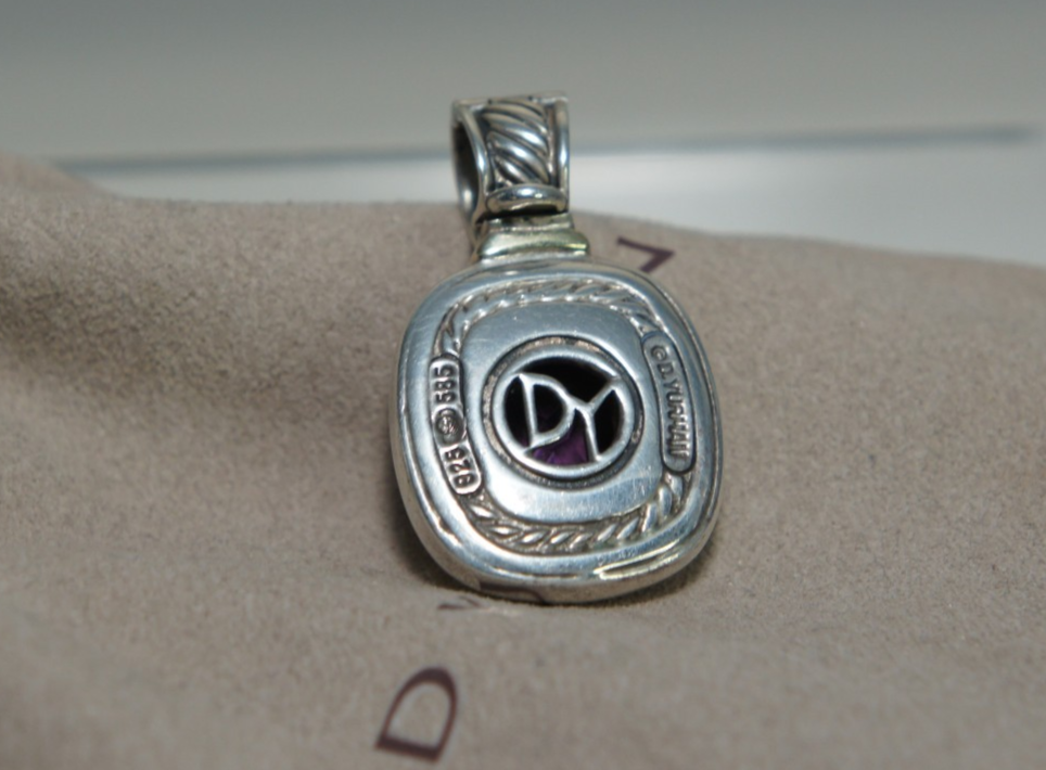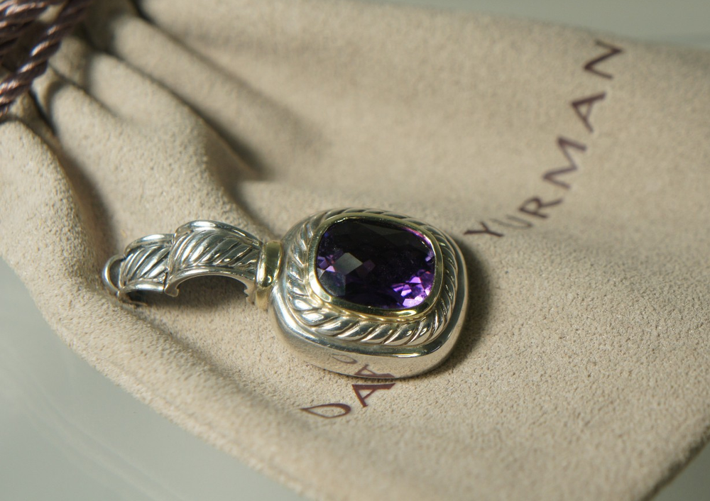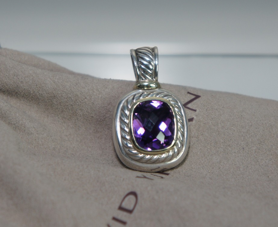David Yurman Classic Albion Enhance/Pendant 925 Silver and 585 Gold The amethyst measures 12mm x 9mm approximately. The bale will fit up to a 4mm chain. No original packaging, will come with a NEW DY Pouch. FREE domestic shipping International shipping through ebay shipping ONLY All of my jewelry listings were purchased pre owned. I am listing them as they were represented to me, when I purchased/received them. I am NOT an expert, nor do I represent the maker of the jewelry. I am capable of making an honest mistake. IF for ANY reason you are not 100% satisified with your purchase, I will send you a pre paid return label, and refund your payment in full through PayPal. Please contact me right away with any concerns. I appreciate the courtesy of YOU giving me the opportunity to resolve the problem BEFORE leaving negative feedback. Leaving poor feedback does not resolve anything. Please email any questions, you will receive an answer promptly! Customer service and satisfaction is my #1 Priority!
