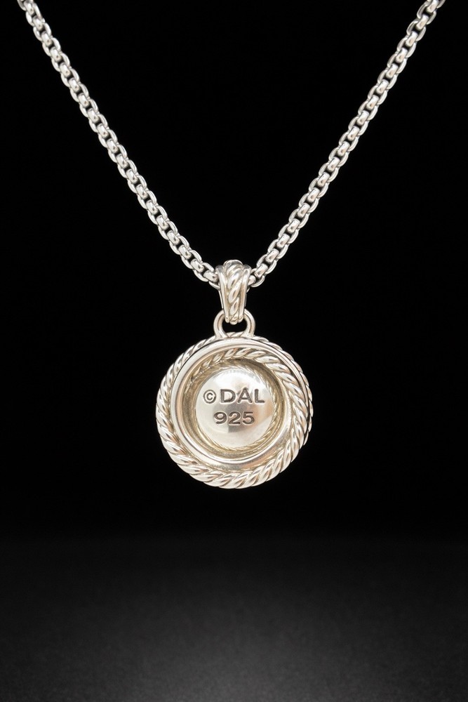 Elevate your jewelry collection with this authentic David Yurman crossover pendant, masterfully crafted in sterling silver and accented with refined diamond detailing. The elegant crossover silhouette is centered with a luminous freshwater pearl, creating a timeless balance of classic sophistication and modern design. Pavé-set diamonds add a subtle, refined sparkle, enhancing the pendant’s graceful contours without overpowering its understated beauty. Whether worn as an everyday signature piece or reserved for special occasions, this pendant embodies the impeccable craftsmanship and iconic style David Yurman is known for. Details: • Designer: David Yurman • Metal: Sterling Silver (925) • Pearl: Freshwater Pearl, approx. 8mm • Diamond Accents: Pavé Diamonds, approx. 0.079 ct total weight • Pendant Size: Approx. 1.25” L (including bail) x 0.75” W • Markings: Stamped D.Y. 925 • Condition: Pre-owned, Excellent Condition • Authenticity: Guaranteed 100% Authentic A refined, versatile piece that transitions effortlessly from day to evening — perfect for gifting or adding a touch of luxury to your own collection.