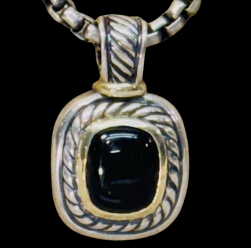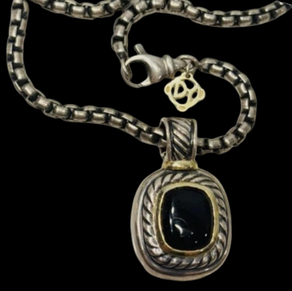 Elegant and timeless, this authentic David Yurman necklace features the brand’s iconic cable design in sterling silver, paired with a striking black onyx pendant. The square cushion-shaped pendant is framed with Yurman’s signature twisted cable detailing, creating a bold yet sophisticated look. The rich black onyx centerpiece adds depth and contrast, making this piece perfect for both everyday wear and evening styling. The lobster clasp closure ensures secure wear, while the classic design makes it a versatile addition to any fine jewelry collection. A refined statement piece that embodies modern luxury and enduring craftsmanship. Details • Designer: David Yurman • Metal: Sterling Silver / 14K Gold • Stone: Black Onyx • Signature cable design • Lobster clasp closure • Weight 37 grams • Necklace Length: 16" • Pendant: 1.25" x 0.75" • Timeless, versatile style • MSRP $1,150 Keywords David Yurman necklace, David Yurman cable necklace, David Yurman onyx pendant, sterling silver designer necklace, black onyx pendant necklace, luxury silver jewelry, designer jewelry women, Yurman cable pendant, authentic David Yurman, fine jewelry gift, statement silver necklace