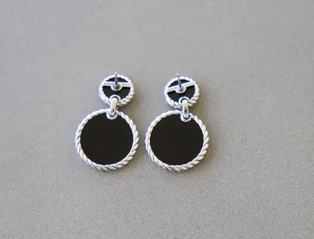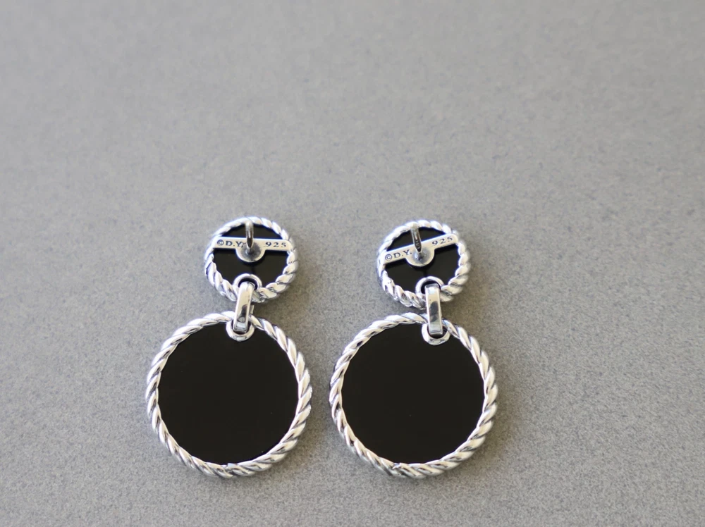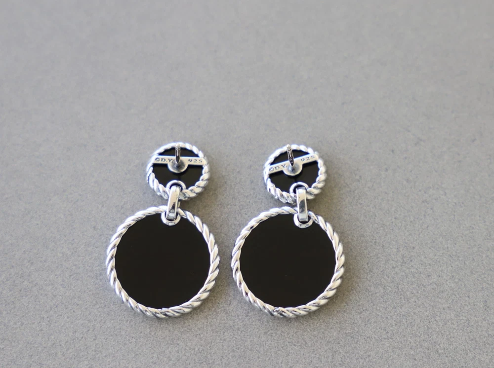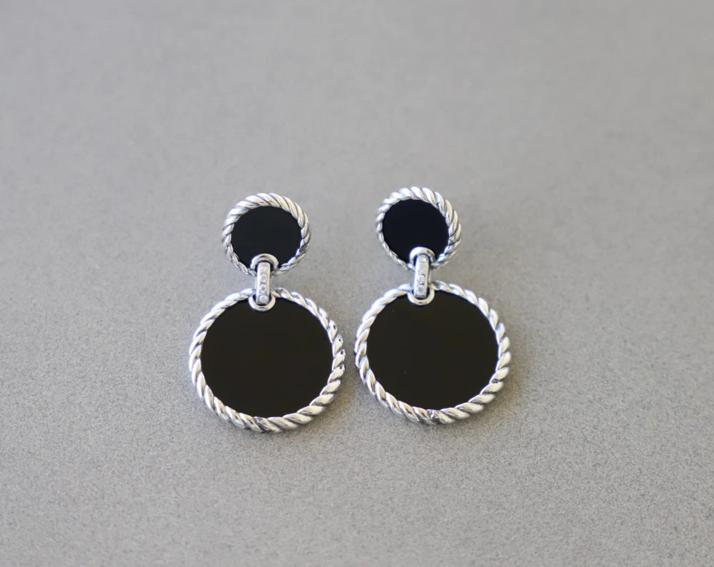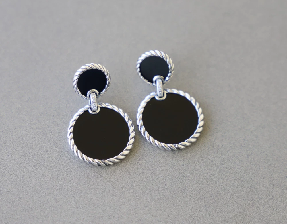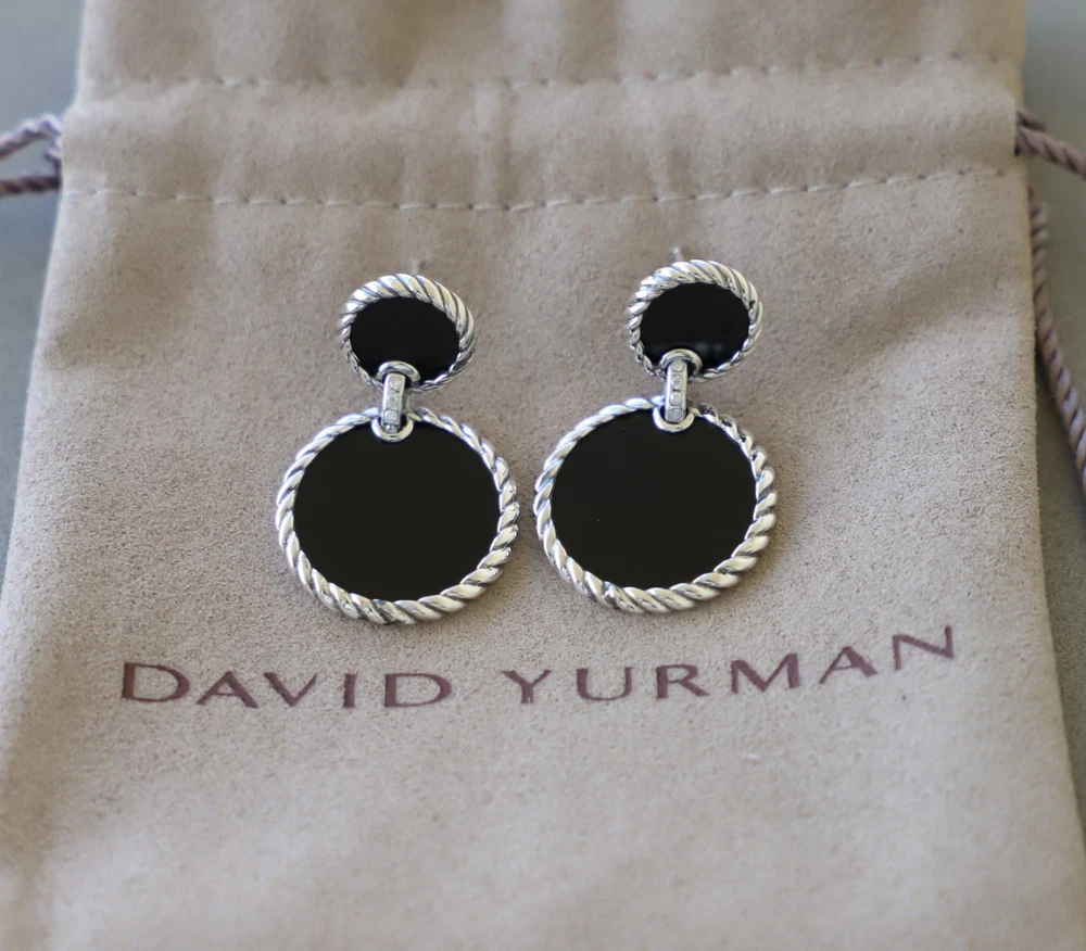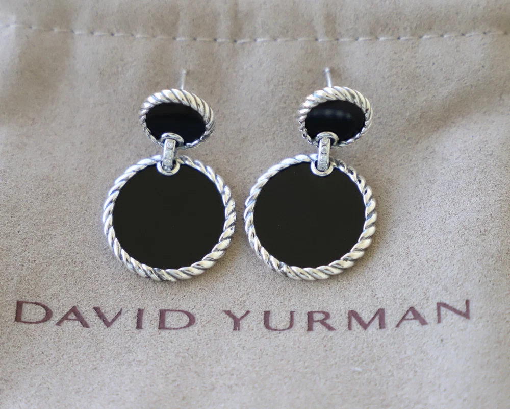David Yurman Sterling Silver Elements Double Drop Earrings Black Onyx & Diamonds Condition: Pre-owned/Excellent with no major flaws or blemishes Earring drop length: 33mm Included: Original box and dust pouch 100% Authentic or your money back Shipping: FREE UPS Ground shipping w/ tracking number $15 via UPS 2nd Day Air w/ tracking number $40 via UPS Next Day Air w/ tracking number Please asks any questions you may have and we will gladly answer Thanks for looking!
