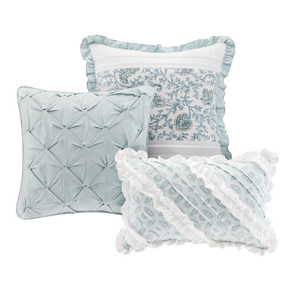 PRODUCT FEATURES- A mixture of soft blue, periwinkle, and hints of green are printed in a paisley design alongside pintucked blue fabric that is separated by lace taping. This duvet set has shabby chic and ruched pattern. SUPERIOR QUALITY FABRIC- 100% Cotton sateen front and cotton pecale reverse to offer 100% natural soft hand feel PACKAGE AND MEASUREMENTS- 1 Duvet Cover:90x90", 2 Shams:20x26 + 2" (2), 3 Decorative Pillows:16x16"/12x18"/18x18" , 2 Euro Shams:26x26" (2) , 1 Bed Skirt:60x80 + 15" YOU CAN SEE AND FEEL LUXURY : Create a welcoming environment and a restful feeling in the bedroom with this top quality and affordable bedding Collection. You’ll find yourself getting a restful night of sleep with our 100% cotton duvet set EASY CARE- Machine wash cold, gentle cycle, and separately. Do not bleach. Tumble dry low, remove promptly. Do not iron. If there is no free movement in the washer or dryer, use large capacity commercial washer/dryer