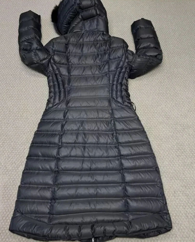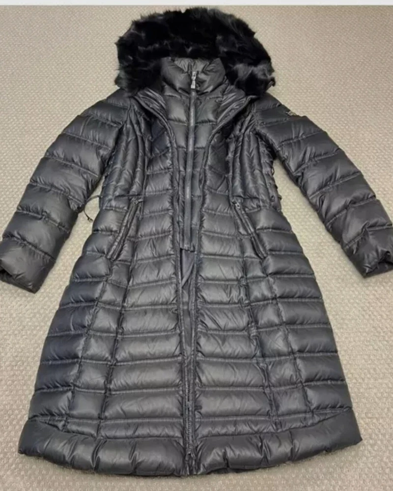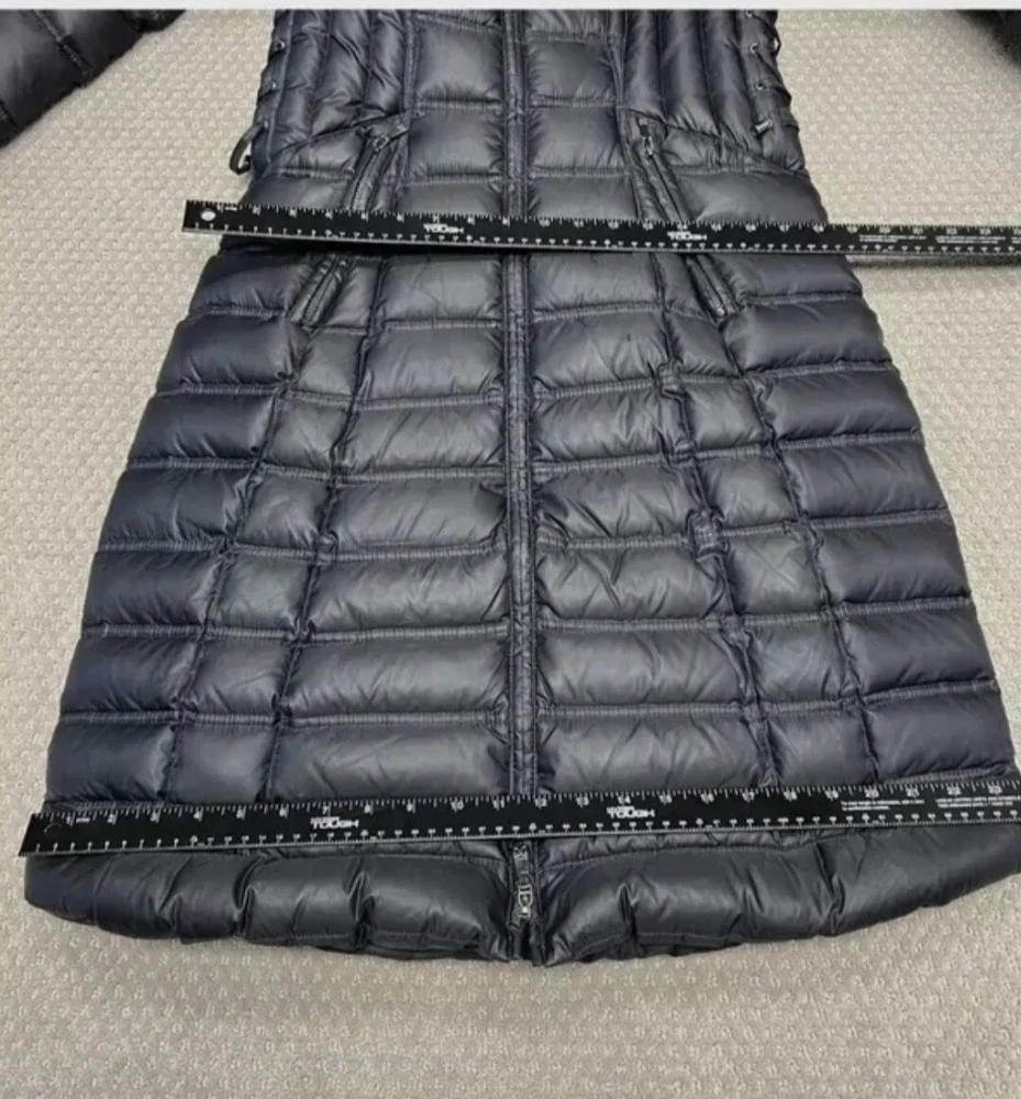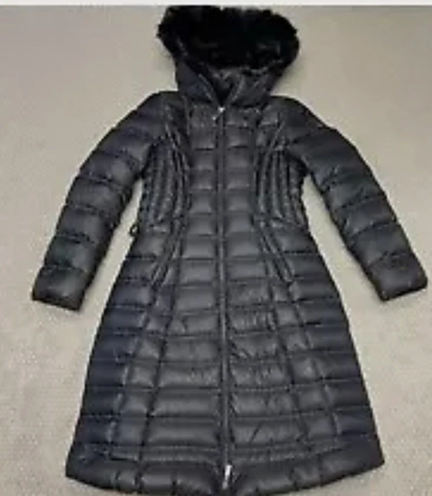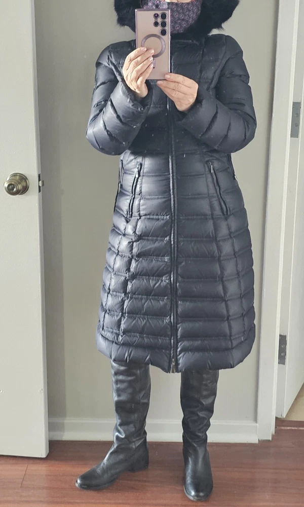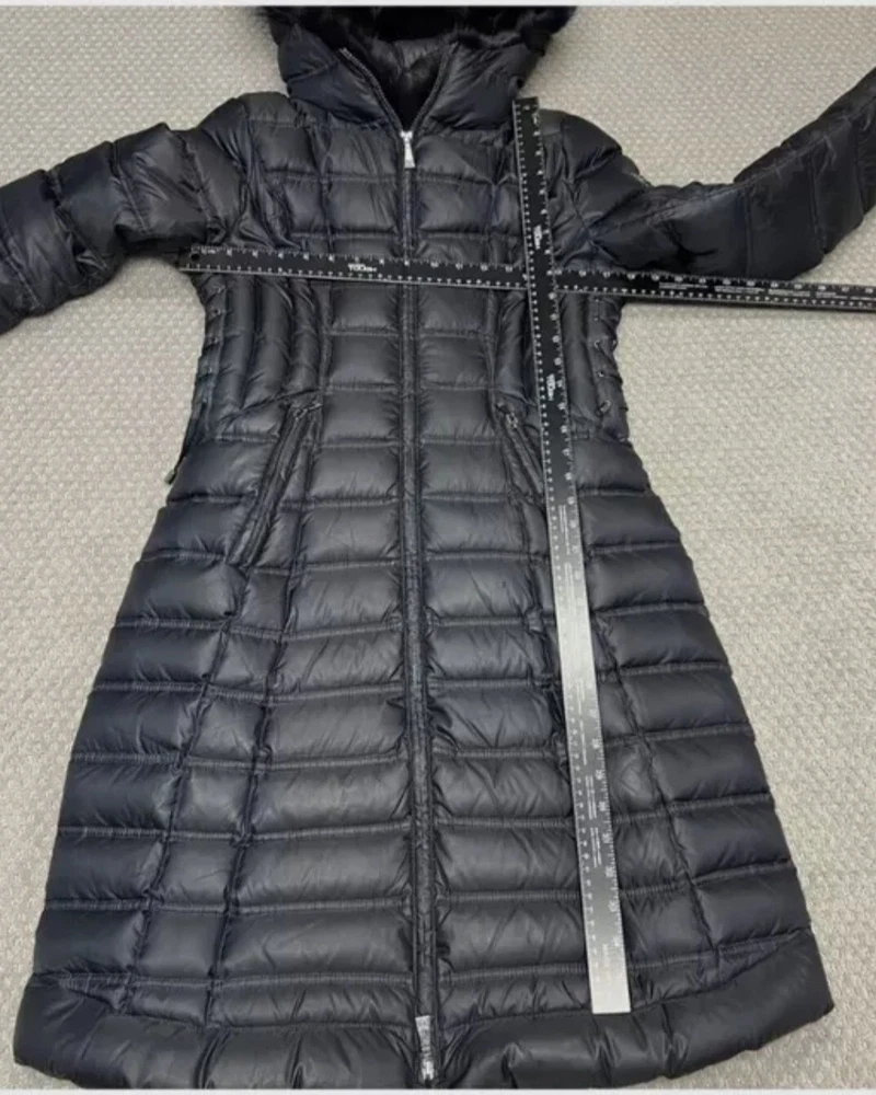 Embrace the chill with this Dawn Levy long down puffer coat, designed to keep you cozy and stylish. A quintessential piece for the fashion-forward woman, this coat features a luxurious down insulation, ensuring warmth and comfort during the colder months. The sleek black polyester outer shell offers durability and a timeless look, making it a versatile addition to any wardrobe.Tailored to fit a regular size small, the coat's long length provides ample coverage and a quilted style that adds a touch of elegance. Whether you're out on a brisk evening stroll or running errands, this coat will shield you from the elements while enhancing your outfit with its classic design.