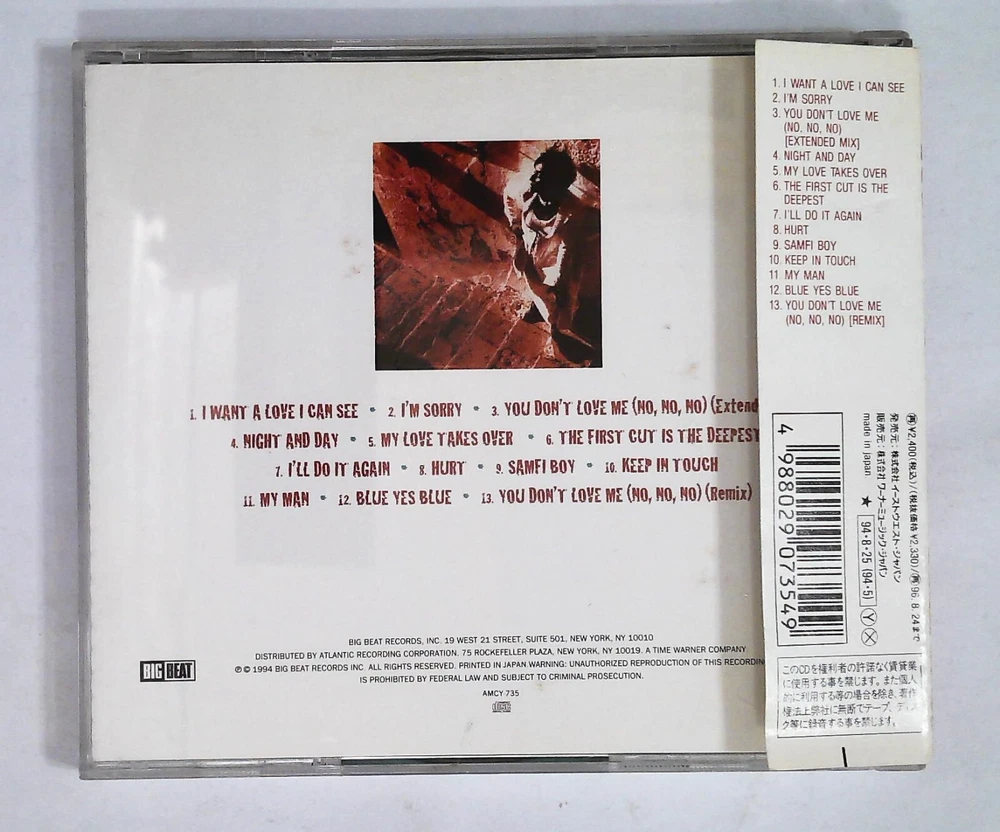 1 I Want A Love I Can See 3:54 2 I'm Sorry 4:10 3 You Don't Love Me (No, No, No) (Extended Mix) 4:37 4 Night And Day 4:55 5 My Love Takes Over 3:57 6 The First Cut Is The Deepest 4:27 7 I'll Do It Again 4:05 8 Hurt 3:57 9 Samfi Boy 5:09 10 Keep In Touch 4:30 11 My Man 3:58 12 Blue Yes Blue 4:52 13 You Don't Love Me (No, No, No) (Remix) 5:13