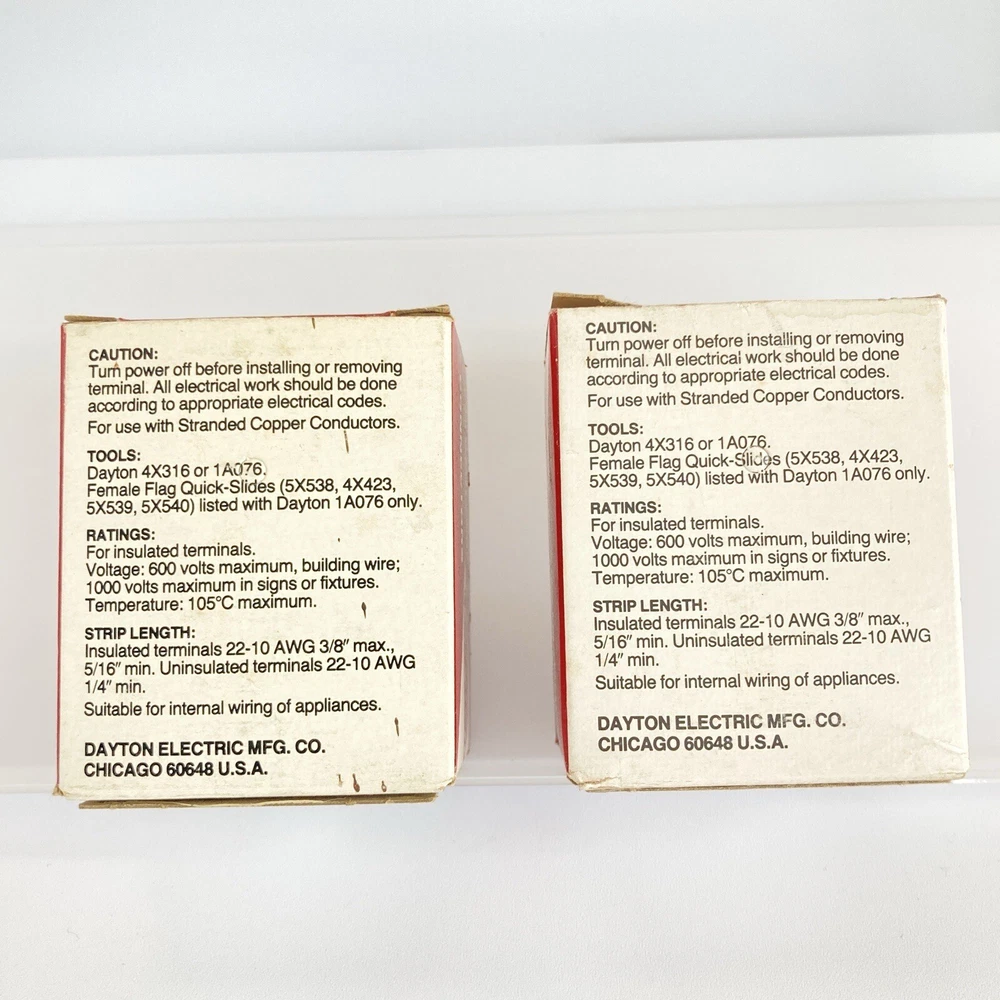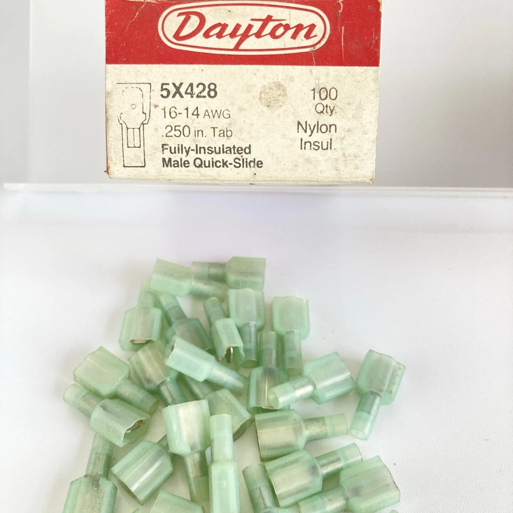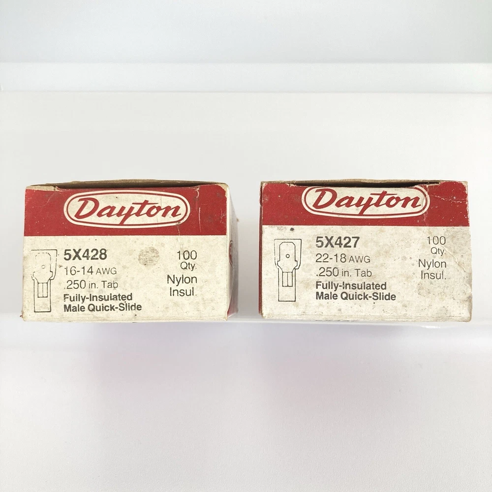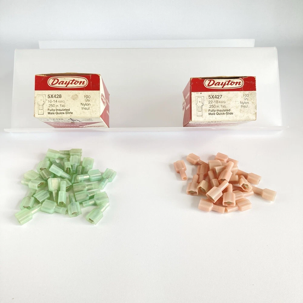 Country/Region of Manufacture: United States Power Source: Electric Finish: Matte Suitable For: Appliance Brand: Dayton Type: Terminal Connector Manufacturer Warranty: 0 months Compatible Model: 5X427 / 5X428 gtin13: Does not apply Set Includes: Terminal Connector Number of Items in Set: Qty 23 of 5X427 / Qty 26 5X428 Compatible Brand: Dayton MPN: 5X427 / 5X428 Installation: Appliances Features: Fully-Insulated, Quick-Slide Connect Terminals, Solderless Connectors Color: Blue / Red Material: Copper Capacity: N/A Model: 5X427 / 5X428 UPC: Does not apply Seller Notes: “Open box”
