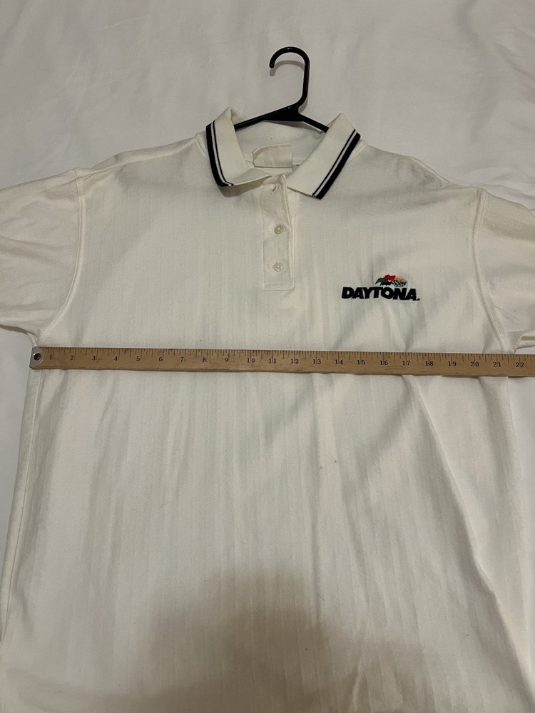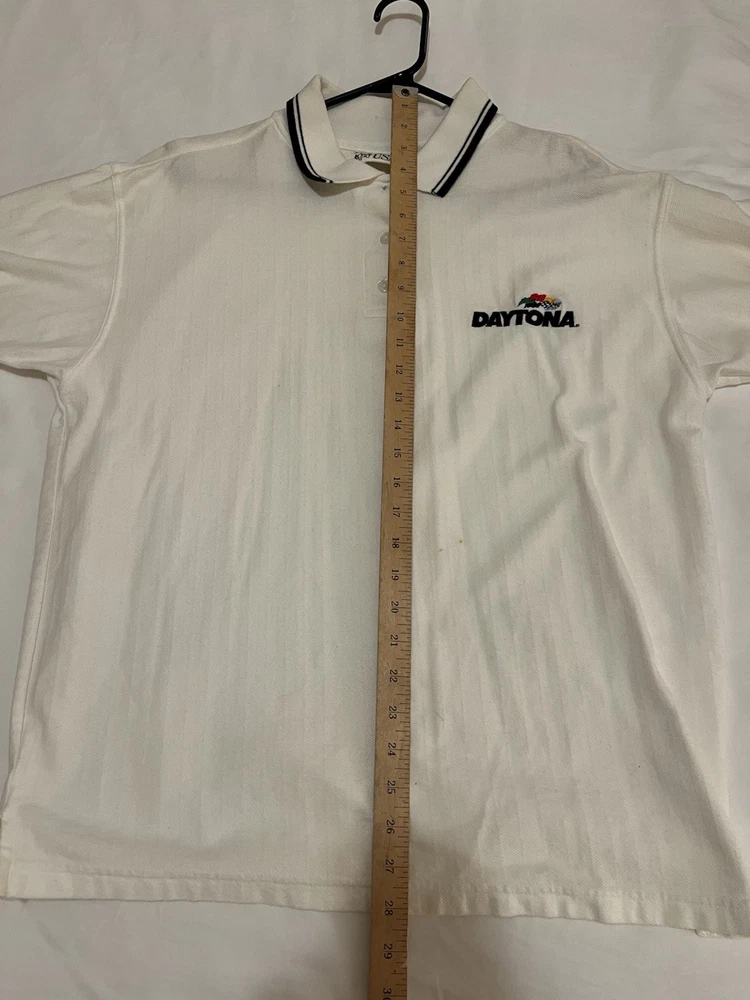 The tag indicates the shirt is an XXL. I believe the shirt is a women’s XXL but it fits like a men’s large. Crafted for comfort and style, this white Diport polo shirt is a timeless addition to any wardrobe. The shirt features a classic, collared neckline with a point collar style and short sleeves that make it ideal for both casual and semi-formal occasions. Its 100% cotton jersey fabric ensures breathability and ease of movement, while the moisture-wicking property keeps you dry throughout the day. With a nod to vintage appeal, this shirt showcases a light fabric wash that complements its nostalgic theme. The solid white color is versatile and easy to pair with a range of bottoms, and the regular fit ensures a relaxed, yet tailored look. Whether you're hitting the links or enjoying a day at the beach, this polo shirt is equipped to handle both leisure and activity with ease.
