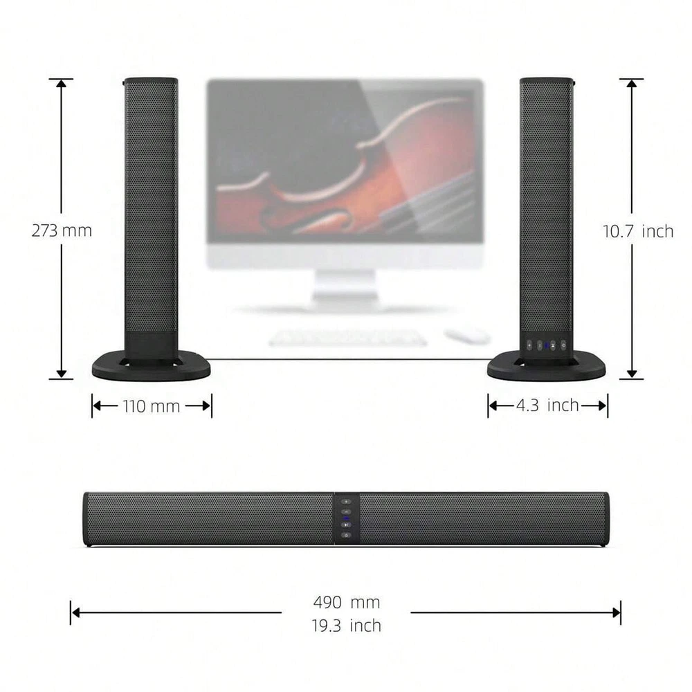 Feature: Innovative Detachable Design The detachable speaker design gives you the versatility in placing one speaker in a horizontal layout at the base of your TV or as two separate free standing vertical speakers. Louder and Crisper Enjoy a louder and crisper audio experience which your TV can't deliver. Wired or Wireless Connections Compatible with your TV, Phone, Laptop, Echo thanks to Bluetooth or wired connections that include 3.5mm audio cable, USB, RCA cable, also with TF card playing function. Flexibly Placing Fashion and portable design suits any home decoration. Bluetooth input and TF card input for savoring your stereo music good time everywhere. Easy to Control and Operate It features LED indicator light and sensitive button, much easier for users to operate. 4 Full Range High Quality Speaker Completes your home theatre system and brings the great bass, provides you a loud and clear surround audio experience in the bedroom and living room. Function: Use Bluetooth V5.0 version USB interface, U disk audio input function TF card audio input function 3.5mm audio input FM radio function Adopt Type-C charging port Can control the volume addition and subtraction Can control the song up and down Can control the pause and play of songs Connect to computer and TV Specification: Bluetooth version: 5.0 SNR: -80dB Output power: 5W x 4 Frequency response: 20Hz - 20KHz FM Frequency:87.5Hz-108Hz Transmission power: 1.49mW Transmission frequency: 2.48GHz Bluetooth distance: 8 - 10m Charging time: 2 - 3 hours Standby time: 120 hours Charging plug: TYPE-C Charging voltage: 5V/1A Bluetooth profiles supported: A2DP, AVRCP, HSP and HF Battery Capacity: 2000mAh (built-in) Package weight: 2.7lbs Product Size(L x W x H): 40 x 14.5 x 7cm Scope of Application: Smart Devices with Bluetooth, TVs, Computers, etc. Package List: 1 x Speaker 2 x Base 1 x USB Cable 1 x RCA Cable 1 x Audio Cable 1 x User Manual in English
