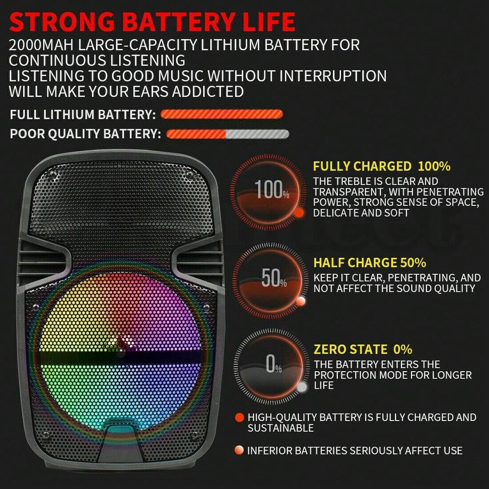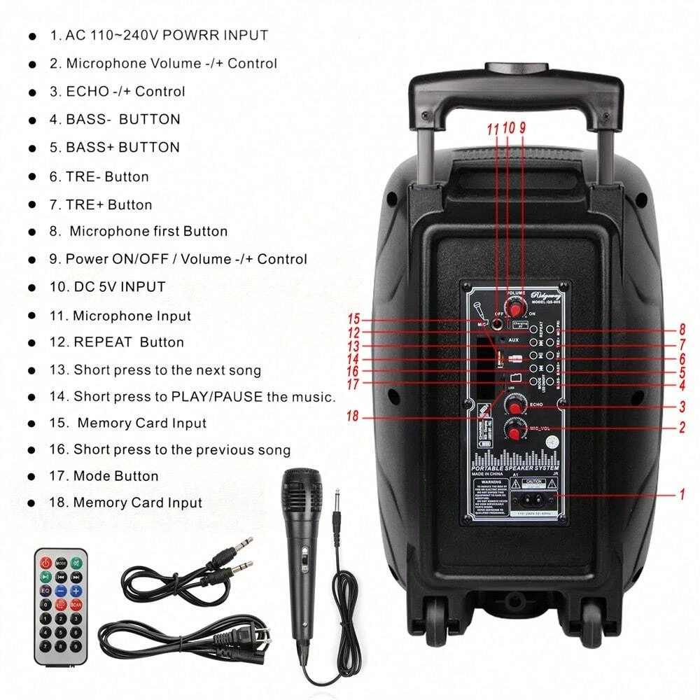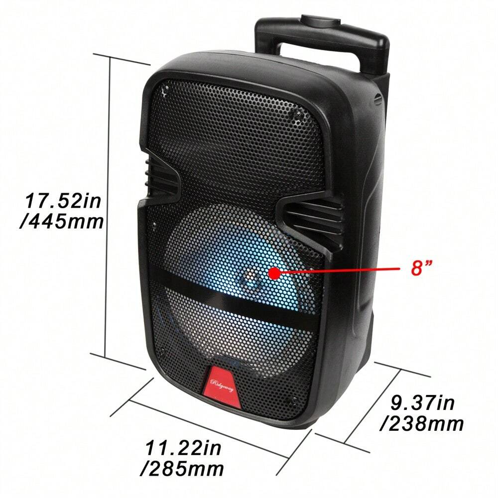 Features: Portable & High-Powered Speaker System Rugged & Compact Speaker Designed for Portability Bluetooth Wireless Music Streaming Ability Multi-Color Flashing LED Party Lights USB Flash Reader & Micro SD Card Reader Rear Panel Button Control Center Telescoping Handle & Rolling Caster Wheels Technical Specs: Sound System: 8'' FM Frequency: 87.5-108MHz S/N Ratio: ≥95dB SPL: 94dB (1W/M) T.H.D: ≤0.5% Power Supply: 110V-240V, 50-60Hz Rechargeable Battery: 2000mAh Charging Time: <4 hours Play Time: 2 hours BT Distance: 10m Audio Inputs: USB/TF/BT/FM/AUX Unit N.W.:3.15kg/ 6.94lbs Unit G.W.:3.45kg/ 7.6lbs Unit Size: 240*220*400mm(9.45*8.7*15.8inch) Gift Box Size: 285*235*455mm(11.22*9.25*17.91inch) Package Include: 1 X 8'' Speaker 1 X Charge Cable 1 X Microphone 1 X Rmote 1 X Manual