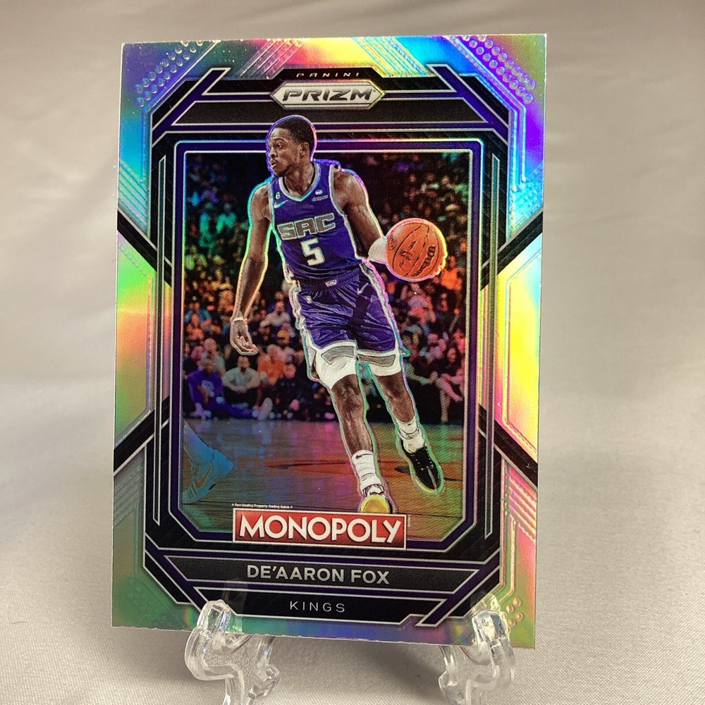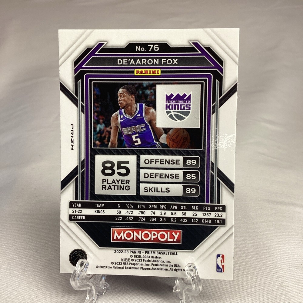 This is a 2022-23 Panini Prizm Monopoly trading card featuring De'Aaron Fox of the Sacramento Kings. The card is a Silver Prizm parallel variety, numbered 76 in the set. It is made of card stock and paper, with a thickness of 35 Pt. This original licensed reprint sports trading card is part of the National Basketball Association (NBA) league and manufactured by Panini in the United States.