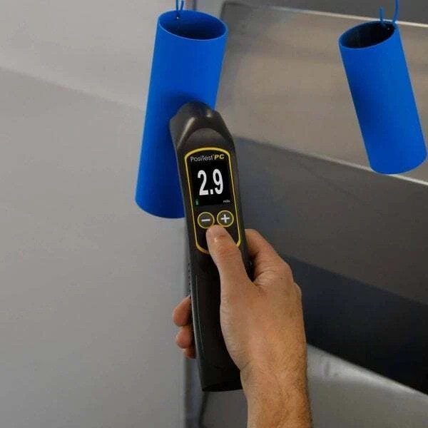 DeFelsko PosiTest PC-B Powder Checker The PosiTest® PC Powder Checker® is a fast, stand-alone gauge designed to measure uncured powder coatings using non-contact ultrasonic technology. It predicts cured thickness quickly and accurately—ideal for moving lines, swinging parts, and complex shapes. Key Features Ready to use out of the box Up to 4× faster measurement speed Easy-to-read digital display with simple icon menu Handheld, lightweight, battery-operated No calibration adjustment needed for most powders Target Grid helps with distance and alignment Solvent, acid, oil, water, and dust resistant Hard-shell case and replaceable sensor screen Conforms to ASTM D7378 Stores up to 999 readings with onscreen averaging Scan Mode for continuous measurement USB connectivity and software updates Specifications Range: 20–100 µm (0.8–4.0 mils) Resolution: 1 µm (0.1 mil) Accuracy: ±5 µm (±0.2 mil) Measurement time: 1–3 seconds Distance to powder: 19 mm (0.75 in) Measurement area: 2 mm (0.08 in) Warranty: 2 years Country of origin: USA