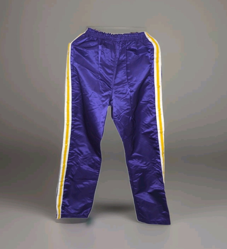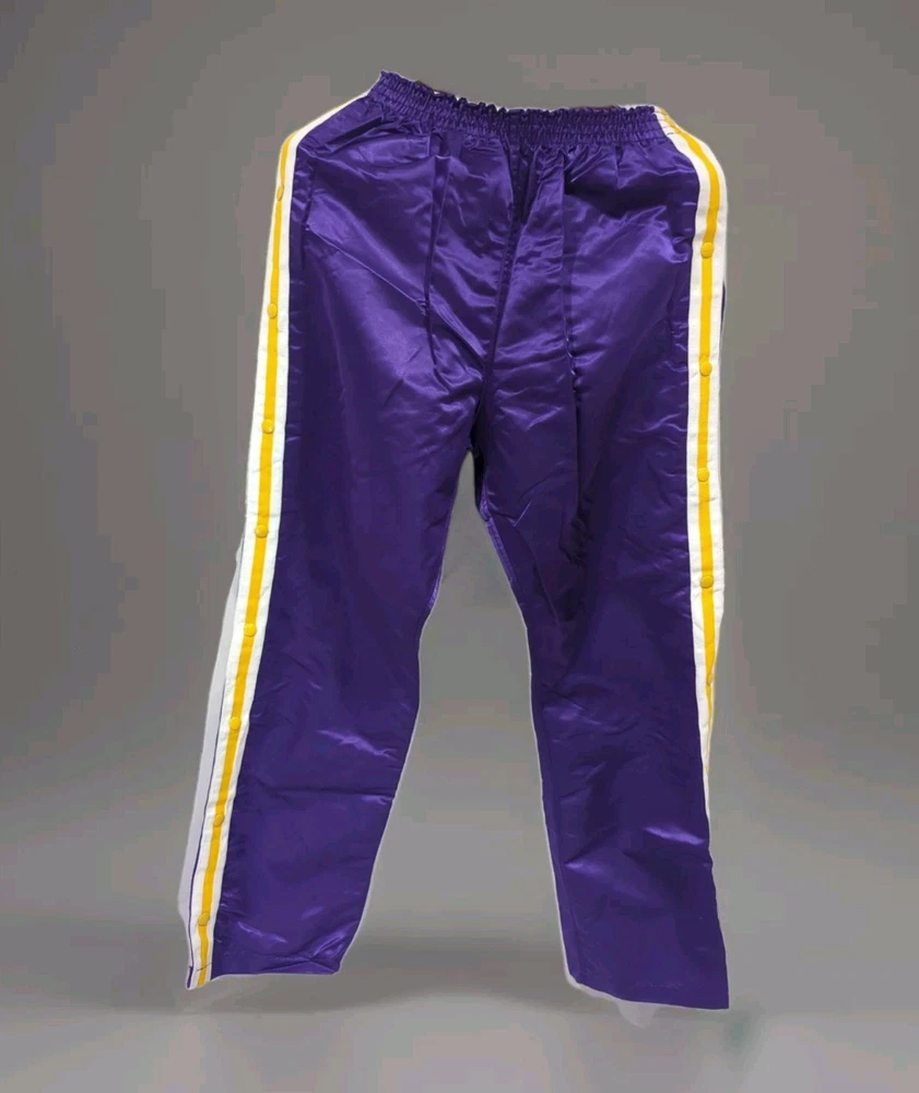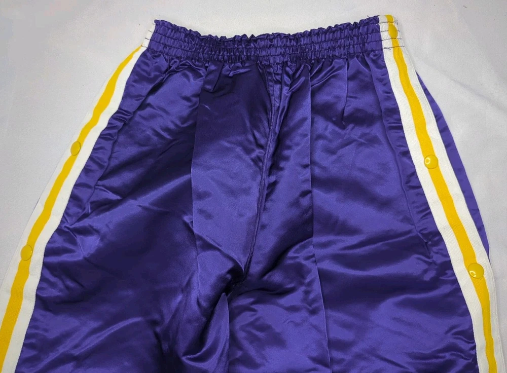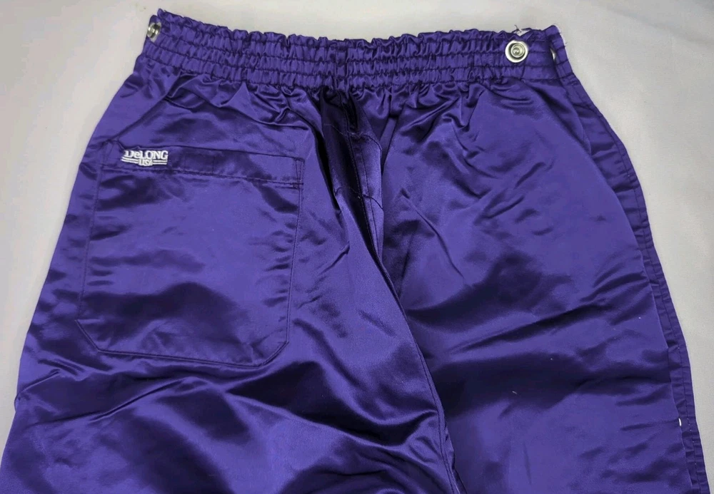 CLASSIC DELONG BREAK AWAY WARM-UP PANTS NYLON CONSTRUCTION WITH A SHINY SATIN LIKE LOOK / FEEL PLEATED FRONT ACCENTS PURPLE IN COLOR WITH YELLOW AND WHITE ACCENT SIDE STRIPES PERFECT FOR THE LA LAKERS / LSU TIGERS / MN VIKINGS AND SEVERAL OTHER SPORTS TEAMS! UNISEX ADULT SIZING - TAGGED LARGE 32-36" STRETCH FIT WAIST 31.5" INSEAM