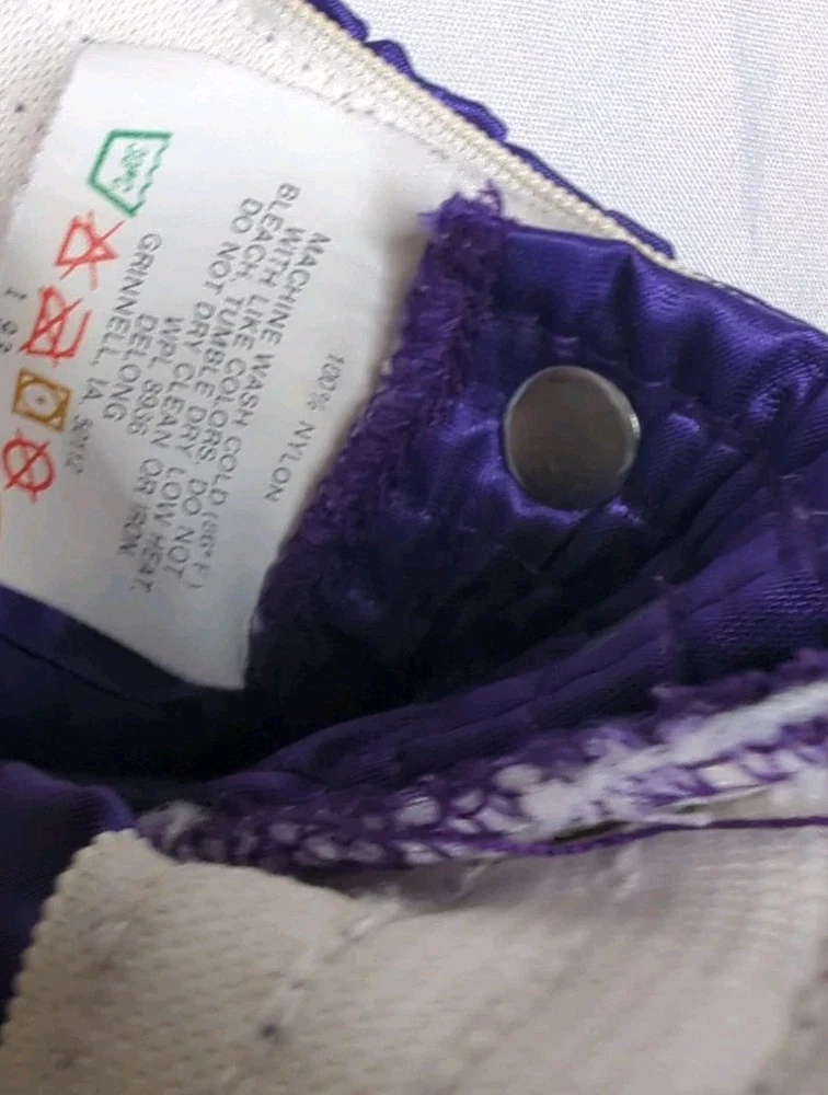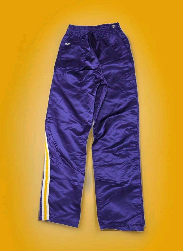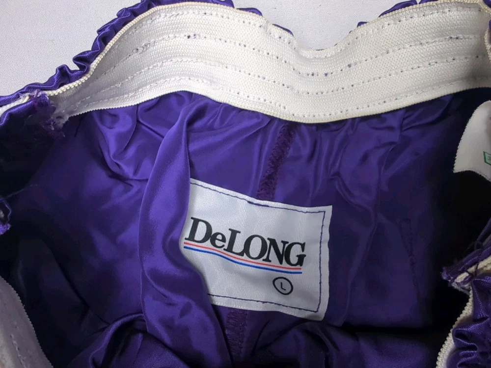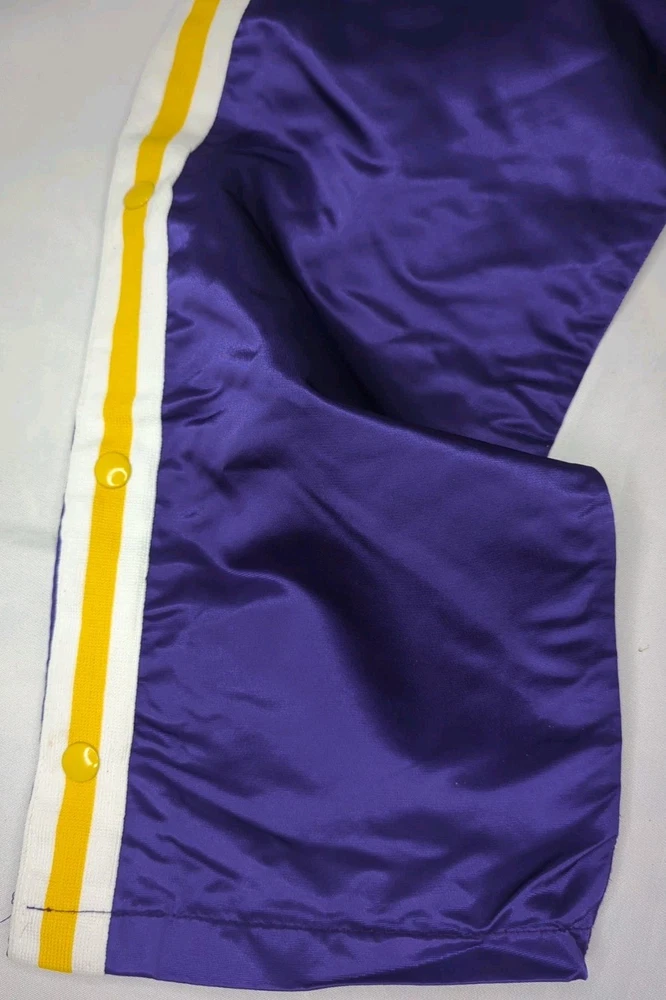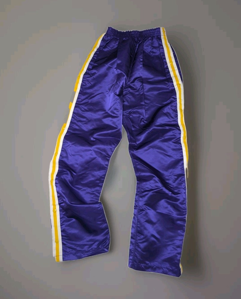 CLASSIC DELONG BREAK AWAY WARM-UP PANTS NYLON CONSTRUCTION WITH A SHINY SATIN LIKE LOOK / FEEL PLEATED FRONT ACCENTS PURPLE IN COLOR WITH YELLOW AND WHITE ACCENT SIDE STRIPES PERFECT FOR THE LA LAKERS / LSU TIGERS / MN VIKINGS AND SEVERAL OTHER SPORTS TEAMS! UNISEX ADULT SIZING - TAGGED LARGE 32-36" STRETCH FIT WAIST 31.5" INSEAM
