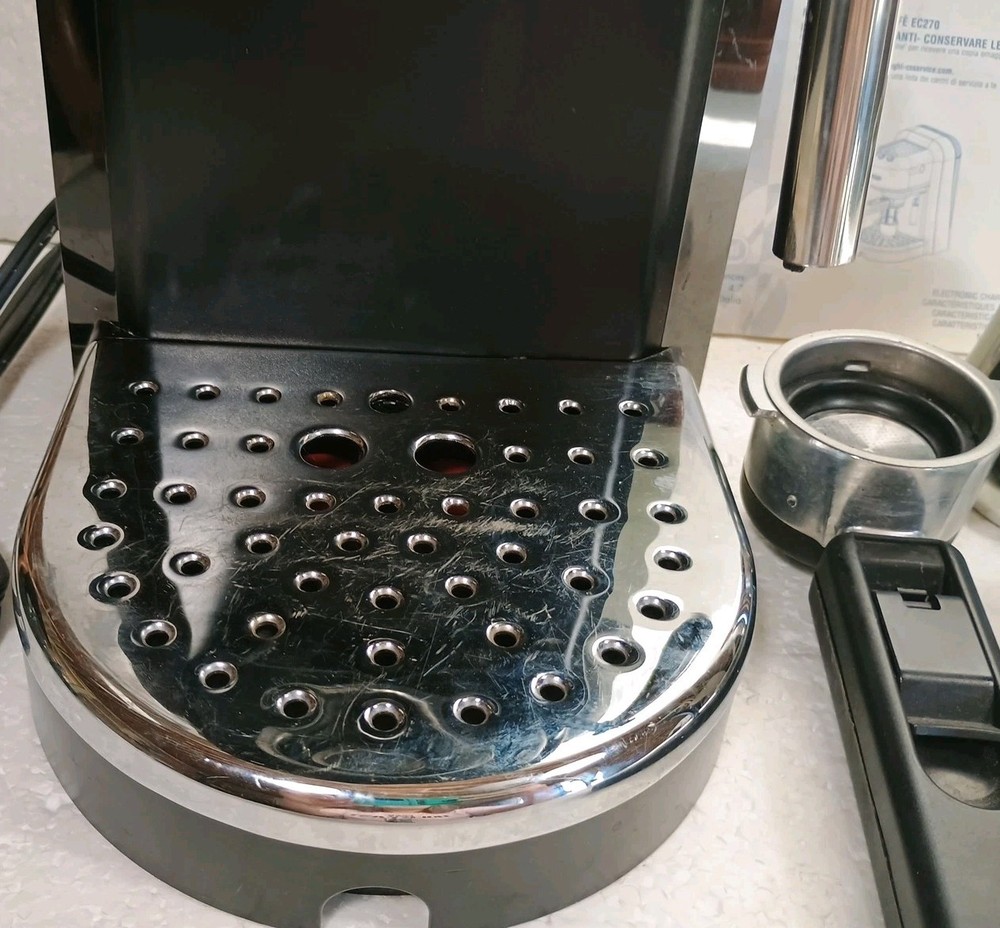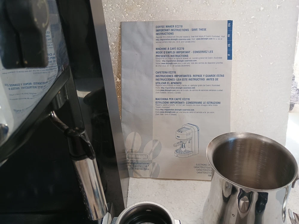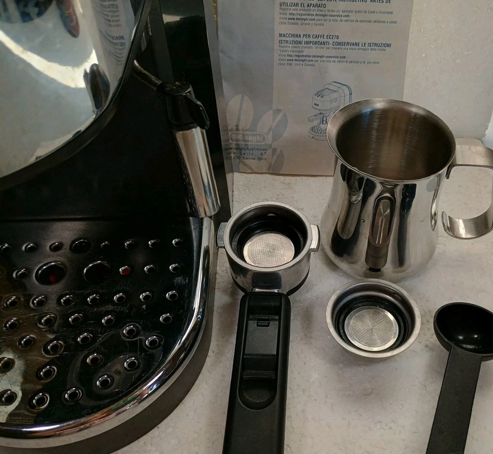 The De'Longhi EC 270 15 BAR Espresso Machine is a stylish and functional addition to any kitchen. This machine, with a sleek silver and black design, is perfect for making delicious espresso drinks at home. With its 15 bar pressure, it ensures rich and flavorful coffee every time. It comes with useful accessories such as a steam wand, frother, and portafilter, making it convenient for users to create their favorite espresso beverages. The machine also features useful functions like an auto shut-off, timer, and built-in water filter, making it easy to use and maintain. Overall, the De'Longhi EC 270 is a reliable choice for coffee lovers looking for a high-quality espresso machine.