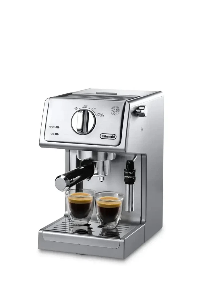 DeLonghi ECP3630 Manual Espresso Machine Cappuccino Maker - Silver NEW BOX Every Cup to Your Liking 15-bar professional pressure assures quality results every time, and adjustable controls allow you to make modifications for your personal taste preferences Brew Like a Pro Whatever your preference – single or double espresso, cappuccino or latte – the machine brews authentic barista-quality beverages just like you enjoy at your favorite coffeehouse. Cappuccino or Latte? With an integrated Premium Adjustable Frother, you can create Italian classic cappuccino with a dryer texture milk-foam or choose Hot Milk setting for your latte. One Espresso Shot or Two? The three-in-one filter holder accommodates the included filter baskets for single espresso, double espresso, and easy-serve espresso pods – whatever your preference. No Waiting Between Cups The Advanced Cappuccino System maintains the optimal temperature so you can brew cup after cup instantly Accommodates Taller Cups If you’d prefer a larger size beverage, no problem. The bottom tray of the unit is easy to adjust or remove to fit taller cups. Sleek Space-Saving Design With a sleek profile, compact design and narrow footprint, each model fits beautifully on a kitchen countertop – without taking up too much space Convenient Water Tank The water tank is simple to remove, refill and reattach, and the water level is easily visible to eliminate the guesswork Easy to Clean Removable water tank and drip tray make for easy cleanup, and the parts are dishwasher safe What's Included DeLonghi Espresso Machine