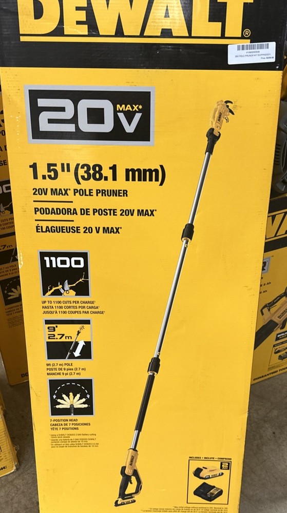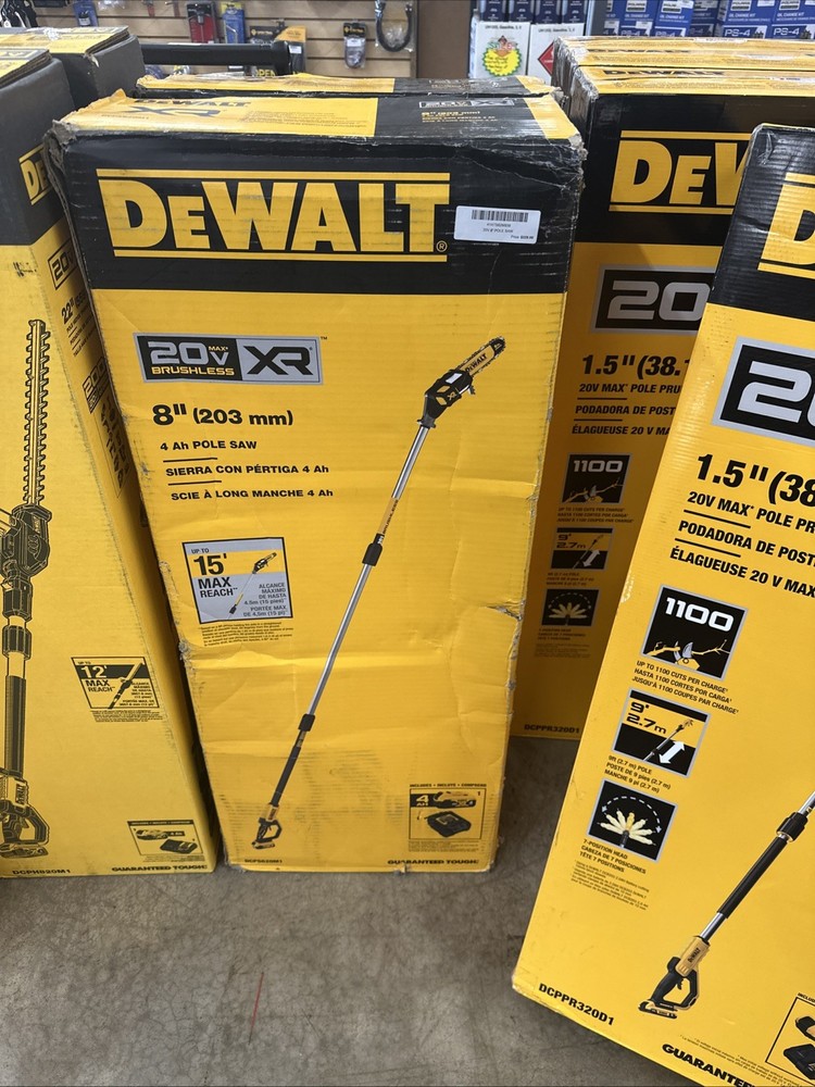 Power: 20V Model: DCPPR320D1 Brand: DEWALT Type: Pole Pruner Product Line: DEWALT DCCS gtin13: 885911984836 MPN: DCPPR320D1 Voltage: 20 V UPC: 885911984836 Engine Type: Battery Features: Cordless, Lightweight Power Source: Battery Accessories Included: Assembly Guide, Extension Pole, Guide Bar Cover, Toolkit, Battery and Charger Assembly Required: Yes