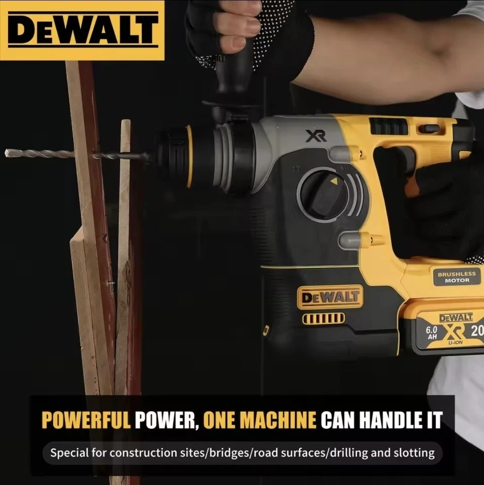 (Tool Only) Professional Power for the Toughest Masonry Jobs When standard hammer drills fail, the DeWalt 20V MAX XR SDS-Plus Rotary Hammer delivers. Engineered for heavy-duty drilling into concrete, brick, and stone, this tool provides 2.1 Joules of impact energy—giving you corded performance with cordless freedom. Whether you're anchoring bolts or chipping away old tile, this brushless powerhouse is built to survive the job site. Key Performance Features Brushless Motor Technology: Maximum runtime and durability. Brushless motors run cooler and last significantly longer than standard motors. SHOCKS® Active Vibration Control: Reduces vibration felt at the handles, allowing you to work longer with less fatigue and better precision. 3-Mode Versatility: Quickly switch between Drilling (wood/metal), Hammer Drilling (masonry), and Chipping/Chiseling (demolition). SDS-PLUS Chuck: The "four pits" quick-change system ensures your bits stay locked in during high-torque applications. Factory-Level Ergonomics: Lightweight, L-shape design with a 360° side handle for maximum control and balance during overhead or horizontal drilling. Retractable Utility Hook: Easily hang the tool on your belt or a ladder when not in use. Technical Specifications Voltage 20V MAX* Impact Energy 2.1 Joules No Load Speed 0 – 1,100 RPM Blows Per Minute 0 – 4,600 BPM Vibration Level 6.6 m/s² (Active Vibration Control) Chuck Type SDS-Plus (1-inch capacity) Optimal Drilling Range 5/32" – 1/2" (Concrete) What’s Included? 1 x DeWalt 20V Brushless SDS-Plus Rotary Hammer 1 x 360° Rotating Auxiliary Handle 1 x Depth Rod Concrete Drill Masonry Hammer XR Brushless The DeWalt 20V SDS Rotary Percussion Impact Drill is a powerful and versatile cordless tool designed for heavy-duty tasks. With a brushless motor and 2.1J maximum torque, this drill is capable of delivering reliable performance. It features a lightweight design, auxiliary handle for added control, and SDS-PLUS four pits chuck for easy bit changes. The 20V lithium-ion battery technology ensures long-lasting power, making it a convenient and efficient choice for various drilling applications. Ideal for professionals and DIY enthusiasts alike, this DeWalt drill is a solid addition to any tool collection.