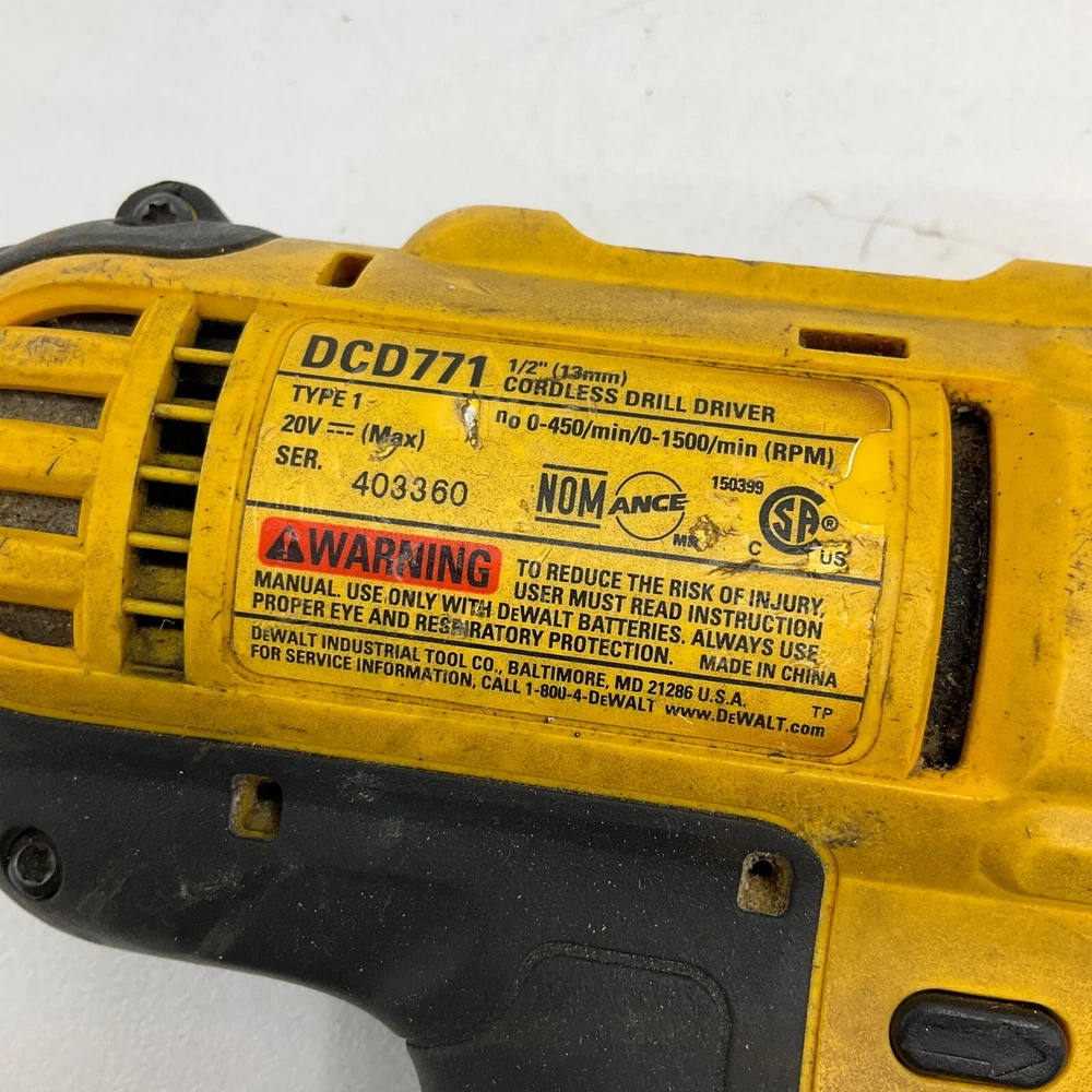 You are looking at a DeWalt DCD771 20V Max Cordless 1/2" Drill/Driver Tool Only This item is previously owned. Standard wear on the tool from use. Tool only, does not come with a battery. Tested working. Please see all pictures for details! About Us Customer service is our #1 priority! If for any reason you are dissatisfied with your purchase we offer a 30 day money back guarantee unless otherwise noted in the listing (AS-IS/For Parts - No returns.) We only accept items back in the condition that they were sent to you. Items that are listed AS-IS are not eligible for this money back guarantee. If you are unhappy with your purchase PLEASE contact us BEFORE leaving feedback or contacting eBay so we can work with you to resolve any problems. Shipping When we charge shipping to our customers we only pass on to our buyers exact shipping costs - no added fees. We offer combined shipping for multiple items purchased, so if you purchase more than 1 item from us, please wait for us to combine shipping costs. We require signature confirmation on all items that sell for $750.00 & more per eBay's selling policy. We also insurance all items that sell for $250.00 & more. PLEASE NOTE: WE DO NOT WORK/SHIP ON HOLIDAYS OR WEEKENDS! We use the eBay Global Shipping program for international shipping. DLLR License #991 Please note, we are not an authorized distributor or manufacture's representative of this item. *This product may contain a chemical known to the state of California to cause cancer and birth defects or other reproductive harm* Track Page Views With Auctiva's Counter
