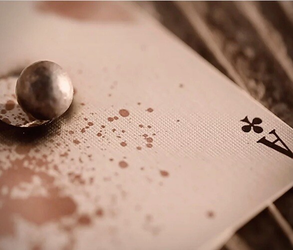 This is a pair of decks; the ORIGINAL Dead Man’s Deck, and the second version of it. Neither is the “unharmed” version. They were NOT sold plastic wrap on the tuck box. Please note that the v1 tuckbox has a stray drop of ink in the upper right corner from the factory, as shown in the close-up photo. Sure be a conversation starter, these cleverly done and totally unique decks are based on the infamous death of James "Wild Bill" Hickock, a Civil War veteran and celebrated gunfighter. Wild Bill was shot in the back during a poker game before he could play his hand...and legend has it that he held Aces and Eights: The Dead Man´s Hand. Each of the morbid cards in this deck has a bullet hole straight through its middle, and the infamous "Dead Man’s Hand” is splattered with bloody red ink. The design is true to the time period, with an ornate, grey pattern and old-style faces. Please check my other listings for many sought-after collectible poker decks including rarities from Stockholm 17, Lotrek/Oath, Bicycle, and Kickstarter exclusives. Thank you!