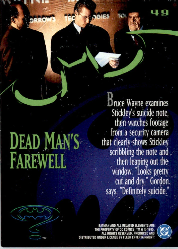 Graded: No Year Manufactured: 1995 Season: 1995 Card Number: 49 Autographed: No Franchise: NON_SPORT Set: 1995 Ultra Batman Forever Player/Athlete: Dead Man's Farewell Type: Non-Sport Trading Card