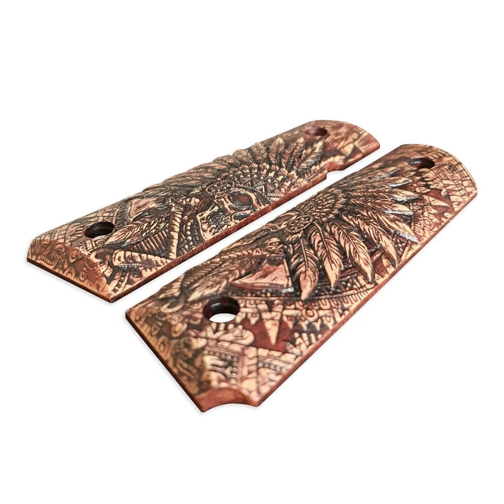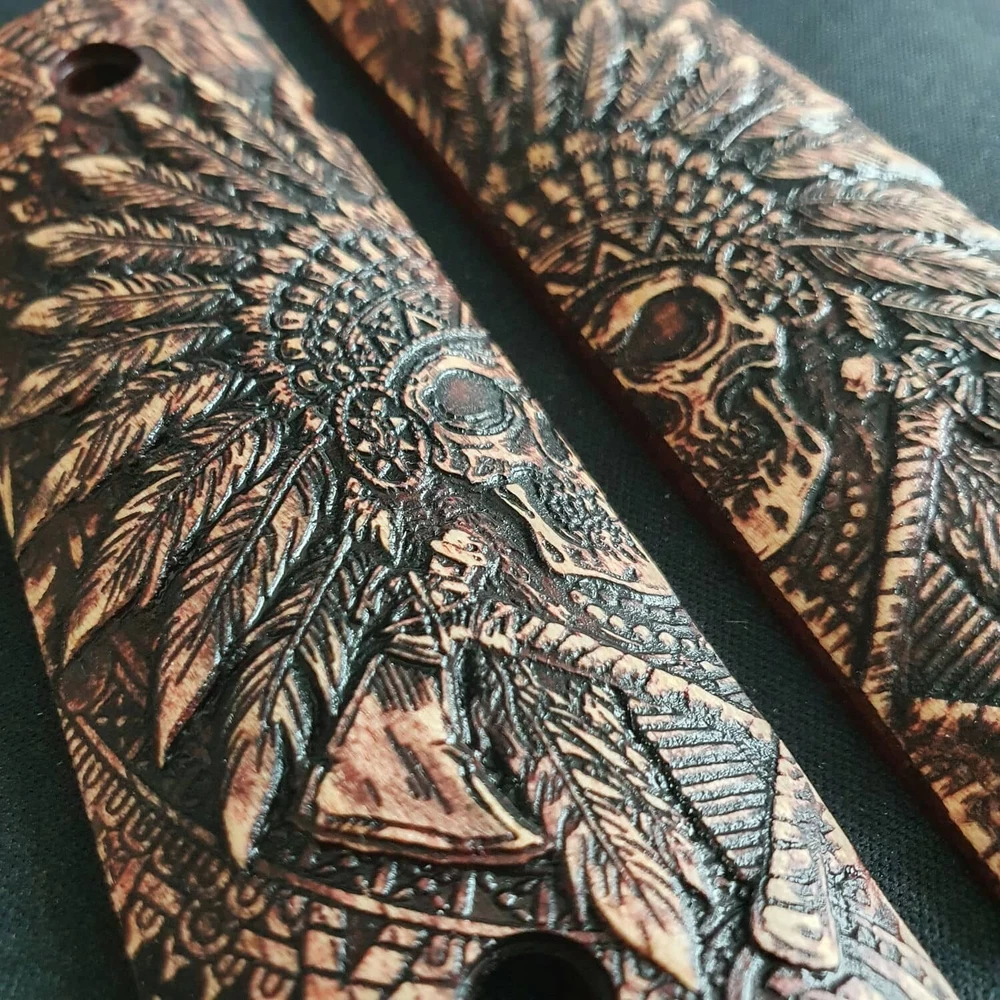 New 1911 Full Size Government grips with "Dead Reds Cherry" design. Carved from solid natural wood - Fits at all 1911 Full Size pistol models by Colt, Taurus, Sig Sauer, Kimber, Smith and Wesson, Springfield and etc - Ambi-Safety on request - Cut by CNC. Grinded, painted and oiled by hand