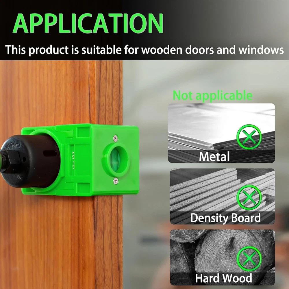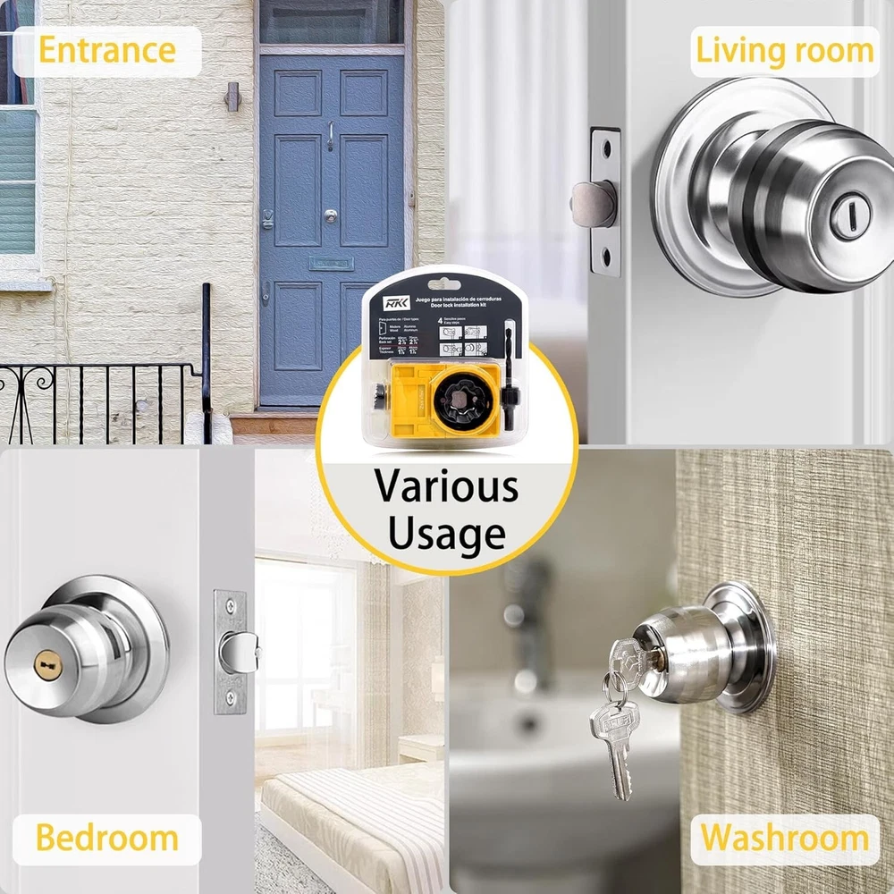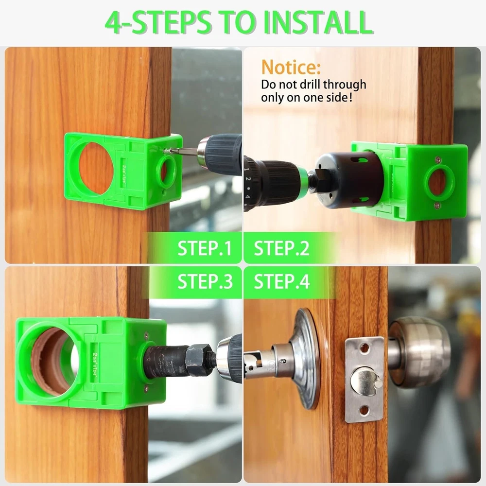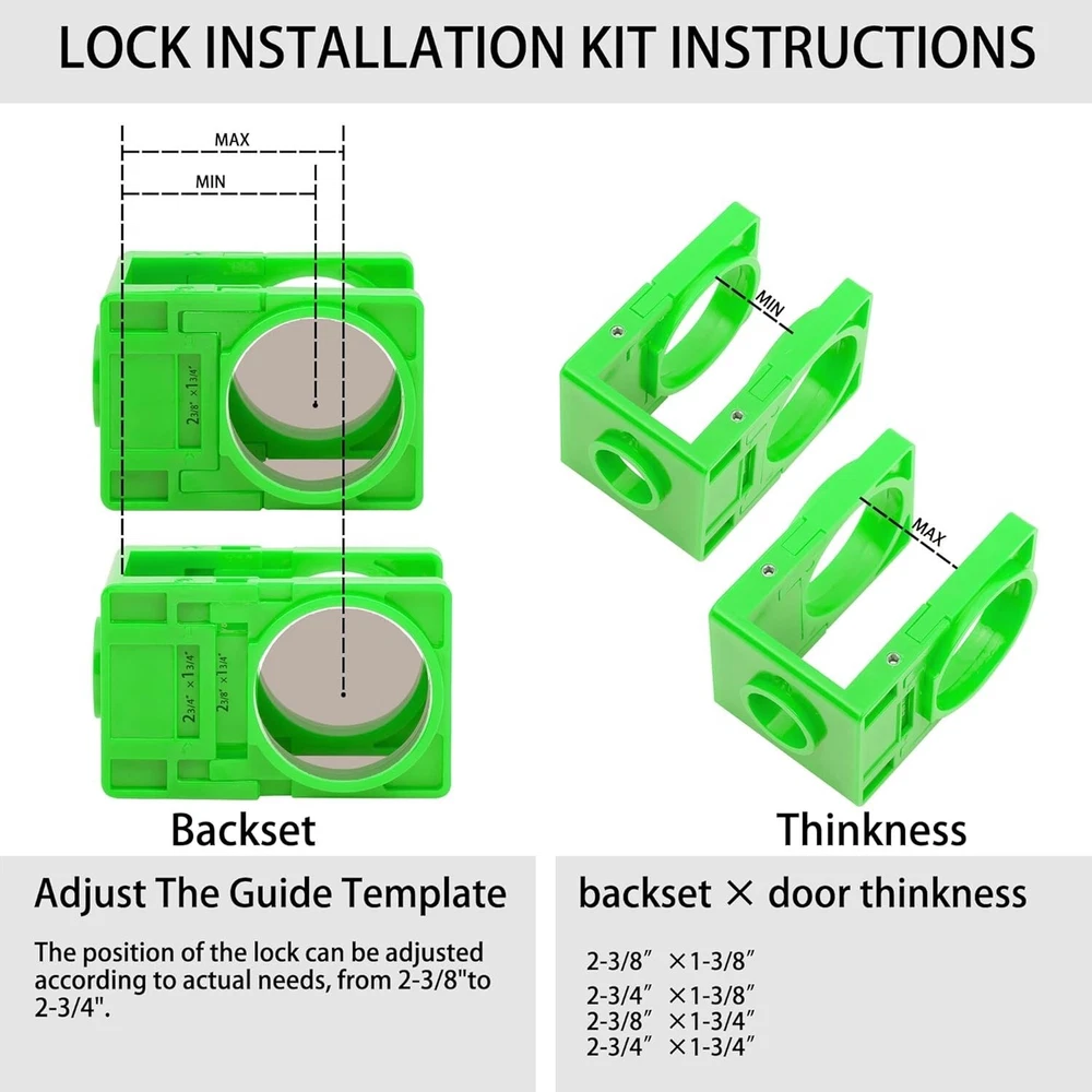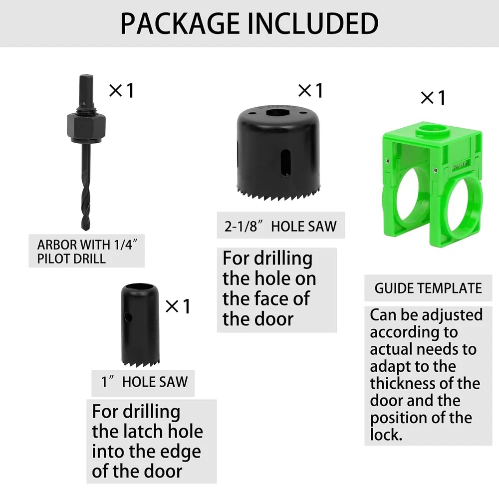 Please refer to the installation video. 【Package Included】- The door lock installation kit includes: 1 x adjustable plastic guide template, 1 x 2-1/8"(54mm) hole saw, 1 x 1"(25mm) hole saw, 1 x arbor with drill bit. 【High-quality Material】- Two Hole saws are made of durable carbon steel & guide template is made of reinforced plastics, which has long service life. 【Easy to Set】- The adjustable guide template is convenient for accurate drilling, and is equipped with snap-lock arm for selecting door width and backset. Drill one side of the door panel vertically to about half position, and then drill the other side of the door panel until it penetrates. 【Widely Applicable】- The design is suitable for the most common lock size in daily use for wooden doors. The adjustable plastic guide template is suitable for 1-3/8 inch, 1-1/2 inch and 1-3/4 inch thick doors and 2-3/8 inch and 2-3/4 inch backsets.