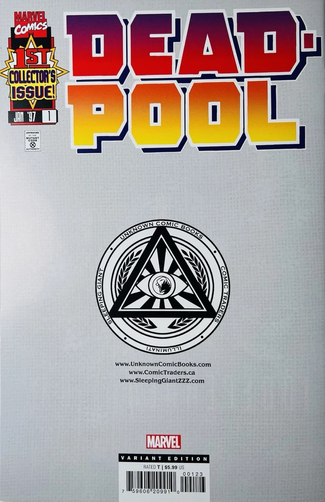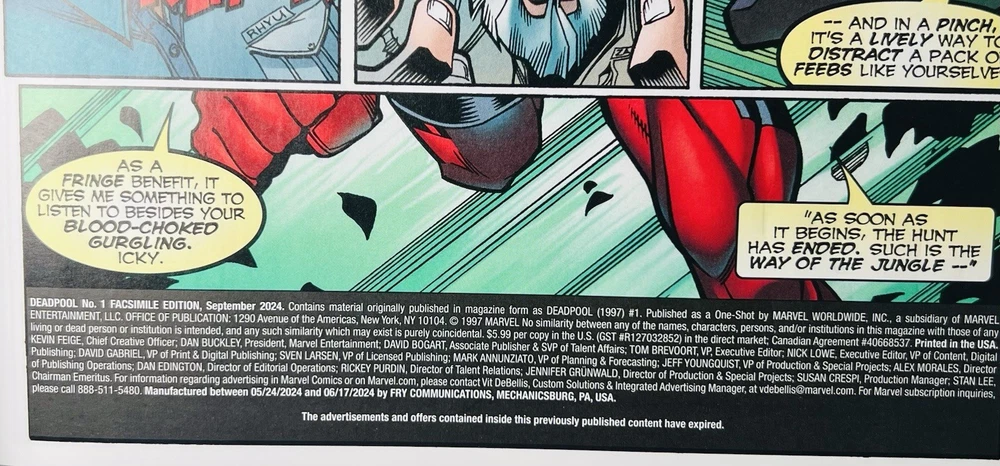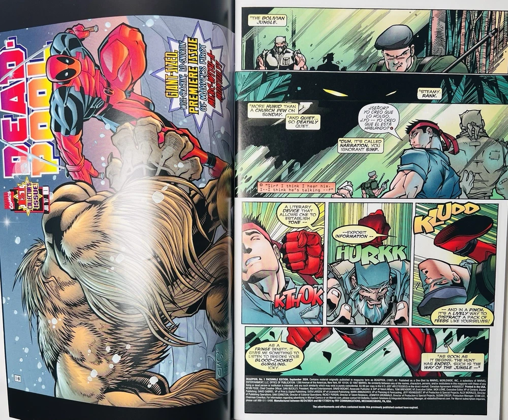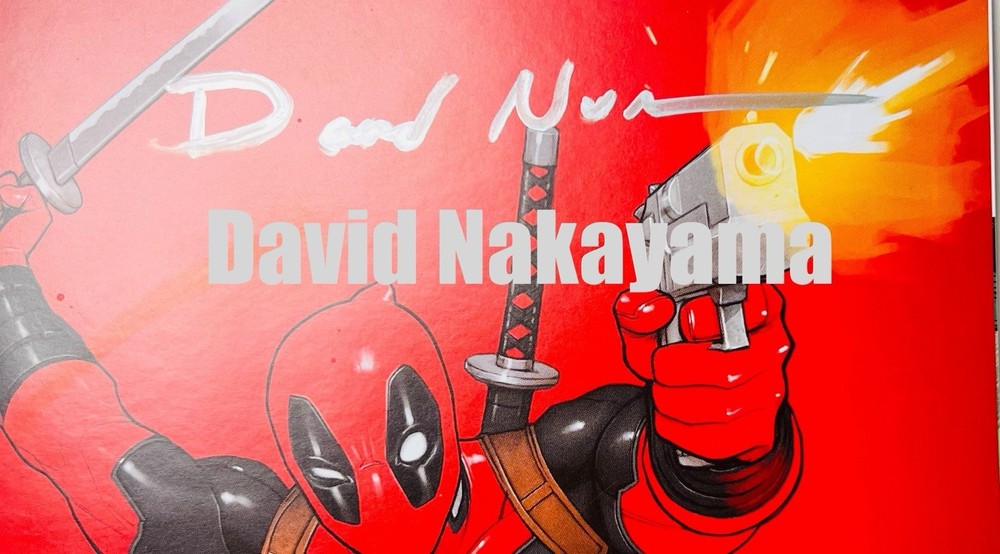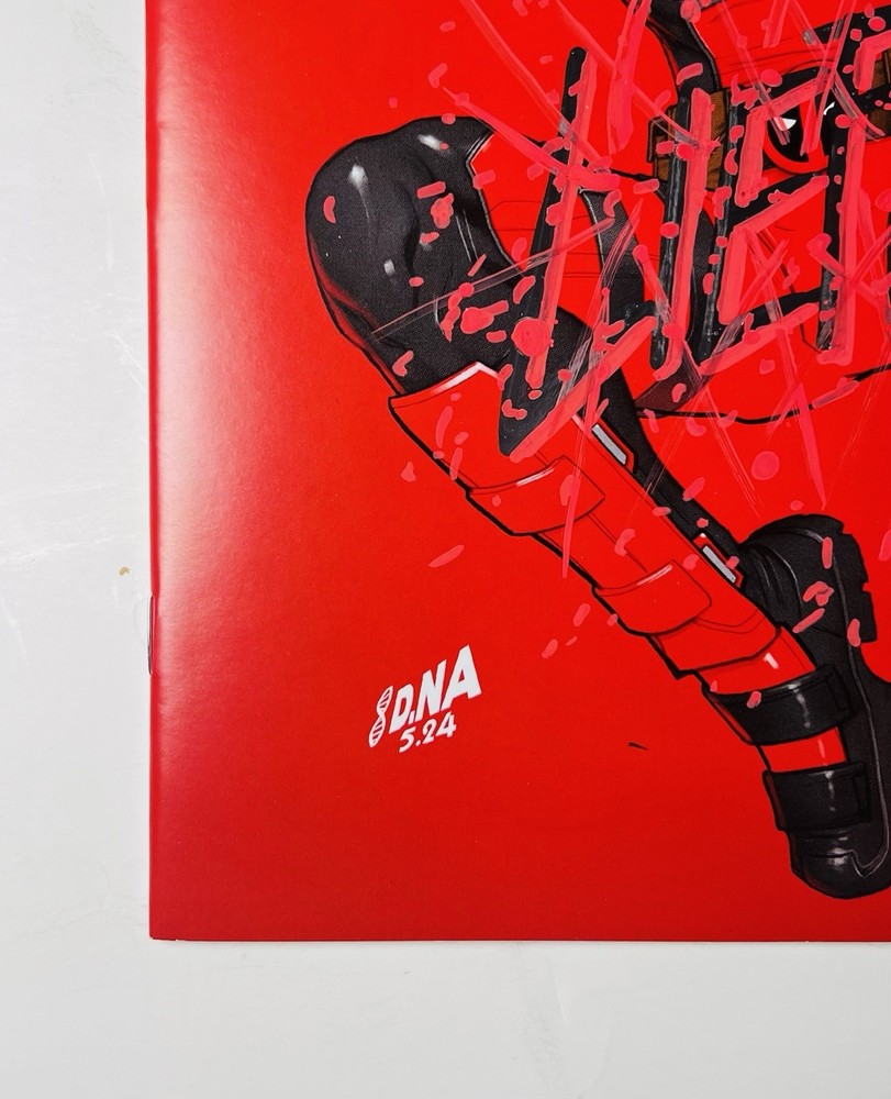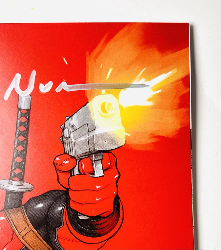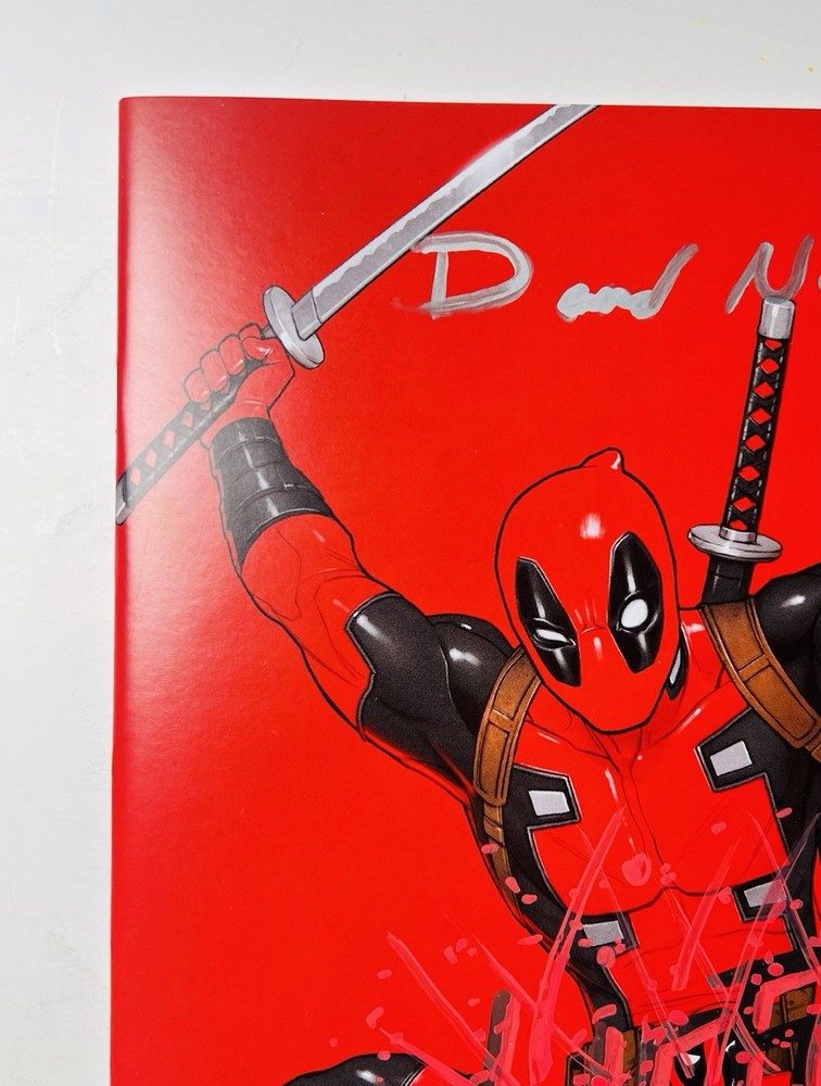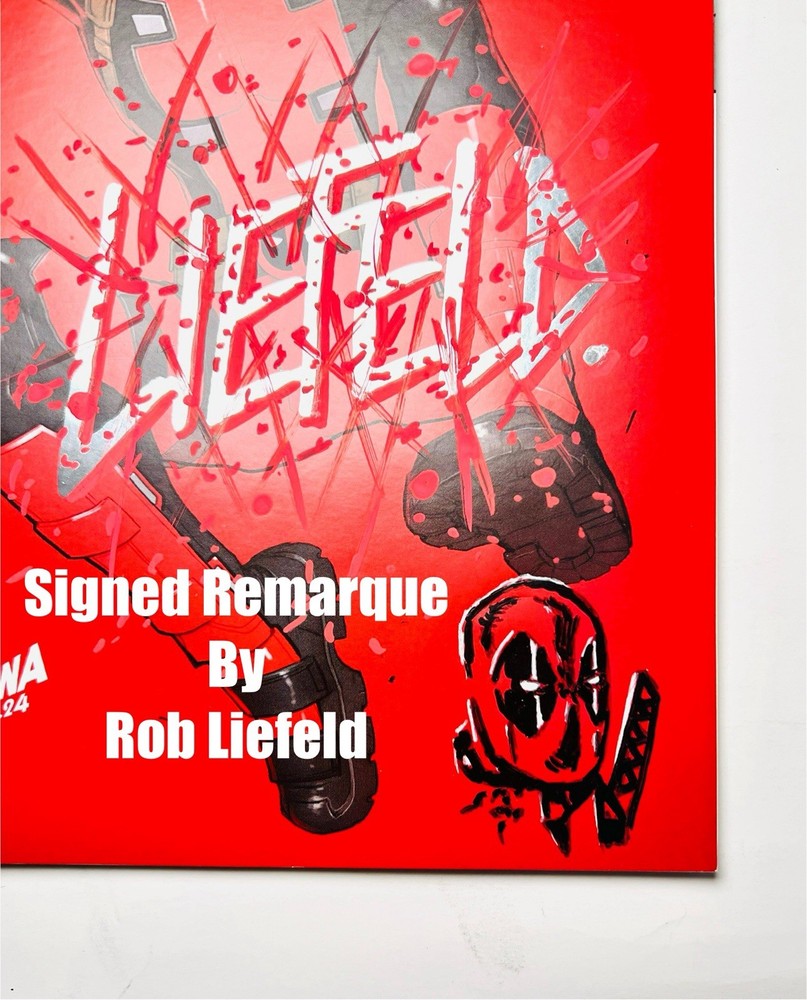 The product is a Deadpool #1 facsimile comic book featuring artwork by David Nakayama in a virgin color bleed variant. It is signed by Rob Liefeld and David Nakayama, making it a highly collectible item. This modern-era comic book, published by Marvel Comics, is a key issue featuring the popular superhero Deadpool within the Marvel Universe. The comic is a single issue format, with personalized features such as a variant cover and signed remarque, making it a valuable addition to any comic book collection. Huge bloody drip signature by Liefeld done in chrome & red! There is also a small remarque of Deadpool in the lower right by Liefeld. Nakayama has signed in silver ink across the top of the front cover. Condition is perfect, no creases, spine tiks, or damage of any kind. Extremely high grade comic!
