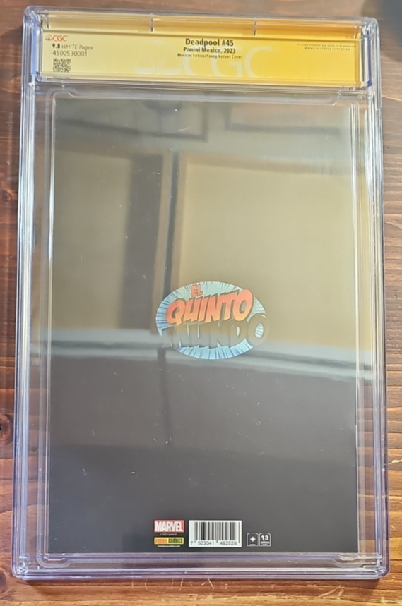 Item Details Title: Deadpool #45 (El Quinto Edition) Publisher: Panini Mexico / Marvel Year: 2023 Variant: Mexican “El Quinto” Edition Grade: CGC 9.8 (White Pages) Certification #: 4500530001 Signatures: • Scott Koblish – Signed and original Deadpool sketch • Gerry Duggan – Writer • Skottie Young – Variant cover artist Label: CGC Signature Series (Yellow)