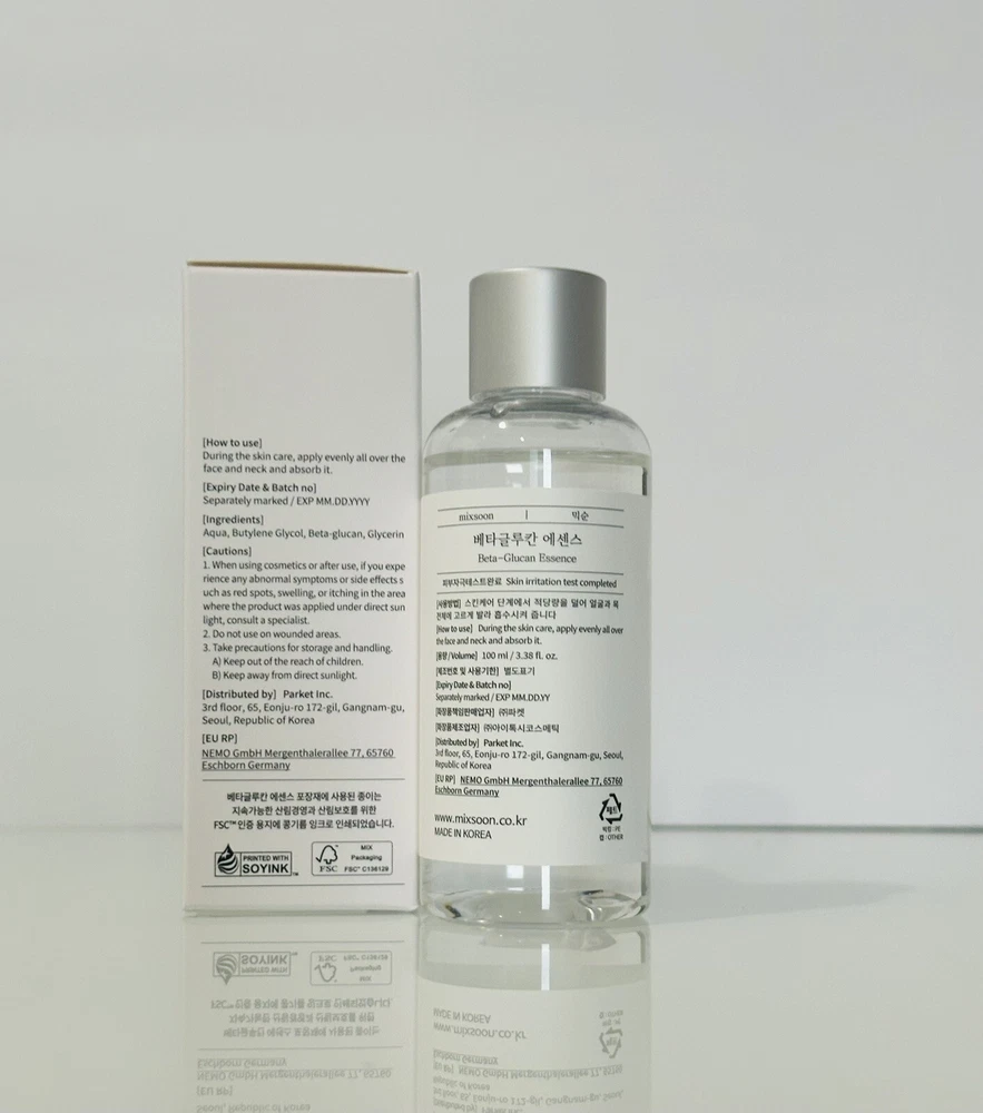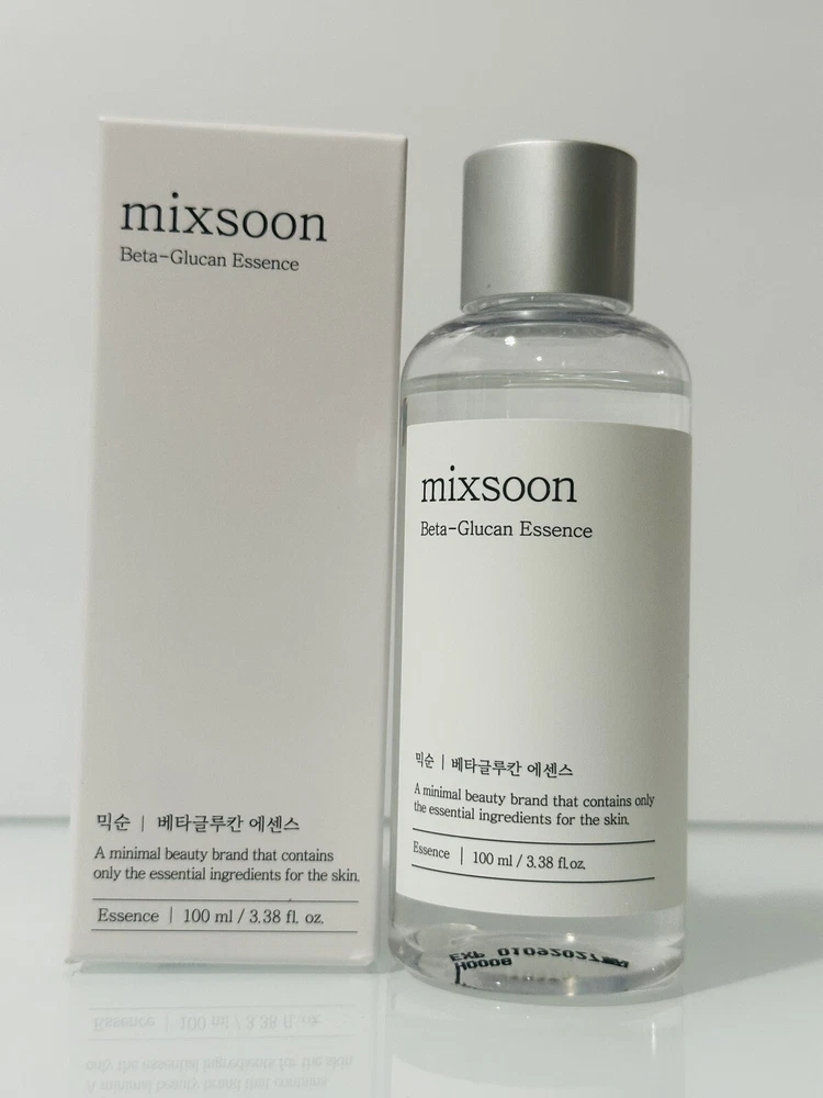 MIXSOON Beta Glucan Essence 100mL. Only 4 ingredients: Beta-Glucan, aqua, butylene Glycol, glycerin. Beta-Glucan Essence is formulated with 100% Beta-Glucan extracts, designed to hydrate, nourish, and detoxify dehydrates skin by replenishing the skin with long-lasting mushroom-powered moisture. This lightweight essence delivers intensive all-day hydration and boosts elasticity for a youthful glow. Suitable for all skin types, and perfect for dry/sensitive skin. This water-type essence absorbs quickly into the skin without sticky residues, leaving the skin nourished and plumped to perfection. Essential essence for healthier, bouncy skin.