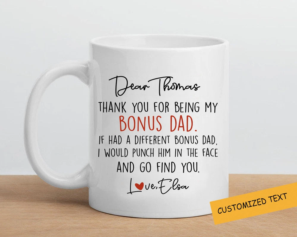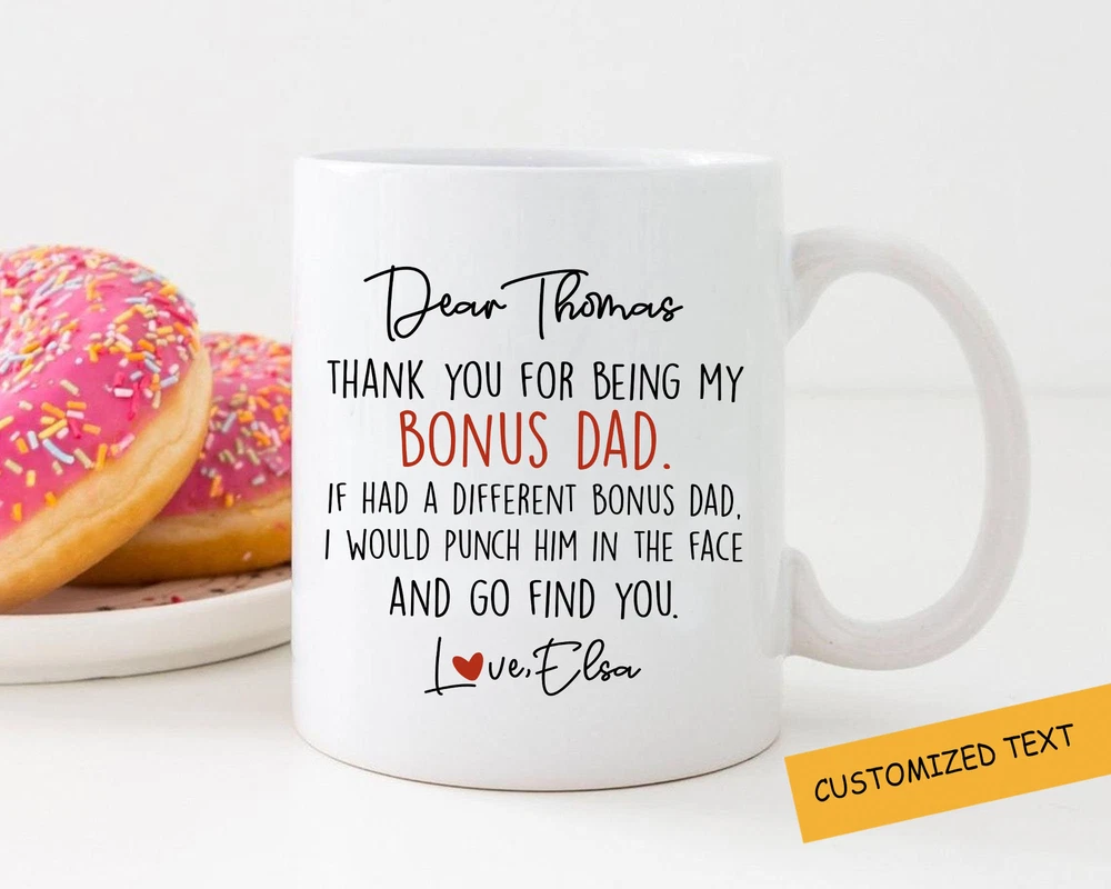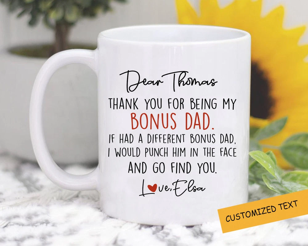 Dear Bonus Dad Personalized Mug Being My Father In Law Mug Fathers Day Gift Idea Product Details.. This high quality 11oz. ceramic white mug has a premium hard coat that provides crisp and vibrant color reproduction sure to last for years. Perfect for all hot & cold beverages. The highest quality printing possible is used. It will never fade no matter how many times you wash it. Material: 100% Ceramic. Print both sides. Dishwasher and Microwave Safe. High Gloss + Premium White Finish. Printed in the U.S.A. Personalized & Custom. We support personalized and custom mug to add custom, when placing an order, you can add notes to the "order note" in shipping address section. Also you can contact us directly via message. Shipping Info. Ready to ship in 1 to 2 business days, All products are made-to-order and proudly printed in the United States. Shipped by USPS and DHL, You will receive your order in 5-7 days. Replace & Refund. All products are defective during shipping broken, chipped will be replaced free of charge. You are not satisfied with the product, we will refund 100% money to you. If any other issues arise, please do not hesitate to message, we would be more than happy to assist you.