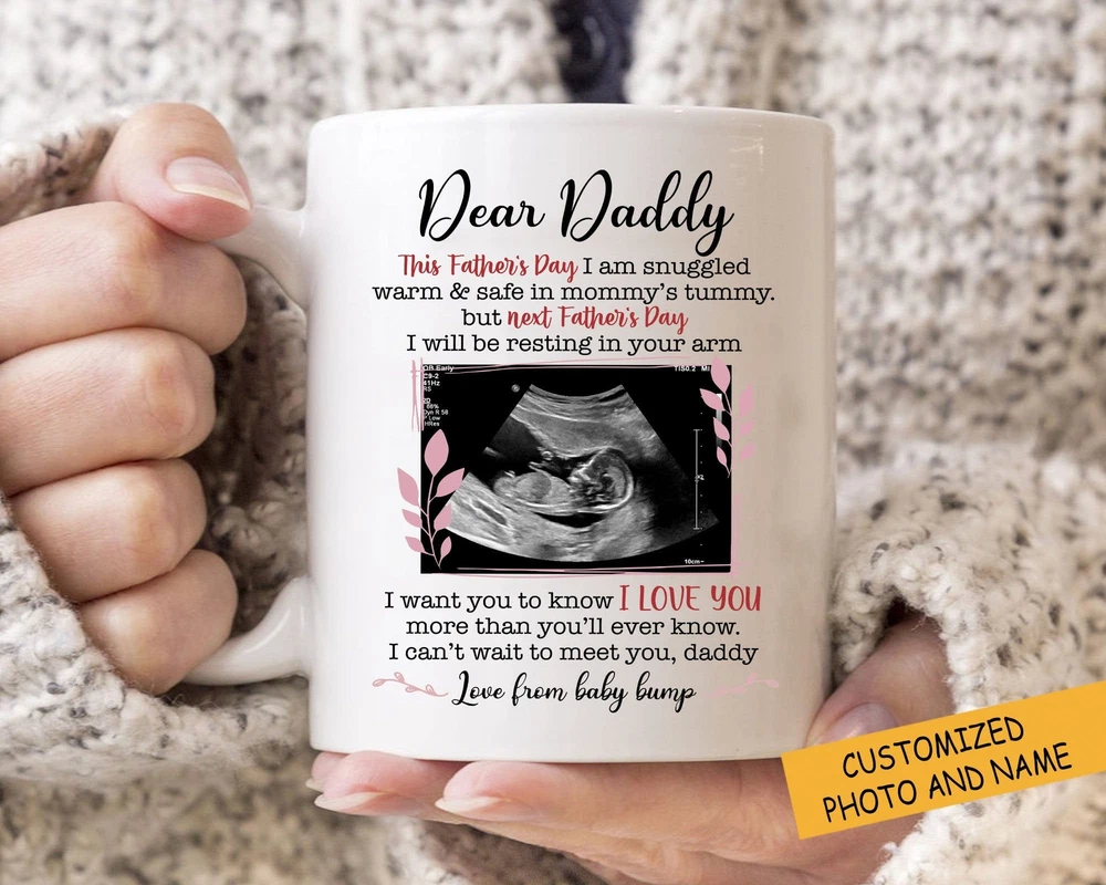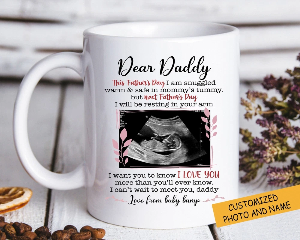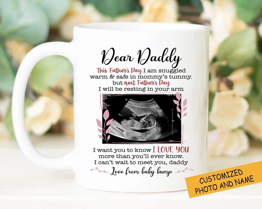 Dear Daddy Personalized Mug Ultrasound Photo Mug I Will Resting In Your Arms Mug Product Details.. This high quality 11oz. ceramic white mug has a premium hard coat that provides crisp and vibrant color reproduction sure to last for years. Perfect for all hot & cold beverages. The highest quality printing possible is used. It will never fade no matter how many times you wash it. Material: 100% Ceramic. Print both sides. Dishwasher and Microwave Safe. High Gloss + Premium White Finish. Printed in the U.S.A. Personalized & Custom. We support personalized and custom mug to add custom, when placing an order, you can add notes to the "order note" in shipping address section. Also you can contact us directly via message. Shipping Info. Ready to ship in 1 to 2 business days, All products are made-to-order and proudly printed in the United States. Shipped by USPS and DHL, You will receive your order in 5-7 days. Replace & Refund. All products are defective during shipping broken, chipped will be replaced free of charge. You are not satisfied with the product, we will refund 100% money to you. If any other issues arise, please do not hesitate to message, we would be more than happy to assist you.