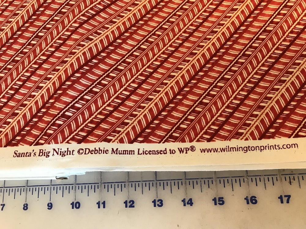 "Santa's Big Night" Striped Fabric per yard 44" wide Designed by Debbie Mumm The auction is for 1 yard of fabric 44" wide. If purchasing more than 1 they will be cut off the bolt in one continuous piece