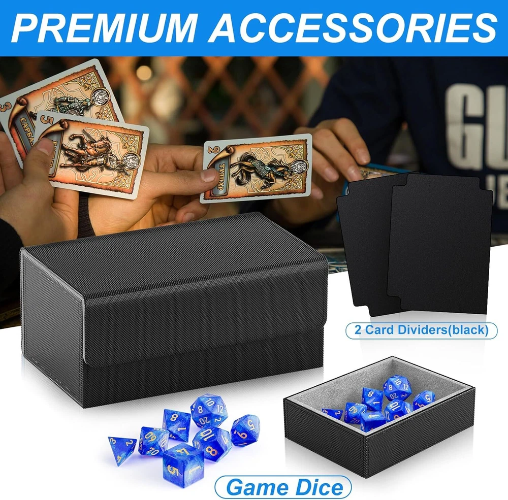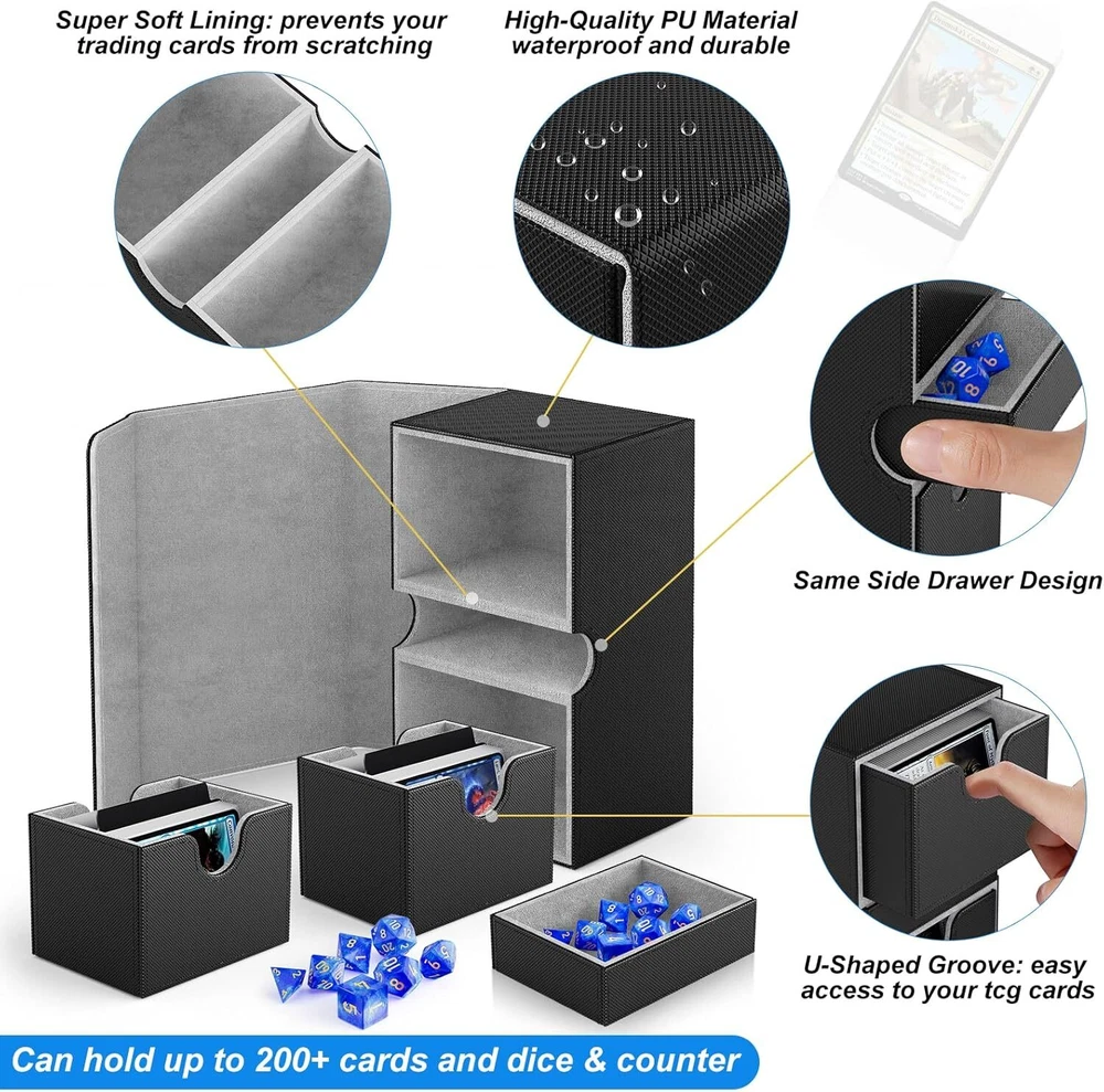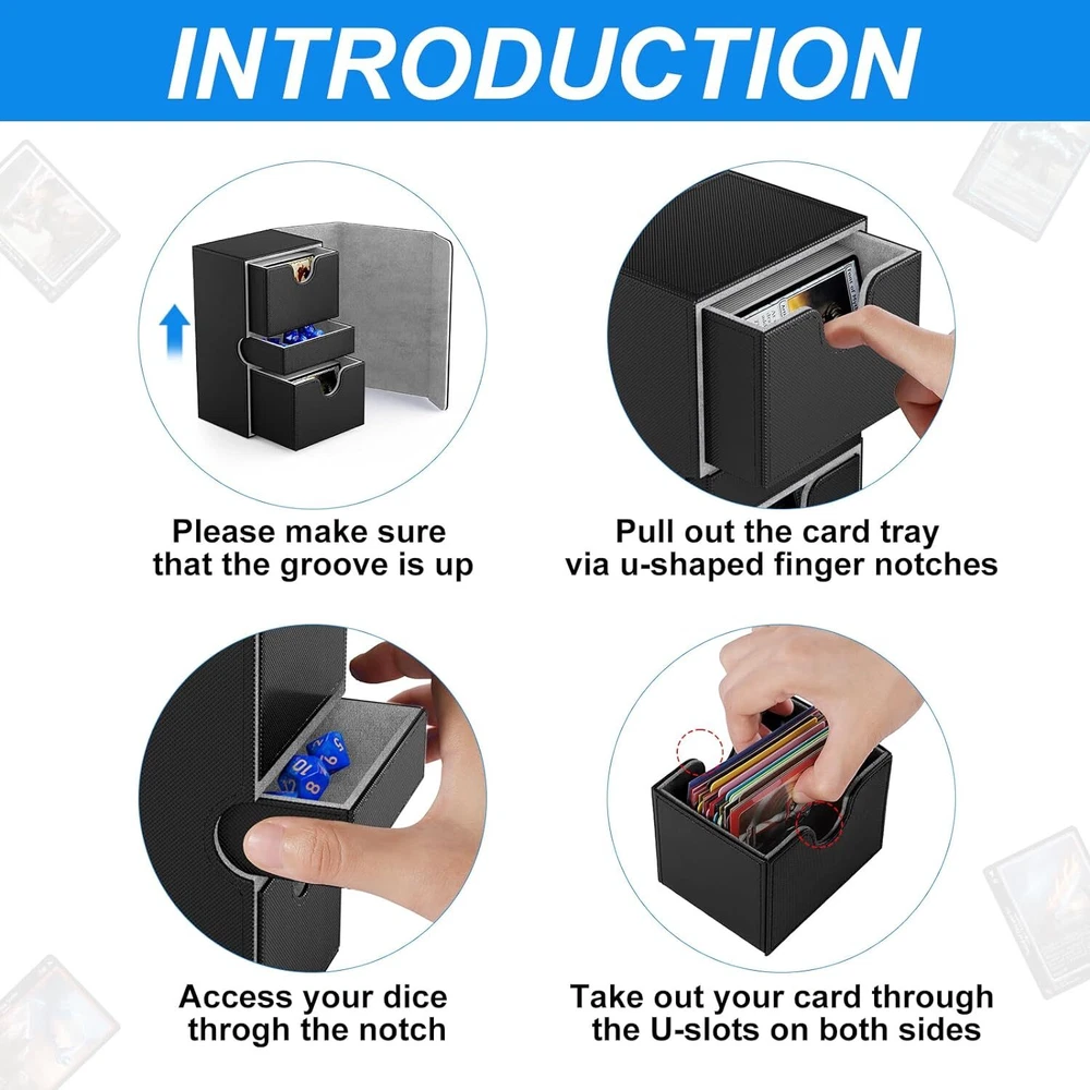 Free eBay listing template designed by dewiso.com Card Deck Box Fit For MTG Commander Deck Box with Dice Tray Fits 200+ Double Sleeved Cards, PU Leather Double Card Deck Box with Card Dividers and Dice FREE AND FAST SHIPPING! About this item 【Premium Double Deck Box】The commander deck box is equipped with 2 card trays and 1 dice tray, along with 2card dividers and 7 dices , specifically designed for your commander decks to enhance your gaming experience comprehensively. 【Large Capacity】The 2 side-loading card trays can effortlessly store 200 double-sleeved cards or 240 single-sleeved cards. The dedicated dice tray is designed to hold various accessories such as dice, counters, and tokens, ensuring your gaming gear remains organized. 【Strong Magnetic Closure】Featuring a powerful magnetic clasp design, the deck box mtg ensures a secure closure even during vigorous shaking or accidental drops, preventing cards from spilling out and guaranteeing their safety. 【Comprehensive Protection】The exterior of the card deck box is made from premium PU material, featuring a non-slip texture that is scratch-resistant and durable, effectively shielding against external impacts. The interior is lined with soft microfiber to prevent card scratches, and the U-shaped opening design allows for easy card retrieval, offering an optimal user experience. 【Perfect Gift Choice】Whether for a friend or for personal use, the mtg commander deck box is an ideal choice to elevate the gaming experience. Its high-quality materials and design make it an essential accessory for TCG enthusiasts. Product We offer a 30-Day Return Policy on items which you are not completely satisfied with. You have the option for a full-refund or an exchange of the item. No returns are available on items shipped outside of the US . Shipping We offer Free Shipping to the US and ship within 2 business days of payment, usually sooner. We use UPS express shipping. That's why your products are usually delivered within 3 days . Contact We try our very best to make sure every customer is completely satisfied. If there's a problem , message us! We're happy to help. 24/7 live chat available.