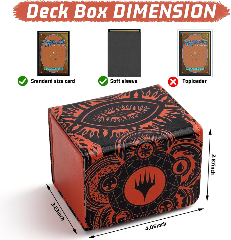 Premium Material: The Full Color Printed waterproof pu leather outer layer, while the soft ultra-fine fiber inner layer can protect the card from scratches. In addition, four strong magnets can ensure safe sealing and facilitate safe transportation Large Capacity : The MTGPRO card storage box can hold 80+ double-sleeve cards, 120 single-sleeve cards, or 200+ unsleeved cards. Its U-shaped wide mouth opening and flip-cover design allow for easy retrieval of your cards, ensuring smooth and hassle-free gameplay Versatile Compatibility: Our Card Deck Box is Compatible with multiple standard cards, perfect for MTG cards, yugioh cards, One Piece,TCG cards, sports cards, cards from board games, and more Ideal Gift Choice :This Card Deck Case is perfect for trading card game enthusiasts. Combine stylish functionality with large storage, not just a considerate gift, but also a useful one 100% Satisfied After Service :MTGPRO offers a 12-month worry-free service, feel free to contact us with any questions or concerns. We're here to help and find solutions to any issues you face Product Description
