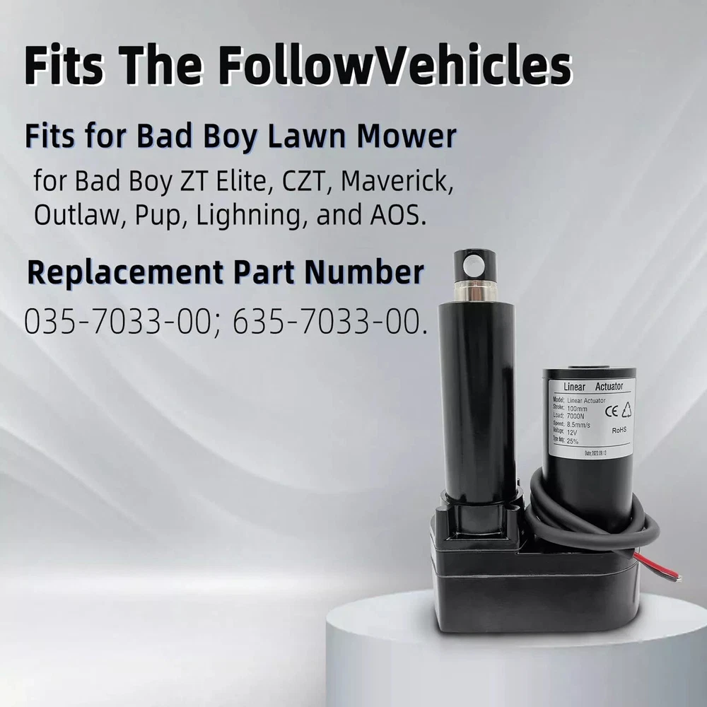 You may also like 12V LED 28cm Pre Wired LED Light Lamp Bulb For DIY Home Decoration Eight Colors 3.89 USD 3.68 USD Universal 12V 433MHz Electric Cloning Gate Garage Door Open Remote Control Fob 4.99 USD 3.68 USD 12V Mini Solenoid Electric Control Push-Pull Cabinet Drawer Door Electric Lock 4.89 USD 3.68 USD 10pcs Prank Funny Magic Trick Joke Special Lifelike Fake Cockroach Roach Toy 1.99 USD 3.68 USD 6pcs Guitar String Nails Solid Brass Bridge Pins Abalone Dot Inlay Acoustic d 10.99 USD Free shipping Replacement Treadmill Magnetic Sensor Speed Sensor for Running Machine Repairs 6.99 USD 3.68 USD Product Description Deck Lift Actuator Fits For Bad Boy Lawn Mower CZT 2011-2015 635-7033-00 Specification: Type: Deck Lift Actuator Condition: New Stroke: 100mm Load: 7000N Voltage: 12 V Color: Black Feature: 100% Brand New. Made of hight quality metal materials. Factory-spec and the perfect replacement part. Fitment: This Deck Lift Actuator Fit For Bad Boy Lawn Mower: For ZT 2007-2012 For ZT Elite 2013-2018 For Pup and Lightning 2008-2011 For CZT 2011-2015 For CZT Elite 2014-2015 For AOS 2007-2010 For Outlaw XP 2012-2018 For Maverick 2016-2018 Replace Part Number: 035-7033-00; 635-7033-00 NOTE: Please check the part number / model carefully before purchasing to insure fitment. Packing Included: 1Pc Deck Lift Actuator Shipping Contact Us We ship most of our orders within 24 hours, and may up to 48 hours from US Warehouse. In 2-5 working days, you will receive your items. Sometimes due to problems with our transportation company system, your shipping information may be delayed to update. We recommend that you try again after 3-4 days. If you still haven't checked the shipping information, you can contact us by ebay message. If you have any questions, our Customer Service staffs welcome you to email us. We strive to answer all questions and resolve any problems as quickly as possible. You can contact us 7*24, we will reply at the first time, and we will surely solve your problems. Note: 1.We try our best to reply to your emails as soon as possible, however, due to high volume of daily incoming emails and time zone difference, we may not be able to reply your emails immediately. Please allow 1 business days for us to response. If you do not receive any reply from us, please check your email ensuring your mailbox has not reached full size. 2.Due to some ISP SPAM filter settings, you may not be able to receive our replies; if you have problems receiving our emails, you may need to use a different email account to contact us. 3.Please give us the opportunity to resolve any problem. We understand the concerns and frustrations you might have, and will try our best to resolve the issues. Please email us before leaving any negative feedback or open any dispute on PayPal. 4.We care about our valued customers, and will always try to help you. So if you have any problems, please e-mail us immediately. Shipping We ship most of our orders within 24 hours, and may up to 48 hours from US Warehouse. In 2-5 working days, you will receive your items. Sometimes due to problems with our transportation company system, your shipping information may be delayed to update. We recommend that you try again after 3-4 days. If you still haven't checked the shipping information, you can contact us by ebay message. Contact Us If you have any questions, our Customer Service staffs welcome you to email us. We strive to answer all questions and resolve any problems as quickly as possible. You can contact us 7*24, we will reply at the first time, and we will surely solve your problems. Note: 1.We try our best to reply to your emails as soon as possible, however, due to high volume of daily incoming emails and time zone difference, we may not be able to reply your emails immediately. Please allow 1 business days for us to response. If you do not receive any reply from us, please check your email ensuring your mailbox has not reached full size. 2.Due to some ISP SPAM filter settings, you may not be able to receive our replies; if you have problems receiving our emails, you may need to use a different email account to contact us. 3.Please give us the opportunity to resolve any problem. We understand the concerns and frustrations you might have, and will try our best to resolve the issues. Please email us before leaving any negative feedback or open any dispute on PayPal. 4.We care about our valued customers, and will always try to help you. So if you have any problems, please e-mail us immediately. powered by LP-E8 Camera Power Supply Charger AC Adaptor For Canon T5i X6 EOS 650D 700D r 20.67 USD Free shipping Super Clamp Mount 360° Rotation Ball Head 1/4"-20 for DSLR Camera Tripod Monitor 9.99 USD 3.68 USD Silicone Soft Button Rubber Pad Conductive Pad For Nintendo Game Boy Advance GBA 5.99 USD 3.68 USD 4Pack 1:10 Metal Dog Bones Drive Shafts Wheel Axle For HSP RC 94111/108/170 6.99 USD 3.68 USD 1/8 1/10 RC Car Simulation Rooftop Net Roof Side Awning Tent For SCX10 TRX4 A 29.67 USD Free shipping Sapphire Flat Watch Glass Replacement Parts 32.7mm x 2.7mm For Casio MDV-106 23.67 USD Free shipping