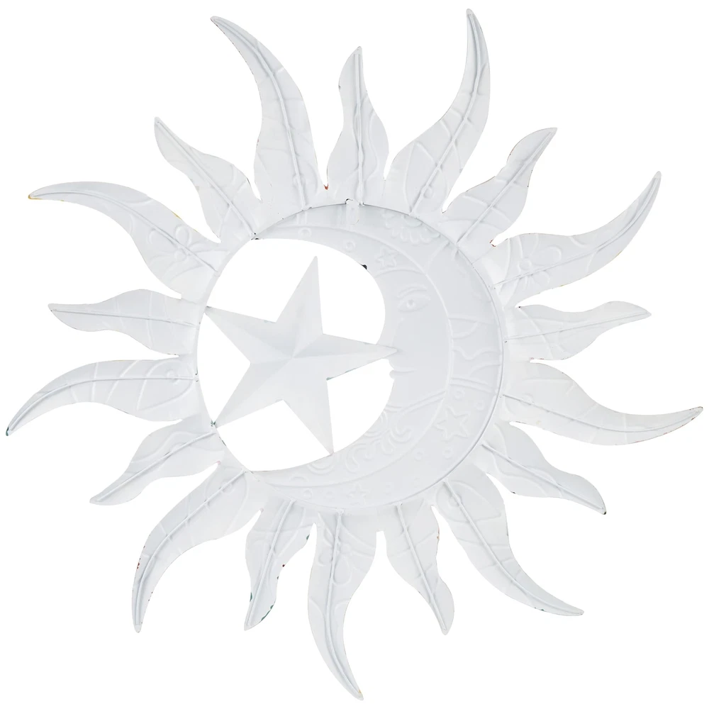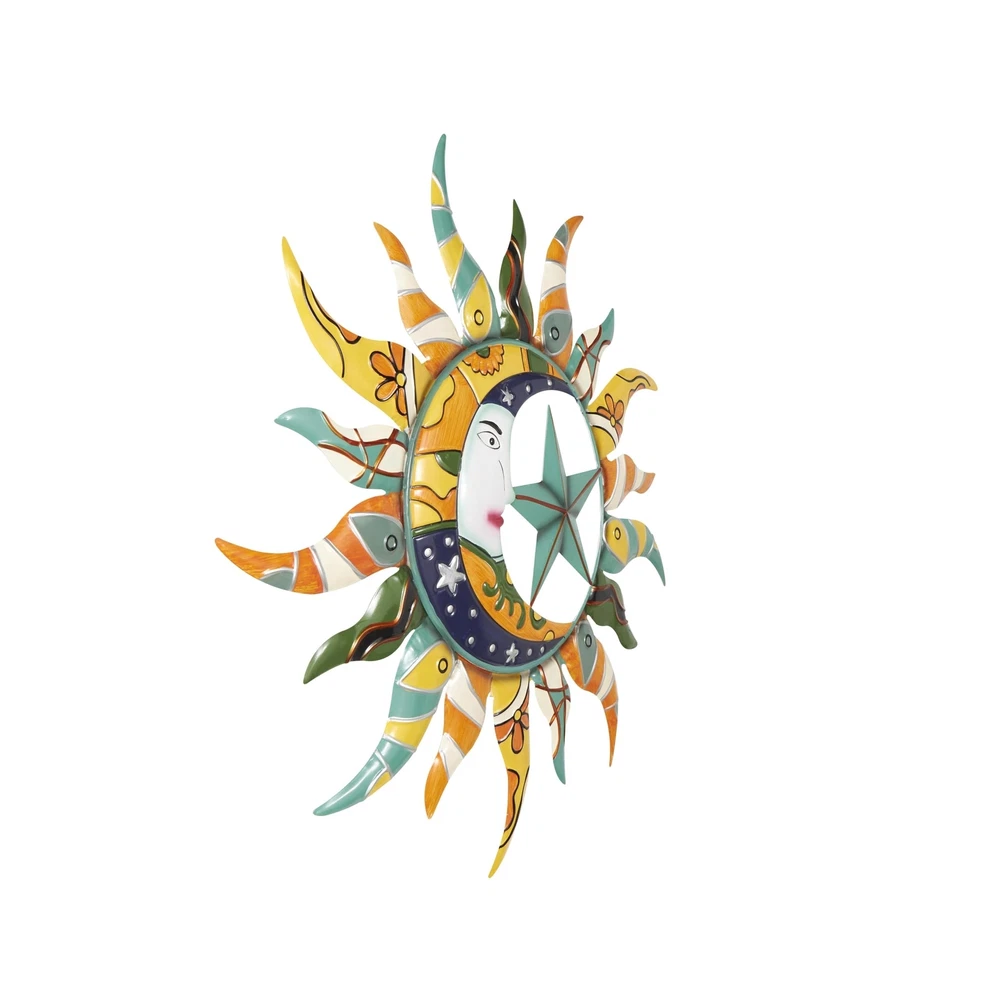 Deco 79 Metal Sun and Moon Home Wall Decor Indoor Outdoor Abstract Patterned Wall Sculpture with Teal and Orange Accents, Wall Art 36" x 2" x 36", Multi Colored Product Details Size: 35.5L" x 2W" Brand: Deco 79 MPN: 080055 UPC: 196094045352 EAN: 0196094045352 Product Dimensions: 35.5 x 2 x 0.2 inches Item Weight: 3 pounds Manufacturer: Deco 79 Country of Origin: China Item model number: 080055 Finish types: Polished Care instructions: Wipe clean with dry cloth Assembly required: No Number of pieces: 1 Warranty Description: No Warranty Batteries required: No ECLECTIC DECOR FOR WALL: Designed with a free-spirited charm where vibrant hues, eye-catching patterns, and whimsical accents transform your space and showcase your personality METAL WALL HOME DECOR: Crafted from durable iron metal, this multi-colored home wall decor is designed to withstand the test of time MULTI COLORED AND RED WALL ART FOR LIVING ROOM: Round decor for wall boasts an array of vibrant colors, including red, blue, green, yellow, gold, black, white, purple, orange, and silver with a polished finish that adds a touch of elegance SUN AND MOON ROUND ROOM WALL DECOR: Iron wall decor features a dynamic sunray sculpture at its center with an intriguing image of a crescent moon face and an edged star adding to its uniqueness LARGE SIZE WALL ROOM DECOR: The multi colored metal wall decor measures 35.50L x 2W x 35.50H inches, and weighs 3 lbs Shaped and molded from iron materials to form the sun design, this eclectic room wall decor showcases intricate craftsmanship. Polished multi-colored wall art for living room embraces an abstract groovy pattern shaped as a moon, star and sun giving it an artistic flair. Wipe clean with a dry cloth. Ideal for injecting color and happiness into your living room or bedroom, this sun and moon wall sculpture symbolizes abundance and brings joy to family and friends. This item ships in 1 carton. Iron wall decor makes a great gift for any occasion. Can be hung vertically using the keyholes; nails and screws not included. A great versatile decor for indoor or outdoor display but are not rust or weather resistant. This item ships fully assembled in one piece. This is a single multi colored wall sculptures. Eclectic style.