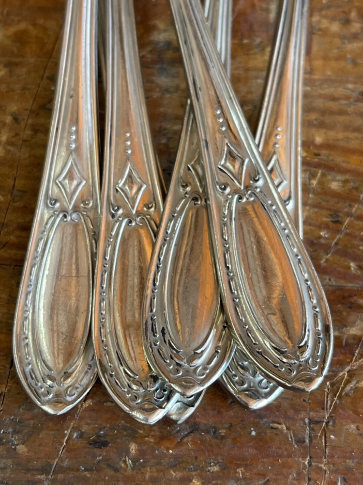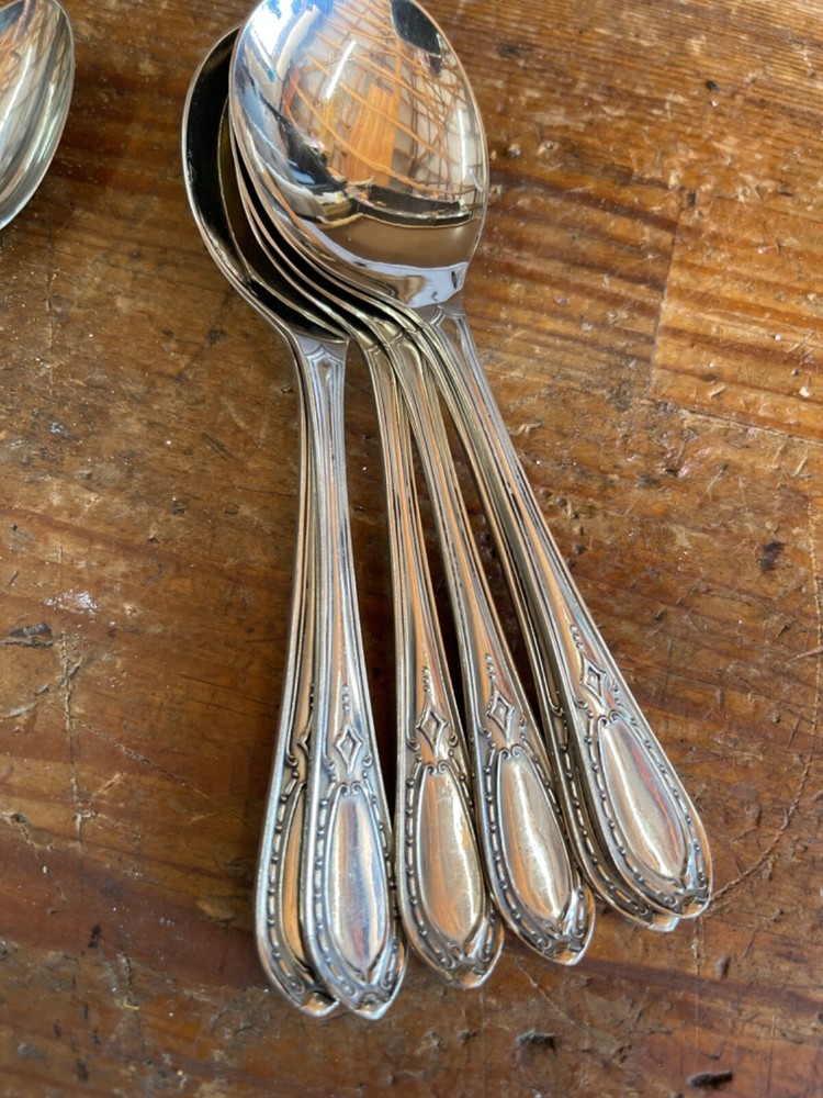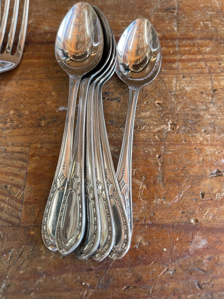 As photos and condition report 6 each of dessert forks and spoons, fruit spoons and coffee spoons, and 3 serving spoons All have nice pattern to handles and great lustre Thanks for looking