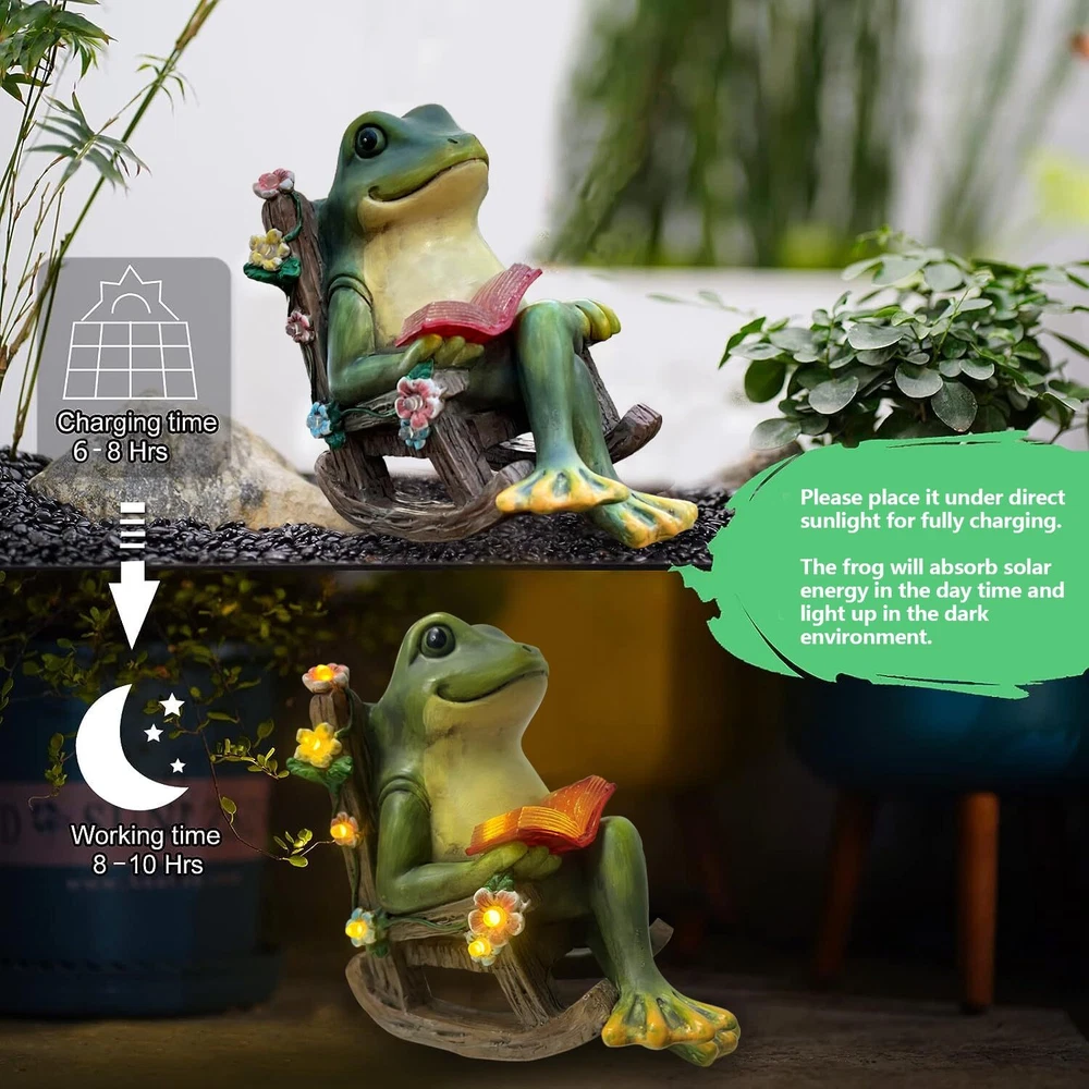 Solar Garden Statues Miniature Frog Figurine Christmas Decor with Succulents and 7 LED Lights Outdoor for Patio Yard Balcony Lawn - Unique Housewarming Birthday Gifts for Women Mom Family Friends Solar Garden Statues Miniature Frog Figurine Christmas Decor with Succulents and 7 LED Lights Outdoor for Patio Yard Balcony Lawn - Unique Housewarming Birthday Gifts for Women Mom Family Friends Free Shipping 24/7 Customer Service Premium Quality 【Easy to Operate】- This adorable solar frog garden decor can be fully charged in 6-8 hours during the daytime and automatically lights up at night for 8-10 hours, which is eco-friendly and energy efficient. For the first use, please remove the protective film of the solar panel, then keep the light switch in the “on ”state and make sure it is exposed to the sun. ( Light only can be charged and used when the switch turns "ON" .) 【Weather Resistant】- Crafted from IP67 waterproof resin materials, our solar powered frog light is fade resistant, light weight and durable, making the solar frog figurine suitable for both indoors and outdoors to withstand rain, hot sun and wind but without rusting, so that you can enjoy the captivating glow of the interesting frog lamp in bad weather conditions. 【Exquisite Design】- An attractive frog in a relaxed posture sits on a rocking chair decorated with colorful succulents, holding a shining red book to welcome the guests. The lovely reading frog with a friendly smile is eye-catching no matter where you place it. A hind leg touches the ground for stability of the frog sculpture. 7 soft warm yellow LED lights make the frog glow in dark environment, creating a cozy, fairy, romantic and serene atmosphere to your space. 【Awesome Decorative Gifts】- This super cute frog statue is a nice addition to your garden, patio, yard, flower bed, plant stand or camping.The frog represents wisdom, good luck and prosperity, also a perfect gift for your parents, daughters, grandparents, kids, family and friends on mother’s day, father’s day, birthday, Christmas, Thanksgiving, housewarming or any celebration to express your appreciation and best wishes! Especially for children who like little frogs! 【Thoughtful Service】- Notice: Measuring 3.93*2.75*4.05 inches, our outdoor decor frog figurines are not large-sized. Please make sure you have checked the dimensions before purchasing. We are committed to offering you well made solar lights and attach great important to your shopping experience. If you have any issue about our frog statue, just contact us, we will try our best to help you resolve the problem. Shipping Information We offer FREE shipping on all orders! We ship within three business days of payment, usually sooner. We use a selection of shipping services such as UPS, FedEx, USPS, etc. We only ship to the lower 48 states, no APO/FPO addresses or PO Boxes allowed. Return Policy You can return a product for up to 30 days from the date you purchased it. Any product you return must be in the same condition you received it and in the original packaging. Please keep the receipt. Feedback Customer satisfaction is our top priority. If you have any problem with your order, contact us immediately. We respond to all inquiries within 24 hours and will do our utmost to ensure you are fully satisfied with your shopping experience. Contact Us If you have any queries, please contact us via eBay. Our dedicated customer support team prioritizes your satisfaction and guarantees a response within 24 hours on weekdays. Discover Dobby's Deals! Thank you for choosing Dobby for your shopping needs. Explore more premium items in Dobby's Store today!