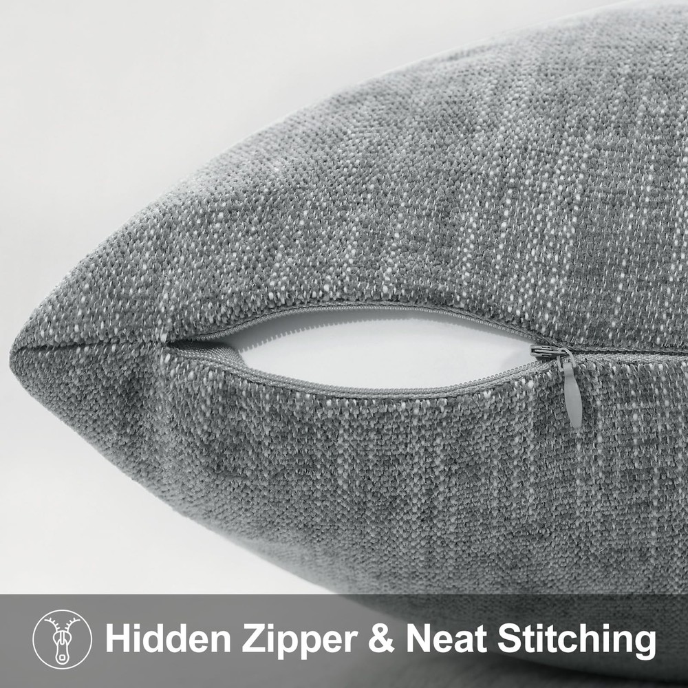 Solid Color Chenille throw Pillow Covers, textured, comfortable, and aesthetically pleasing, creating a cozy and warm atmosphere for your home. Crafted from high-quality chenille fabric, these throw pillow covers are thick, sturdy, and resistant to fading and wrinkles, making them perfect for home decor. The unique chenille fabric, adorned with white interwoven lines, adds texture to the solid-colored chenille pillow covers, simple yet stylish, matched with any style of home decor. Our throw pillow covers are made from premium chenille fabric, providing a thick and sturdy feel. The decorative pillow covers do not fade easily and are resistant to wrinkles, making them ideal for home decor. The distinctive chenille fabric features white interwoven lines, adding texture to the solid-colored couch pillow covers, which is a simple, atmospheric, and stylish design. Both sides of the pillow cover are made from sturdy chenille fabric, ensuring longevity and comfort. The zipper is discreetly designed on the side, ensuring a seamless appearance during use. The zipper matches the color of the pillow covers, providing a coordinated and visually pleasing overall look. Available in 7 sizes and a variety of colors, these decorative pillow covers allow you to switch up your decor with the seasons. For example, use green pillow covers in spring for a vibrant feel, blue pillow covers in summer for a refreshing look, rust pillow covers in fall for added warmth, and classic red pillow covers for Christmas. With this farmhouse pillow covers, your home can exude a distinctive charm throughout the year, making it unique in every season. These throw pillow covers are machine washable for convenience. To extend the life of the pillow covers, we recommend gentle hand washing. Avoid ironing. Thick & Textured: The couch pillow covers are well made from thick and high-quality chenille, and different threads run through the pillow covers adding a textured feel Package Includes: Grey throw pillow covers 20x20 set of 2, pillow covers only, inserts not included Hidden Zipper: The tiny zipper of the spring pillow covers is invisible and works smoothly, so you neither see nor feel them while using them, which gives the pillow covers a more elegant look Wide Usage: Our throw pillow covers for couch rich in vibrant colors and many sizes are versatile, which is a good way to spruce up your pillows, a perfect accent for your living room, and relax your mind and body in the bedroom, office, and outdoor Care Instruction: The chenille pillow covers are easy to care for. Machine washable in gentle mode. Tumble Dry Low. Do Not Iron