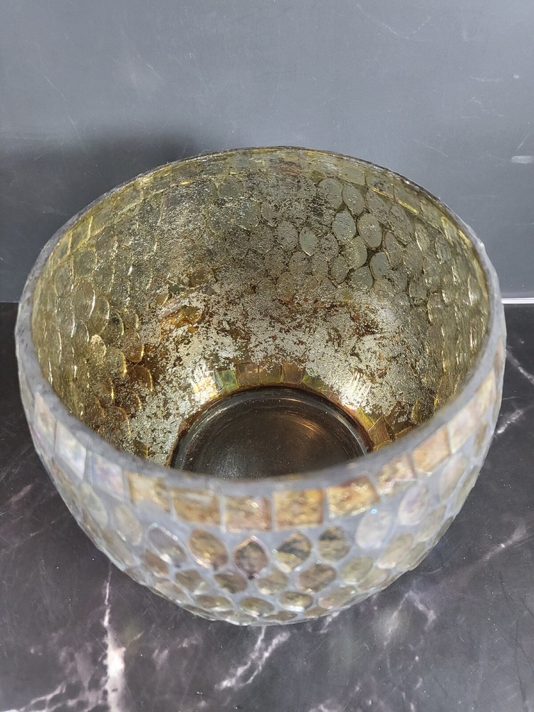 This decorative bowl is perfect for adding a touch of elegance to any room. Its contemporary design features reflective glass squares that create a stunning visual effect. Made of high-quality glass, this bowl is suitable for use as a candle holder or display tray. The bowl is versatile and can be used to hold candles or as a decorative piece to enhance the beauty of your home decor. Its shape and features make it suitable for display in any room, adding a touch of sophistication to your living space.