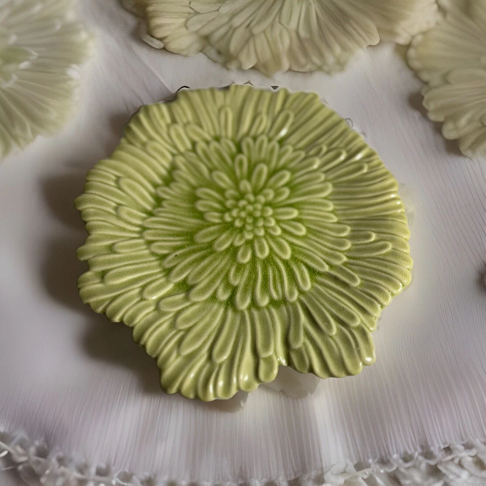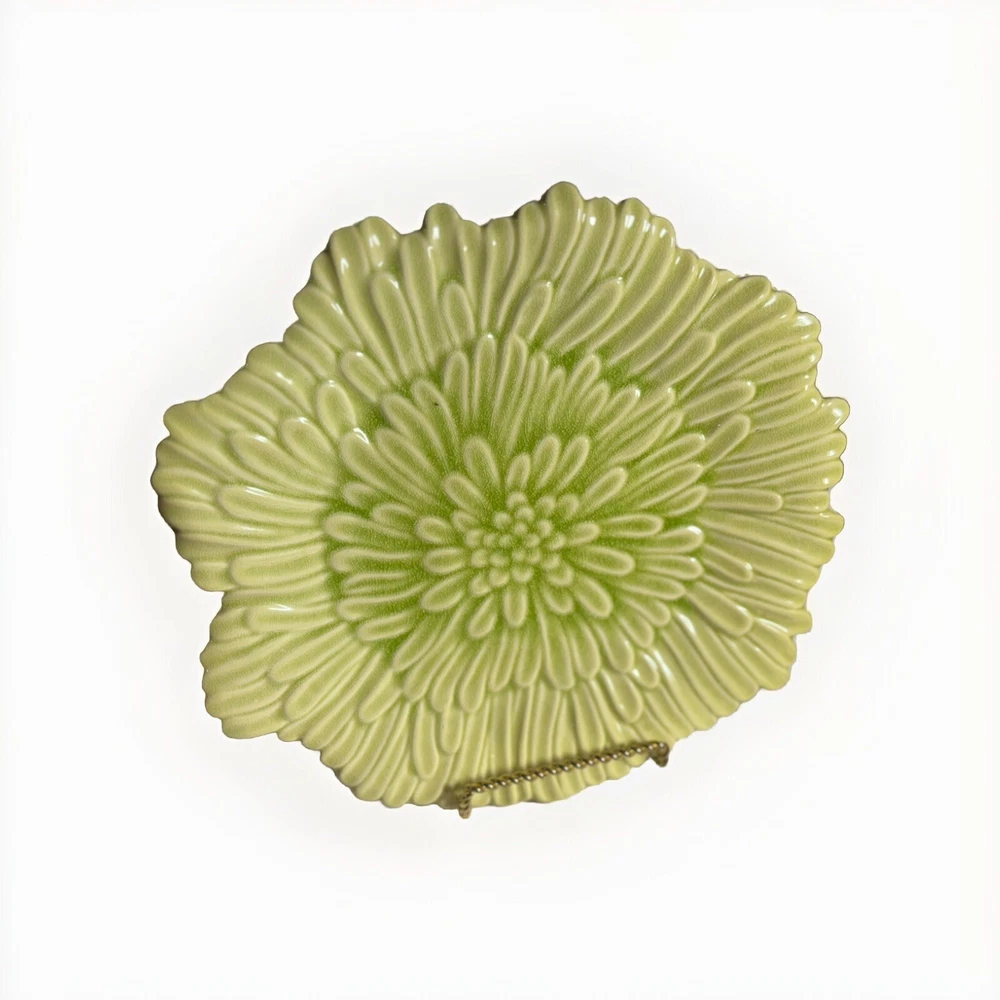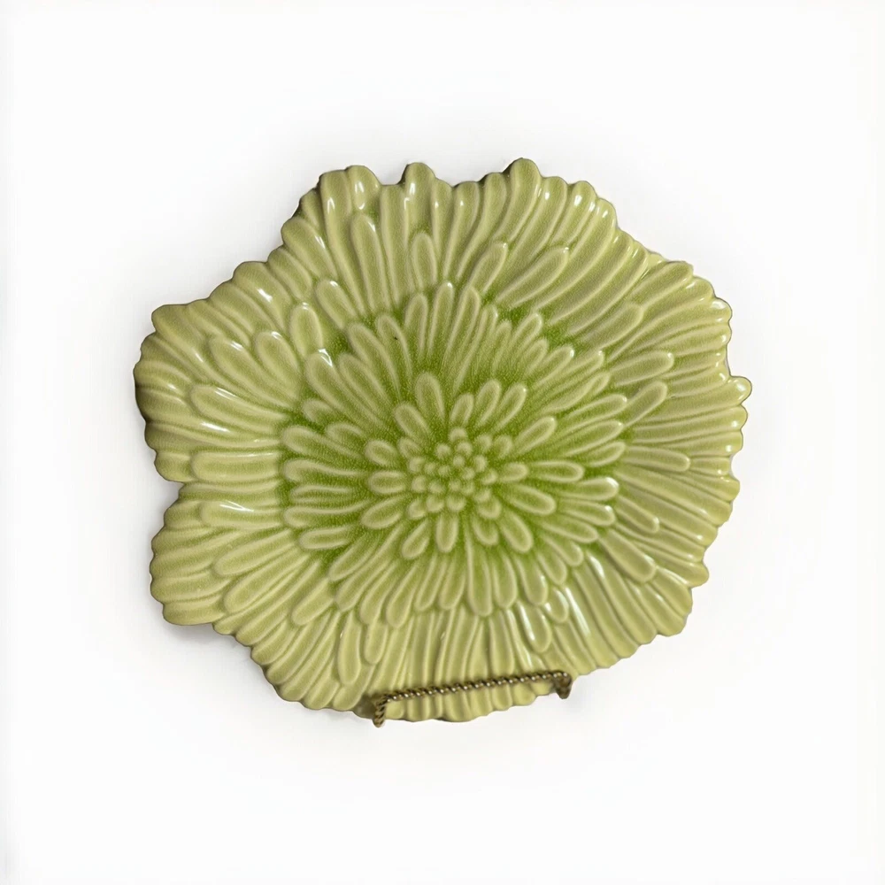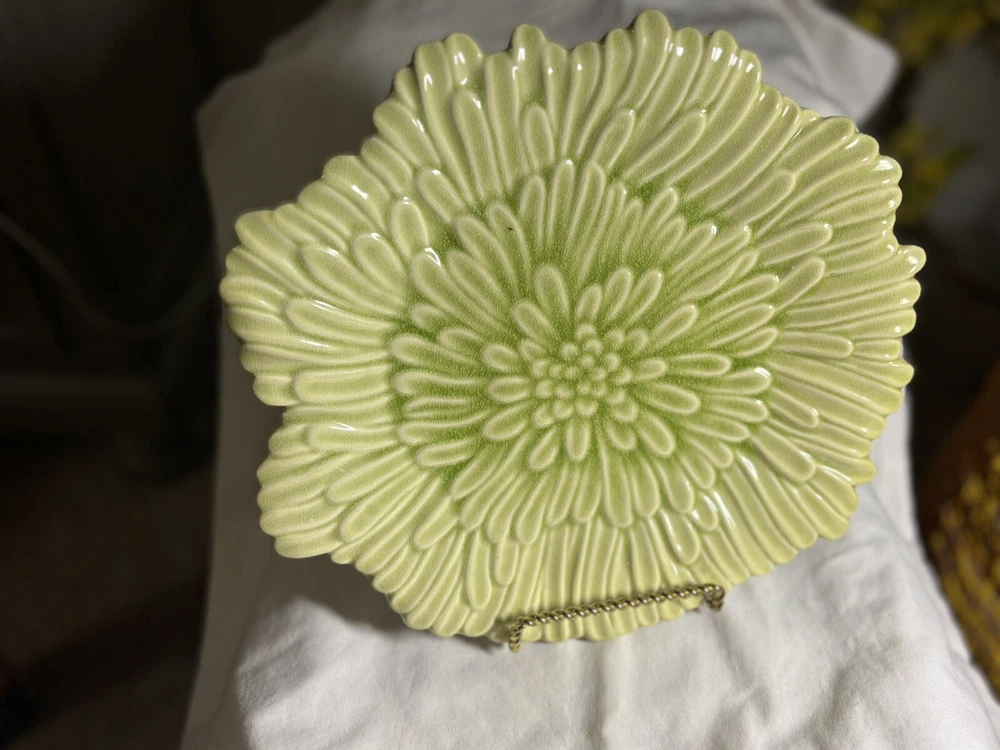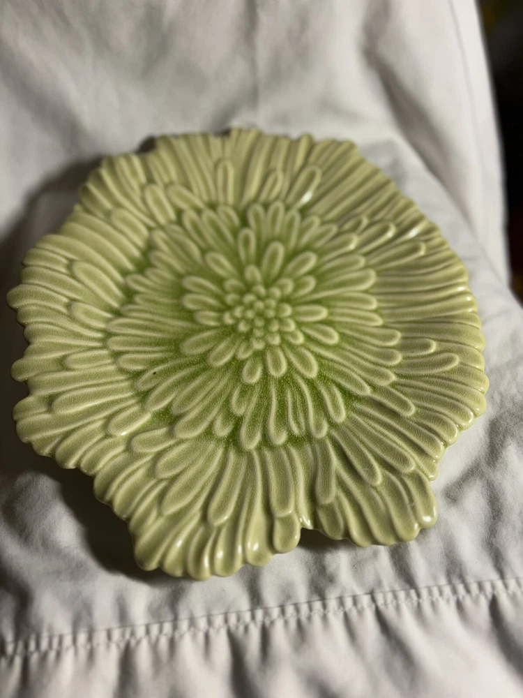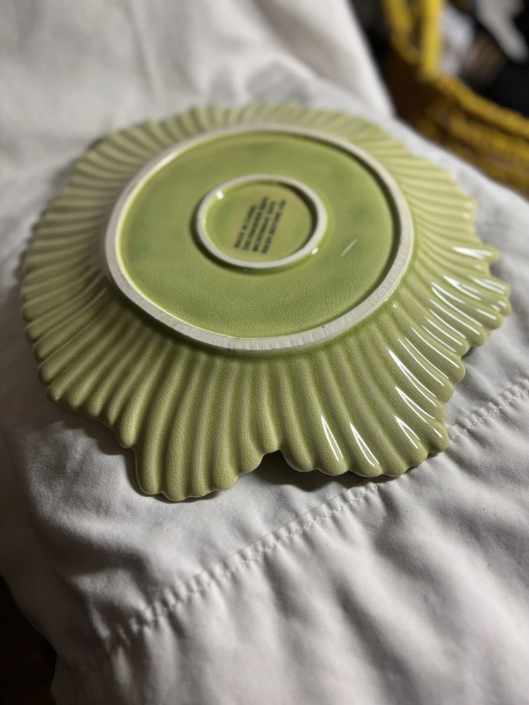 Enhance your dining experience with this beautiful green ceramic serving platter. This 12-inch abstract shaped platter features an all-over leaves theme and a glossy finish. Perfect for all occasions, this contemporary style platter is a limited edition piece and will add a touch of elegance to your table setting. Crafted in China, this platter is a reproduction of a vintage piece and weighs 3 lbs. It is hand wash only and will make a great addition to your home decor collection. This set includes one platter and is the perfect choice for those who love unique and one-of-a-kind pieces. Returns accepted within 30 days; buyer pays return shipping.