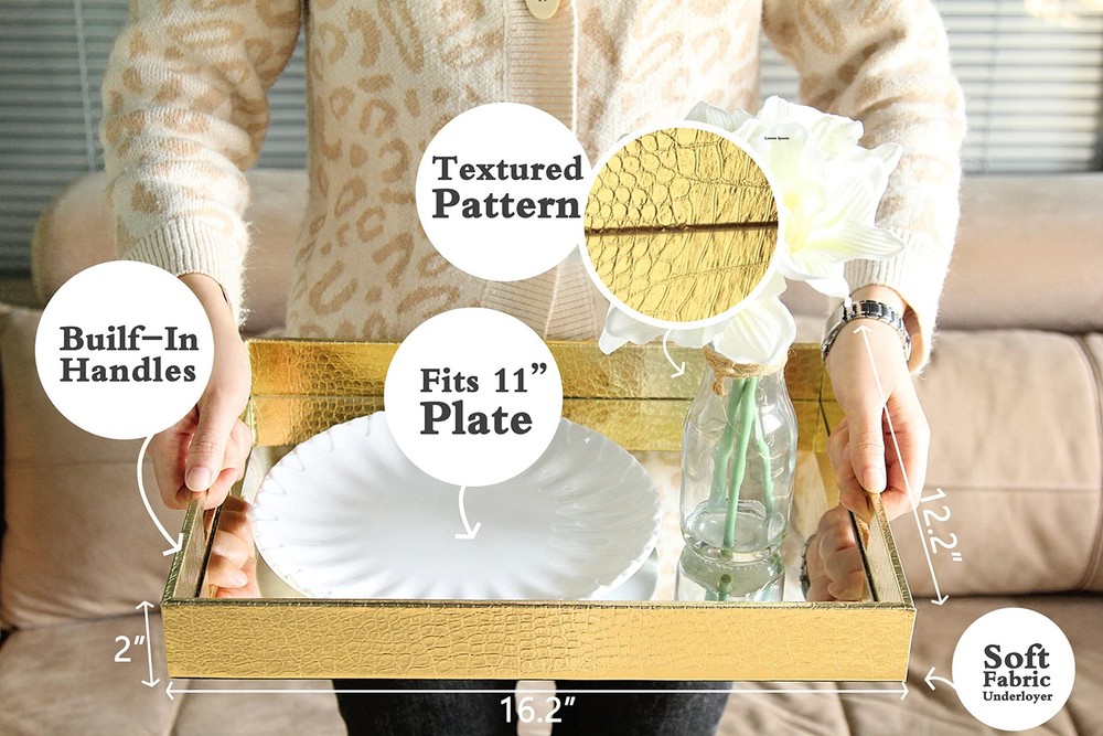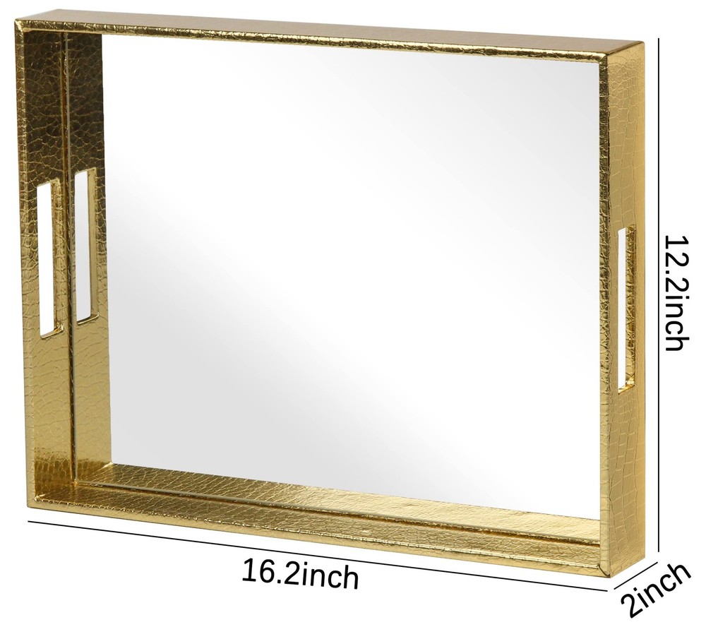 Store description: is a company specializing in the production of small household products. Our products are all handmade, paying attention to every detail, following the fashion trend, creating a more convenient and comfortable living environment for customers, which is our constant pursuit. Product features: Wake up in the morning and see a clean dressing table.A good mood starts with acceptance.This vanity tray is suitable for various occasions and scenes, making the living space more beautiful, warm and comfortable.As a multi-functional storage tray, it can store key,coins,jewelry,candies etc.Throwing your keys in it as soon as you enter the door and using it to organize your dresser and nightstand, making your home more lively, fashionable and orderly. DURABLE: The Large ottoman tray is made of high quality artificial leather, which is waterproof and durable,the strong wooden structure of the interior ensures its load-bearing capacity MULTIFUNCTIONAL: Beautiful decorative mirror tray can hold jewelry, makeups, skin care products, beauty care products, coffee cups, small flower pots, mobile phones, id CARDS, keys,wallets, change, candies, etc, which will make the messy room become orderly PRACTICAL: Perfect for use as an accent on your counter-top, dresser, vanity, or table in your living room, bedroom and kitchen.The bottom mirror grinding edge design makes the tray safer and easier to clean STYLISH: Elegant gold and silver to choose from, clear leather grain highlights fashion, beautiful interior trinkets SIZE: 16.2"*12.2"*2.0" specification, size is appropriate for you to put on the bedside, coffee table and other places you need to store