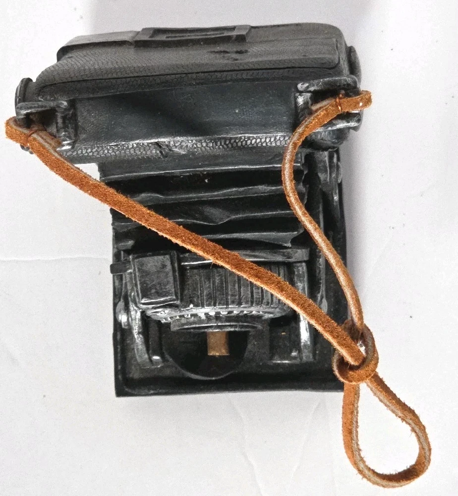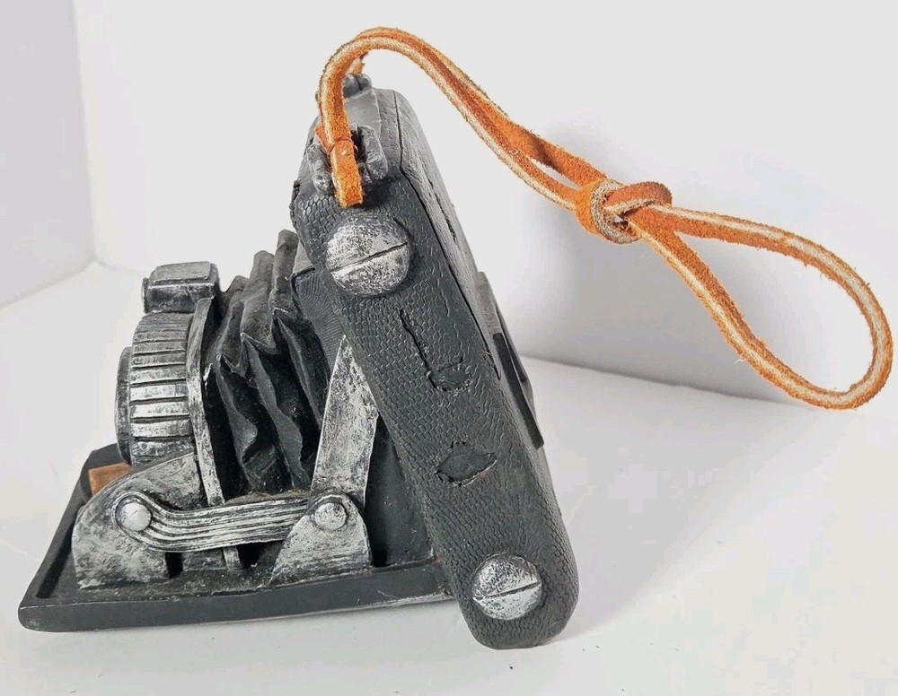 This decorative old fashioned folding camera replica is made of resin with a leather strap, standing at approximately 5 inches tall. Its classic design and black color give it a timeless appeal, perfect for adding a touch of nostalgia to any collection or decor. This unique piece combines the old-fashioned style with modern materials, making it a versatile and eye-catching addition to any space. Made in China, this one-of-a-kind item is sure to stand out in any collection of decorative items.