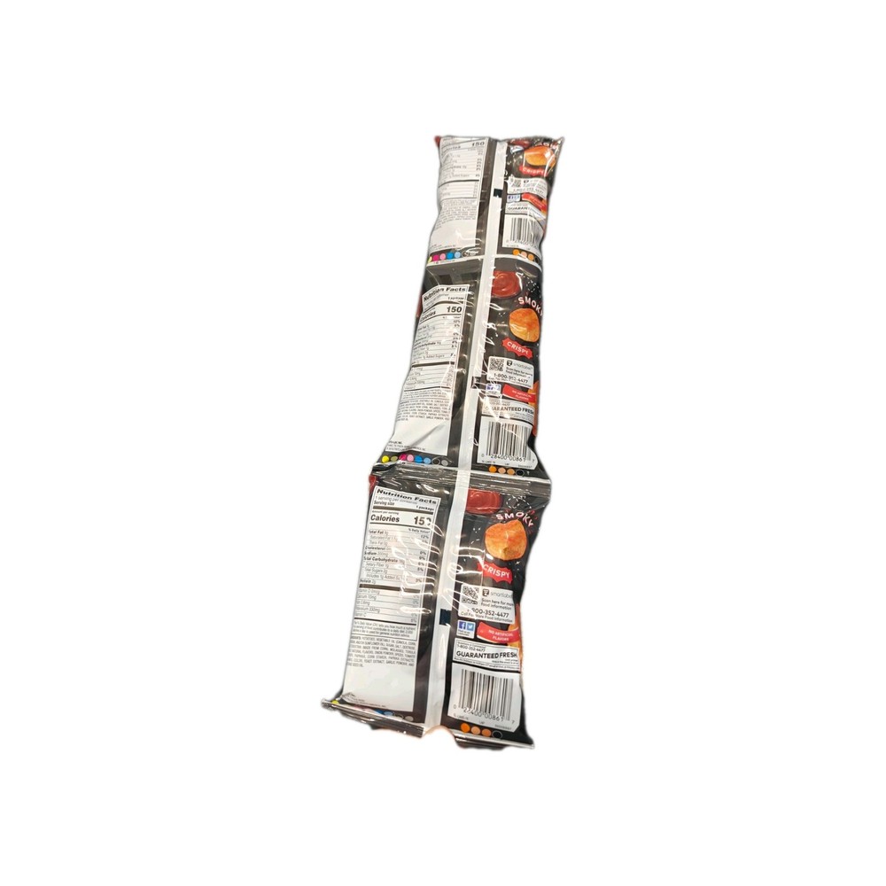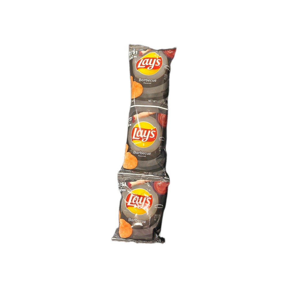 The product is three bags of Lays BBQ Potato Chips that are mispackaged or defective in some way. Made in the United States, these black chips are an original product under the food and beverage theme. Despite the issues with the packaging, these chips are likely still delicious and can be enjoyed as a tasty snack. Perfect for collectors of food and beverage ads or those looking for a special deal on Lays chips.