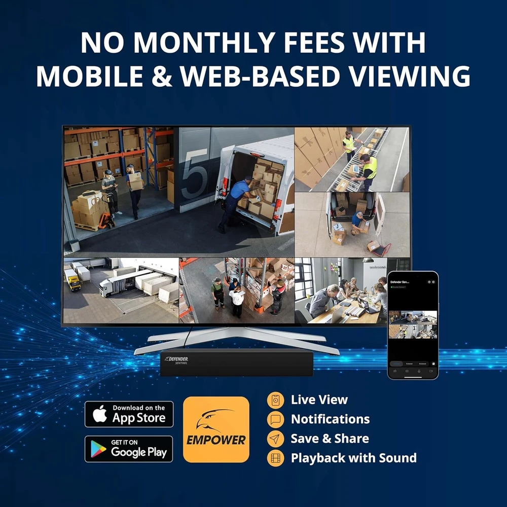 Experience the gold standard in home security with the Sentinel 4K NVR Security System from Defender. This state-of-the-art home security system integrates seamlessly into your home, providing round-the-clock surveillance. The Sentinel includes a 6 camera security system, ensuring comprehensive coverage of your property. Each camera system for house is meticulously designed for both indoor and outdoor use, making it a versatile outdoor security camera system. The wired security camera system guarantees uninterrupted, reliable surveillance, a feature that sets the Sentinel apart from other security camera systems. The security camera system outdoor components are robust and weather-resistant, providing clear images in various weather conditions. The Sentinel home security camera system also includes a wireless CCTV camera security system, offering flexibility and easy installation. The monitoring camera system allows real-time viewing, and the surveillance DVR kits enable secure footage recording. Whether you need a closed circuit camera system or a CCTV surveillance camera system, the Sentinel 4K NVR Security System is your best choice. It’s more than just a security system with cameras; it’s a complete surveillance system that offers peace of mind. AI-POWERED SMART HUMAN DETECTION: Sentinel can detect human movement and alert you immediately, protecting your home or business while minimizing false alarms. FLASHING BLUE-RED LIGHT DETERRENCE: Criminal deterrence is activated immediately with high-intensity blue-red flashing lights, a powerful LED spotlight. 4K CLEARVU WITH COLOR NIGHT VISION: Breathtaking 4K Ultra HD with vibrant color night vision from up to 100ft. away with laser sharp image enhancement and LED spotlight illumination. PREMIUM QUALITY, DIY SETUP: Professional grade metal-encased NVR with IP66 rated cameras that are designed to withstand extreme weather-conditions. NO MONTHLY FEES & LIMITLESS RECORDING: Your security cockpit with mobile & web-based viewing/controls. Expandable bank-level encrypted local storage utilizes AI SMART encoding storage optimization. WHAT'S IN THE BOX: 2x SMART AI 4K PoE IP Cameras • 1x 8ch NVR with 1TB HDD • 2x 60ft Ethernet Cable • 1x HDMI Cable • 1x 6.5ft Ethernet Cable • 1x NVR Power Supply • 1x USB Mouse • 2x Camera Mounting Hardware • 2x RJ45 Waterproof Cap • 2x Drilling Template • 1x Quick Start Guide • 1x Window Warning Sticker • 1x Warranty Registration Insert • 2 Year Warranty • Lifetime Support Buyer pays actual USPS shipping cost.