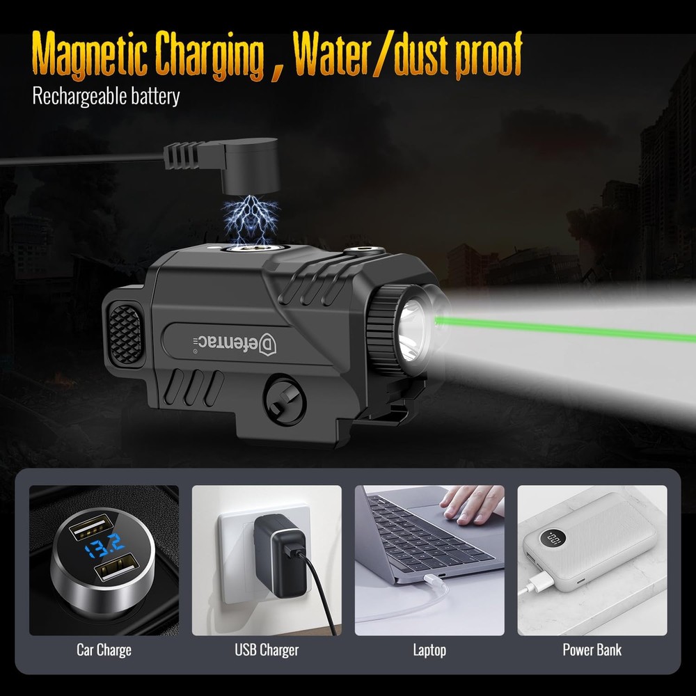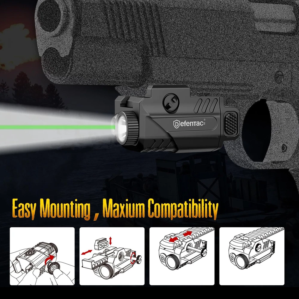 Defentac Combo is Compatible with P365/ X/XL (No Green Laser Light Product Details Special Feature: Adjustable Rail, Lightweight, Low Profile, Mountable, Adjustable Tactical Modes, Magnetic Recharging. Color: Green Laser Light Combo Power Source: Battery Powered Light Source Type: LED Material: Aluminum, Polymer White Brightness: 450 Lumens Included Components: Charging Cable, Batteries included Product Dimensions: 2.15"D x 1.2"W x 1.22"H Light Path Distance: 1E+2 Feet Battery Cell Composition: Lithium Item Weight: 3.84 ounces Number of Batteries: 1 Lithium Polymer batteries required. (included) Brand: DEFENTAC Brightness: 450 Lumen Battery Description: Lithium Runtime: 1 hour Style: For Standard Pic-Rail Only Finish Type: Finished Mounting Type: Picatinny Rail Mount Recommended Uses For Product: Outdoor Manufacturer: DEFENTAC Item Package Dimensions L x W x H: 3.5 x 2.99 x 1.73 inches Package Weight: 0.11 Kilograms Item Dimensions LxWxH: 2.15 x 1.2 x 1.22 inches Brand Name: DEFENTAC Model Name: DF-1061 Number of Items: 1 Part Number: DF-1061 Sport Type: Hunting Special Feature: Adjustable Rail, Lightweight, Low Profile, Mountable, Adjustable Tactical Modes, Magnetic Recharging. Adjustable Rail, Lightweight, Low Profile, Mountable, Adjustable Tactical Modes, Magnetic Recharging.Adjustable Rail, Lightweight, Low Profile, Mountable, Adjustable Tactical Modes, Magnetic Recharging. See more Color: Green Laser Light Combo Power Source: Battery Powered Light Source Type: LED Material: Aluminum, Polymer Sliding Rail - the gun light offers you the maximum location adjustment range on the 21MM rail. 21MM Rail with Cross Slot Required- As long as your pistol has a 21MM width rail with cross slot, then the pistol flashlight fits your pistol. Bright & Adjustable Green Beam - the output of green beam is less than 5mW, Class IIIA. The Green Beam is adjustable to keep zero with included Elevation and Windage Allen Key. Multiple Tactical Modes - offers Steady/Strobe Tactical Flashlight; Green Beam only; Steady/Strobe Flashlight+ Green Beam. Rechargeable & Shockproof - The weapon light with green beam is shockproof. And it is powered by a built-in rechargeable battery. A full charge takes about 2 hours by magnetic USB cable. The full battery support 4.5hr/ green beam; 45 min/ flashlight & green beam; 60 min/ Flashlight only. Red light indicating for low power. ✅ Defentac 350 Lumens Combo is Non-universal,three models (DF-51/52/1061) fit for different style only. The output is less than 5mW, the class is IIIA.