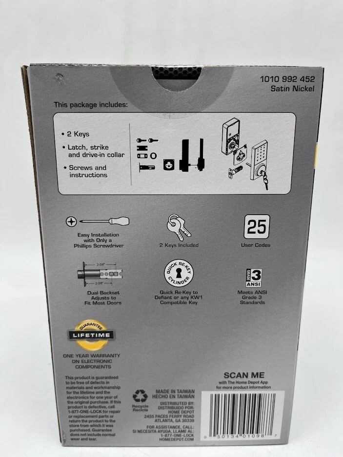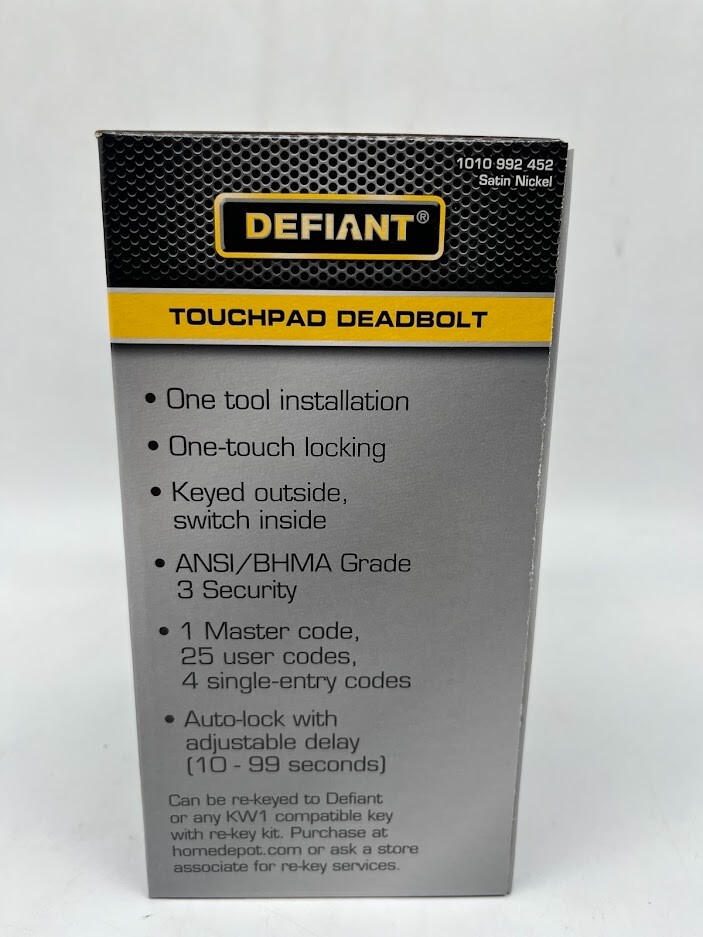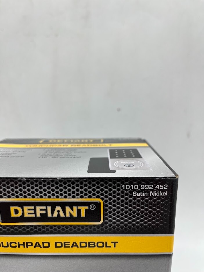 Upgrade your home security with the Defiant Electronic Touchpad Deadbolt , designed for keyless entry and enhanced protection . This easy-to-use deadbolt offers convenience, reliability, and peace of mind , eliminating the need for traditional keys while allowing customizable access codes. Key Features: Keyless Entry Technology Secure access with personalized user codes No more worries about lost or misplaced keys Easy DIY Installation No hard wiring required – installs in minutes with basic tools Enhanced Security & Durability Anti-saw rod provides extra protection against forced entry ANSI/BHMA Grade 3 security rating for reliable home defense Versatile Applications Perfect for entry doors, garages, home offices, computer rooms, and utility rooms With a sleek design and user-friendly operation , the Defiant Electronic Touchpad Deadbolt is a smart and secure solution for any home. We take great care to inspect all items and ensure they are accurately described. Should you have any issues with your purchase, please let us know immediately. We are committed to resolving any concerns promptly and to your satisfaction. Our small business truly appreciates your patronage.